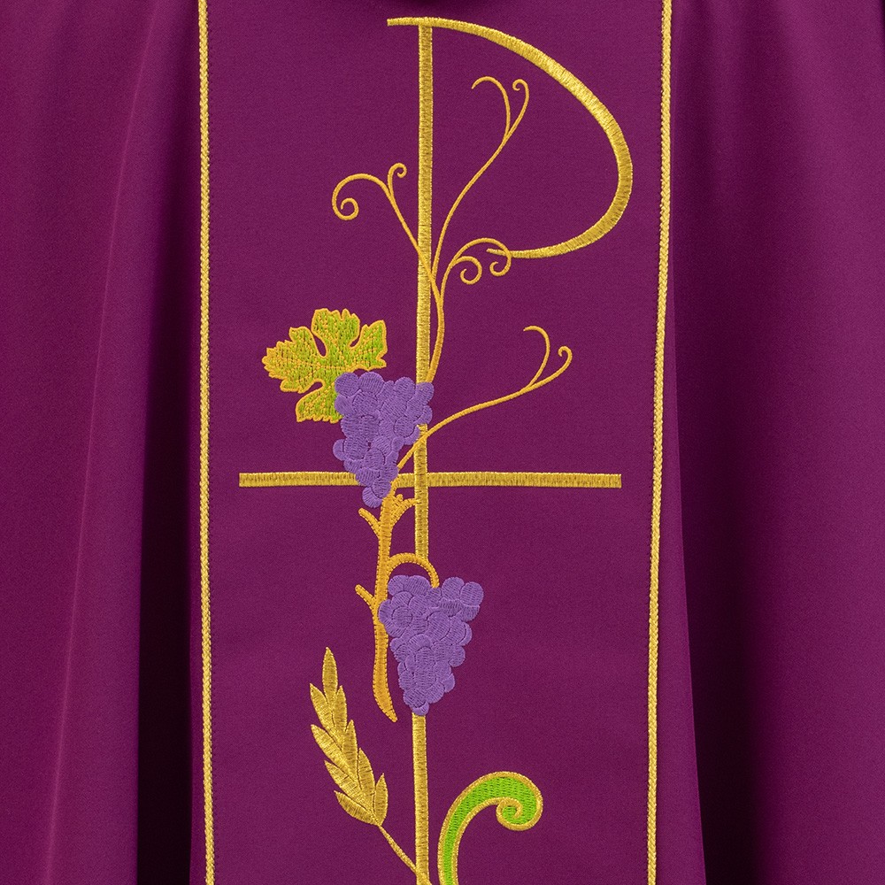 Casula per sacerdote color morello in poliestere, presenta nella parte centrale un fine e delicato ricamo sia sul fronte che sul retro.