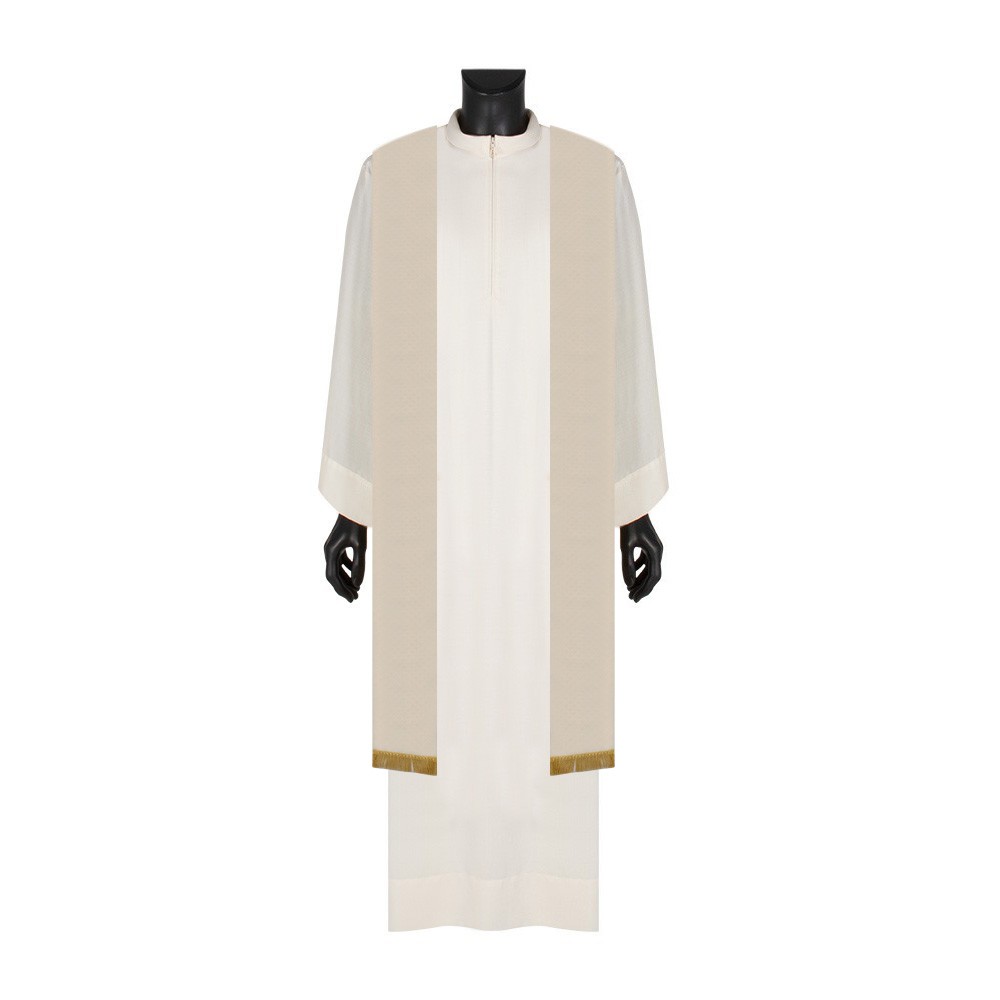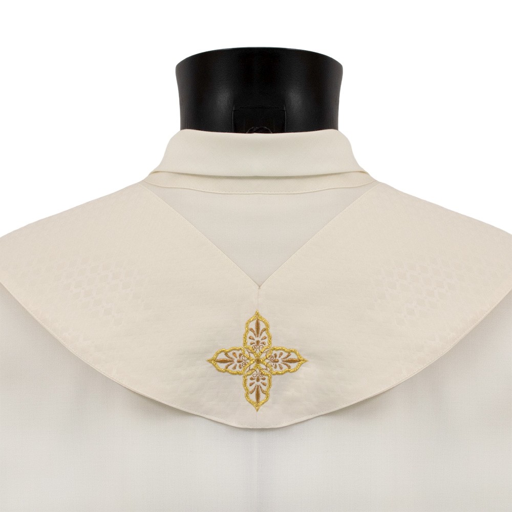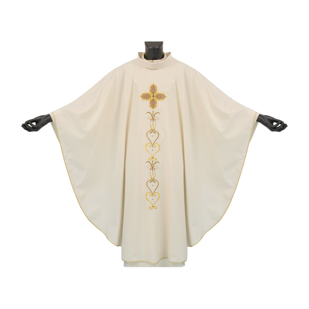 La casula è confezionata in tessuto misto con croci ricamate oro. Modello con collo ad anello e stola abbinata inclusa.
