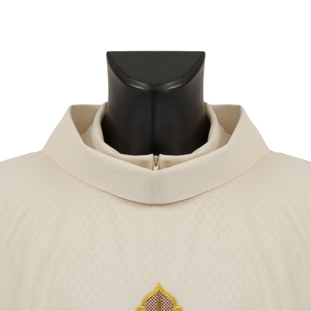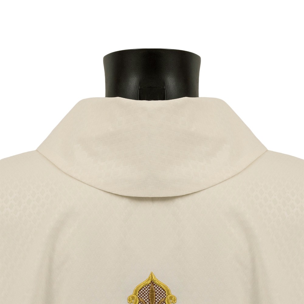 Casula liturgica con collo ad anello e ricamo diretto sul mantello.