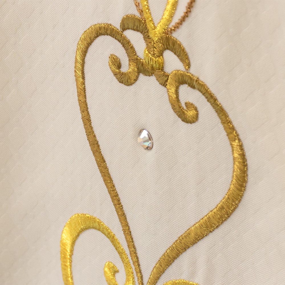 Realizzata in tessuto stampato in leggerissimo poliestere, arricchita con ricami color oro effettuati accuratamente a macchina e impreziosita da piccole pietre colorate in tinta con la casula.