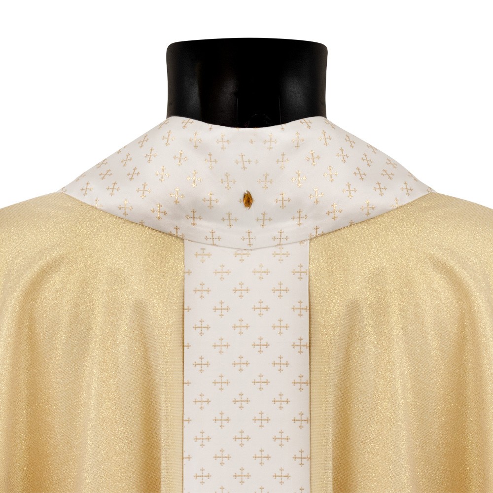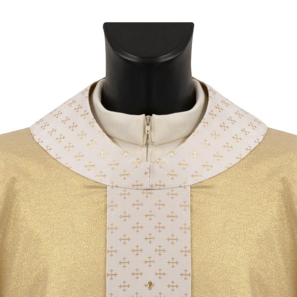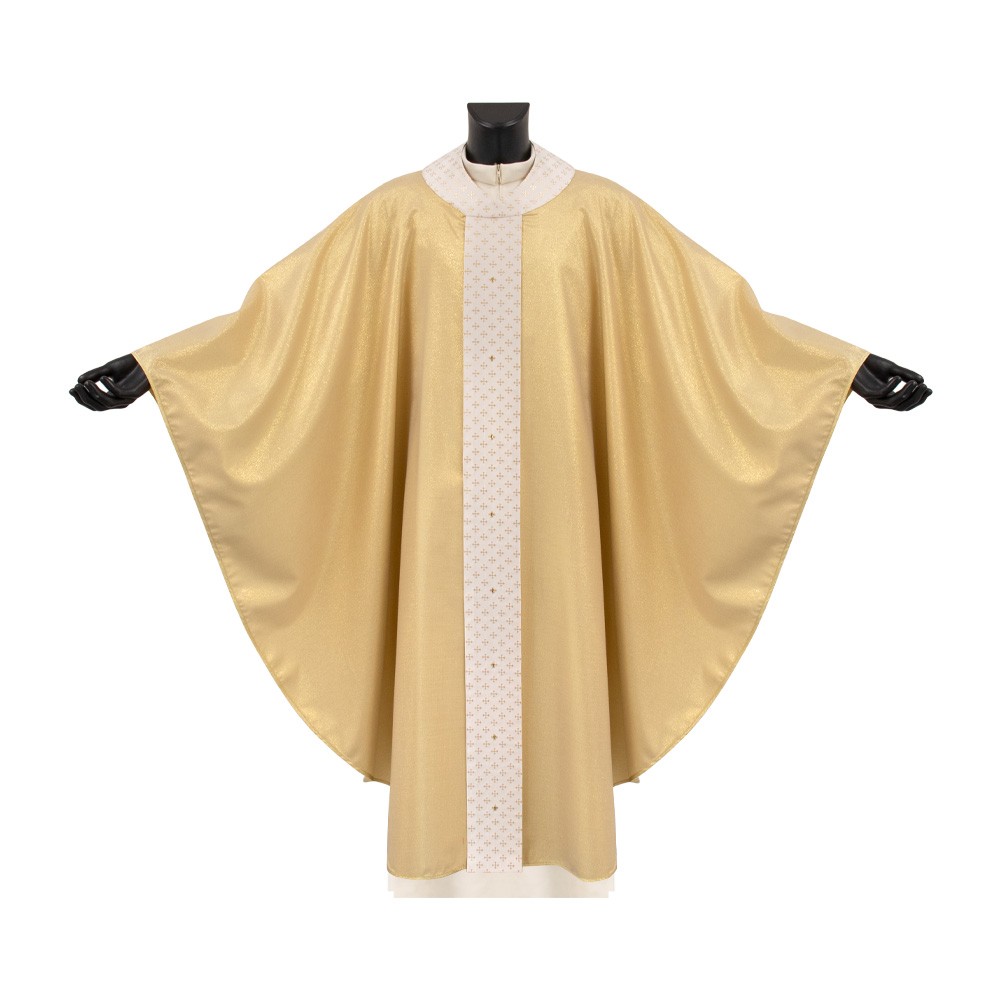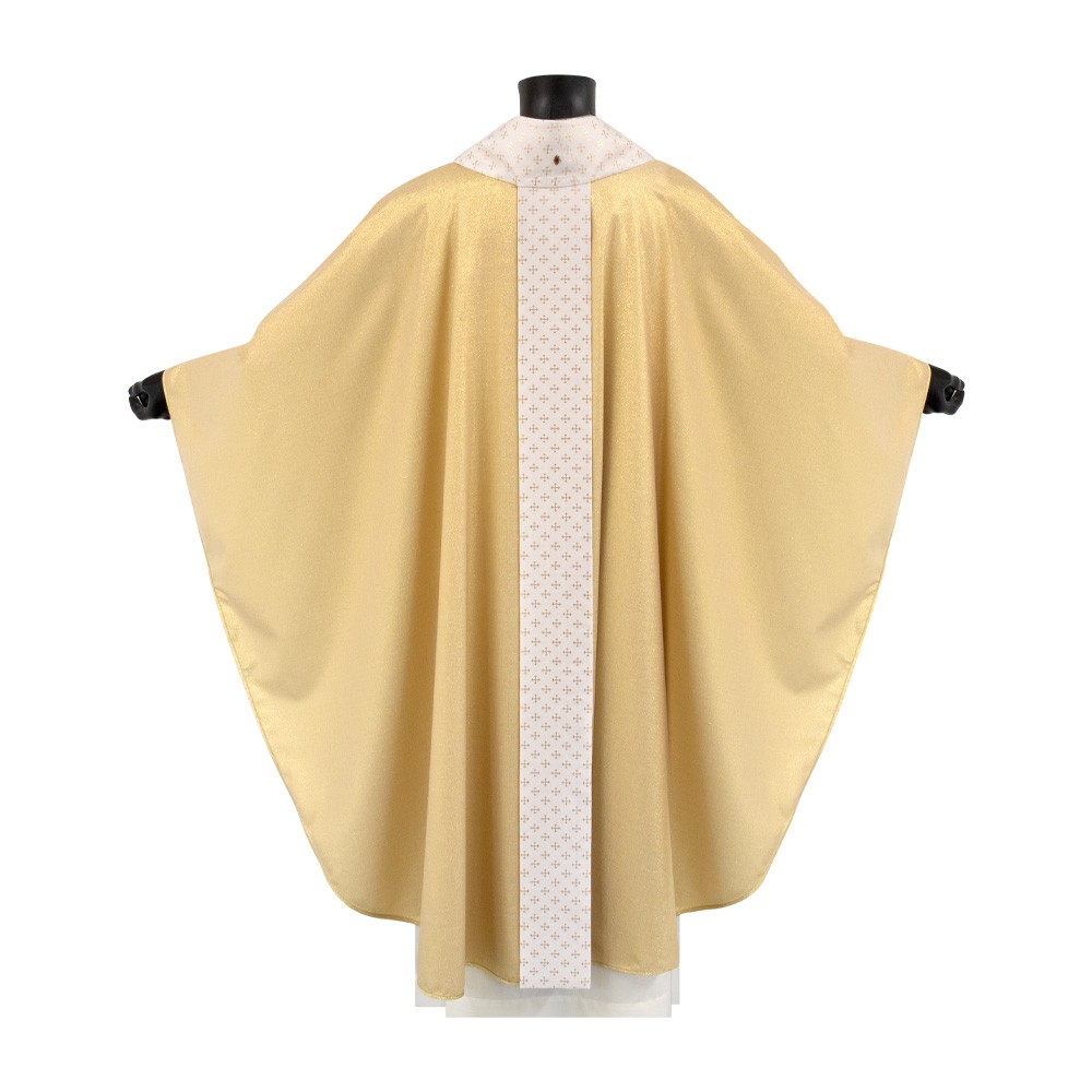 Casula sacerdotale con manto oro in elegante tessuto misto lana, seta e lurex.