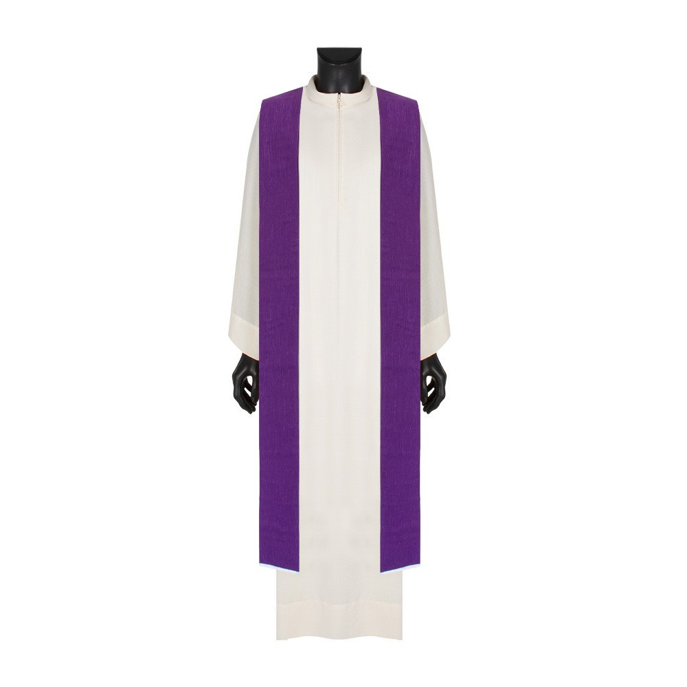 La casula è interamente rifinita con sbieco perimetrale color argento ed è corredata di stola abbinata.