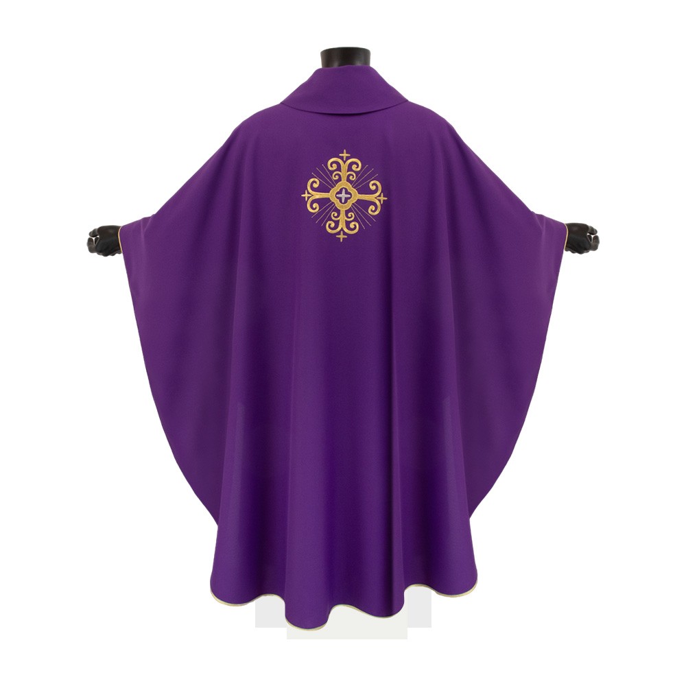 La casula è confezionata in tessuto misto con croci ricamate oro. Modello con collo ad anello e stola abbinata inclusa.