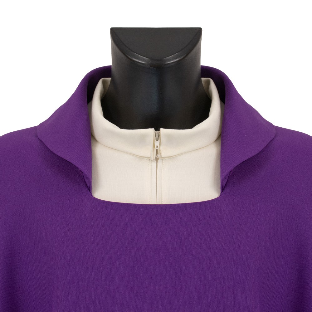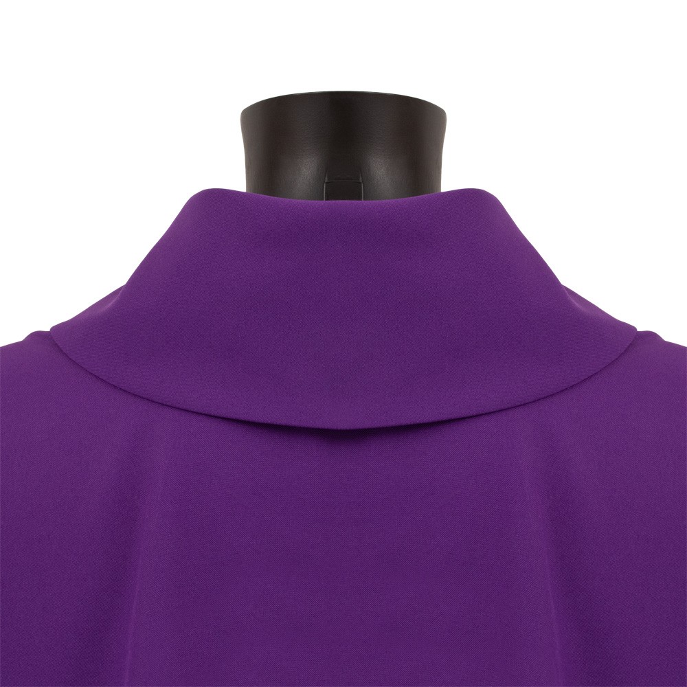 Casula liturgica viola con collo aperto confezionata in leggerissimo tessuto 100% poliestere.
