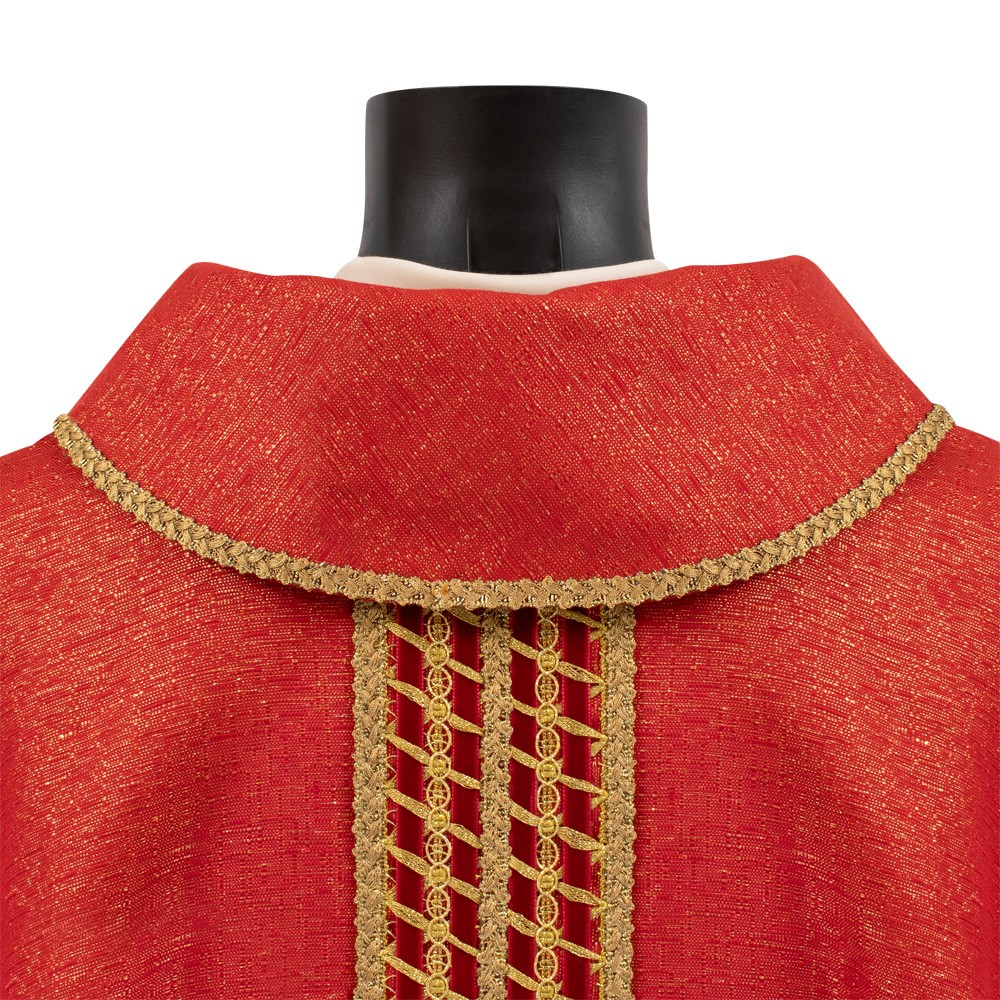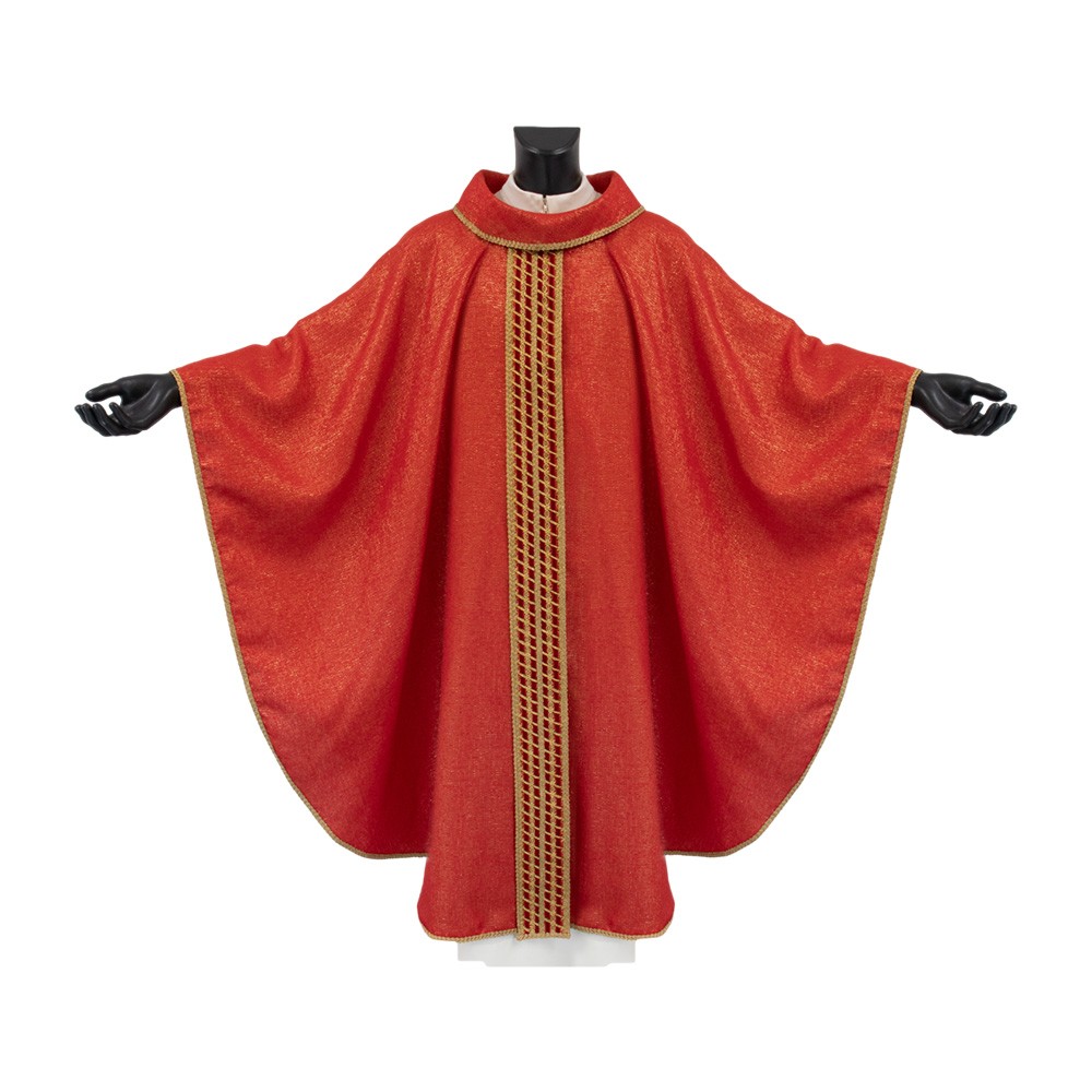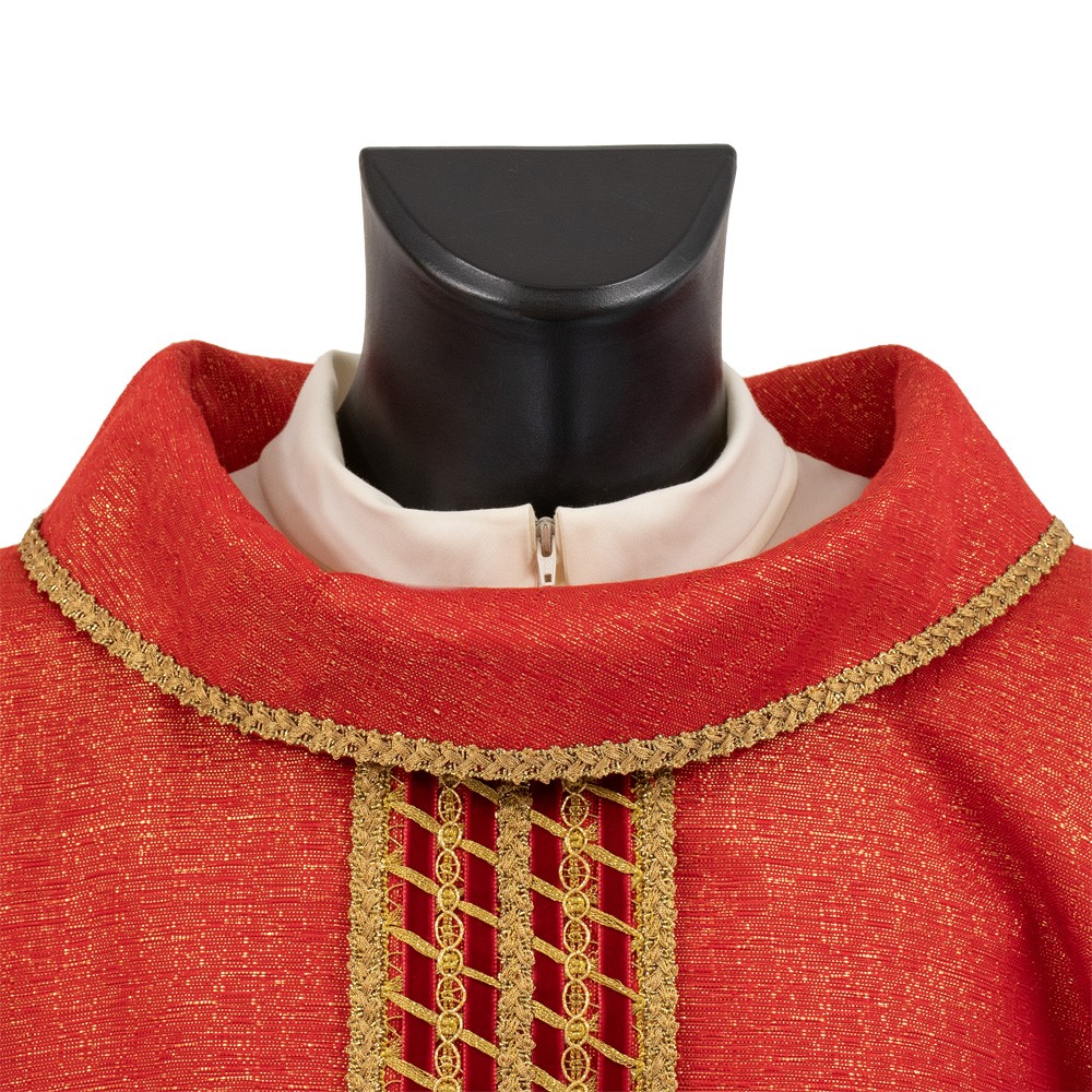 Casula sacerdotale rossa con collo ad anello e stolone decorato.