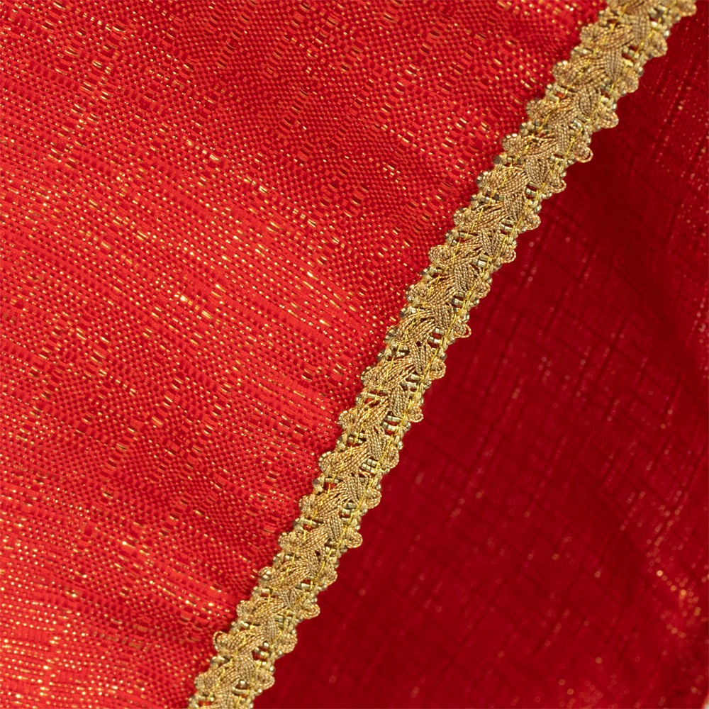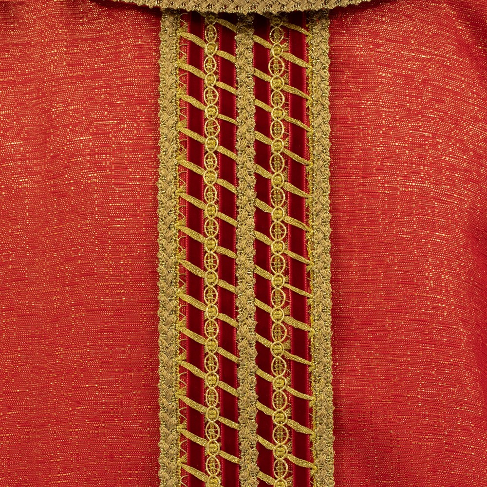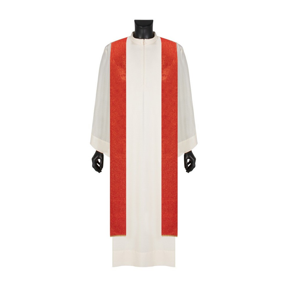 La particolarità di questa veste liturgica è lo stolone realizzato con elegante agremano intrecciato dorato completamente foderato in velluto rosso.