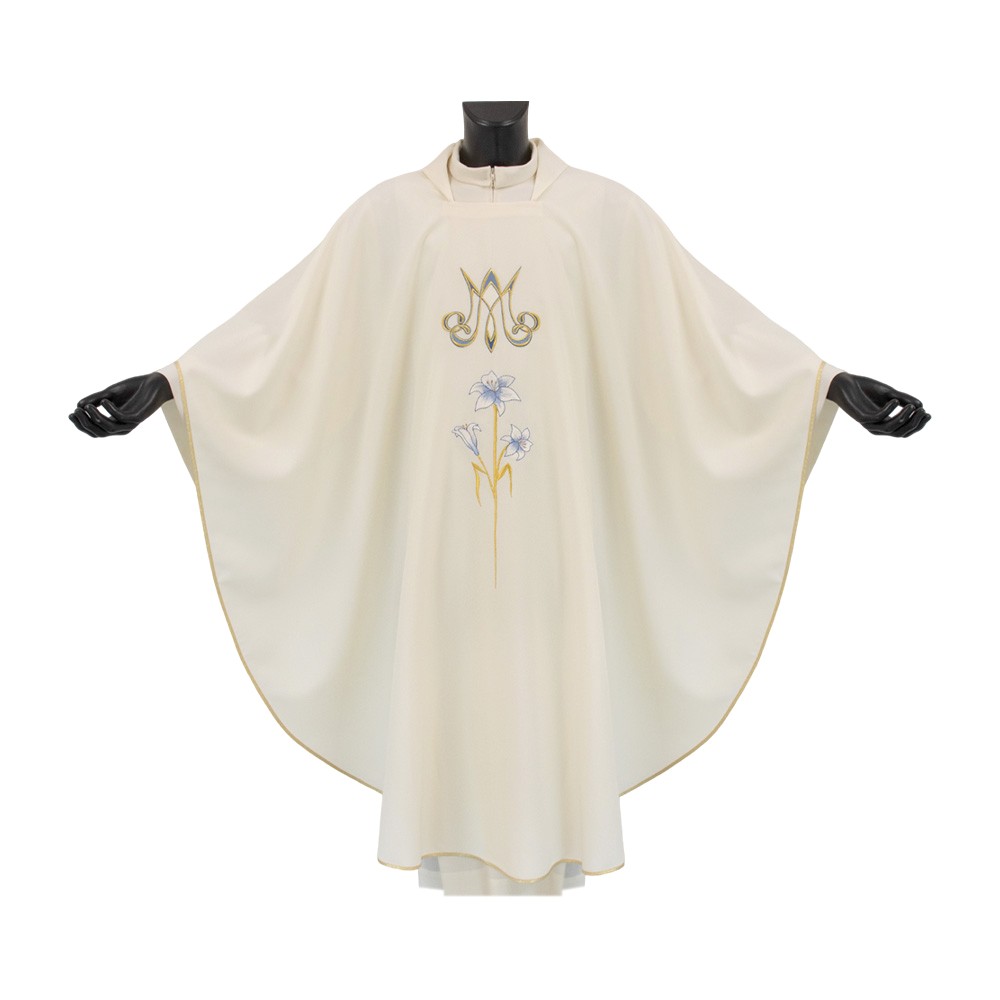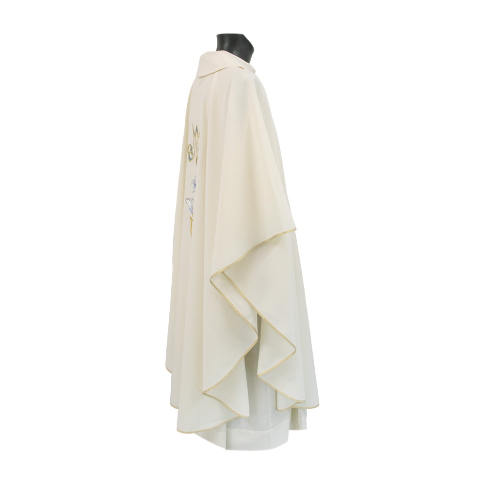 Casula sacerdotale color avorio con monogramma Mariano, confezionata in leggero e fresco poliestere.