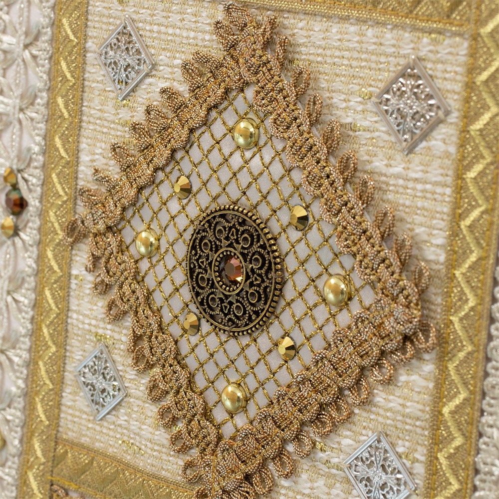 Rifinita interamente a mano con sbieco perimetrale color oro e piccole pietre swarovski.