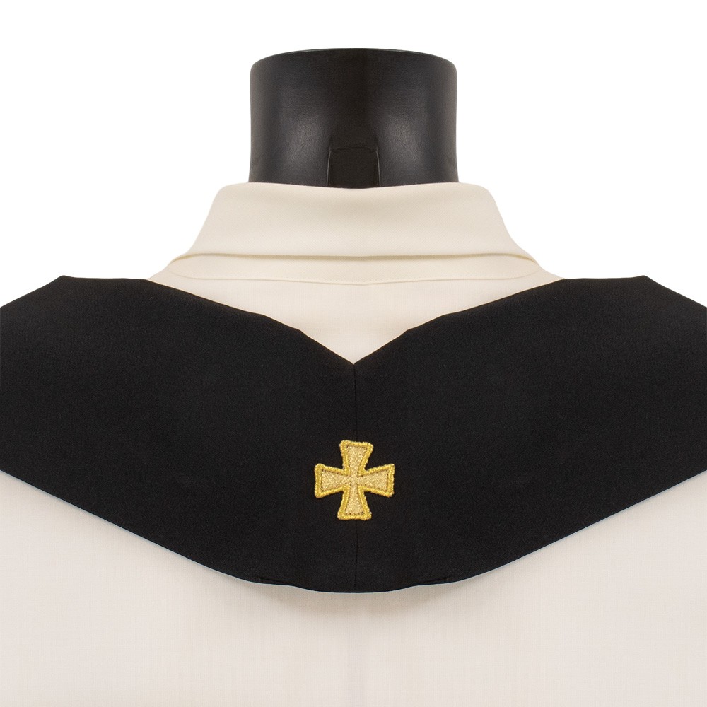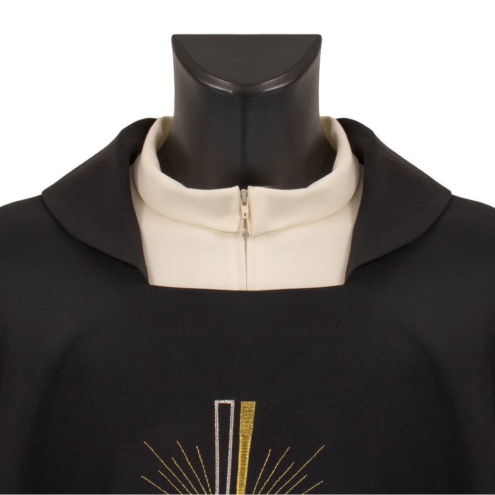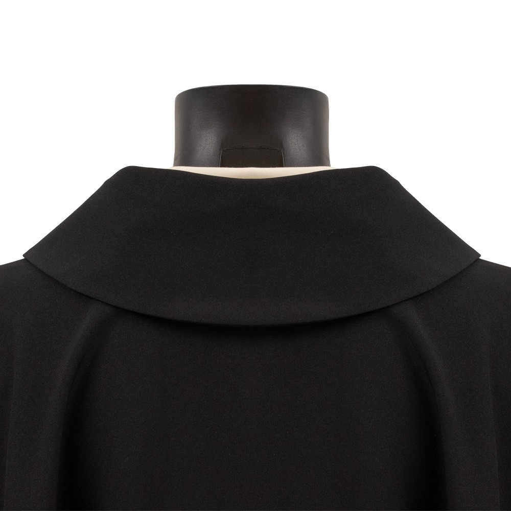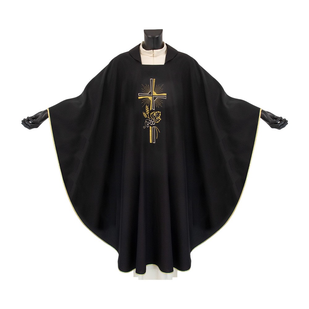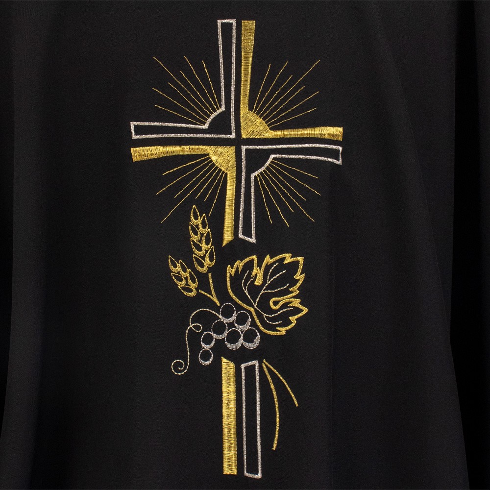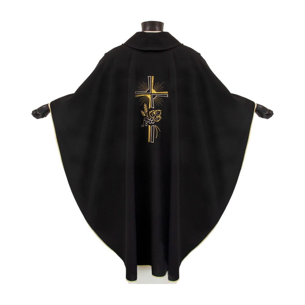 Casula sacerdotale di colore nero con fine ricamo eseguito a macchina con filati dorati.