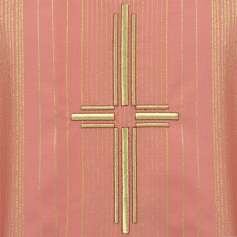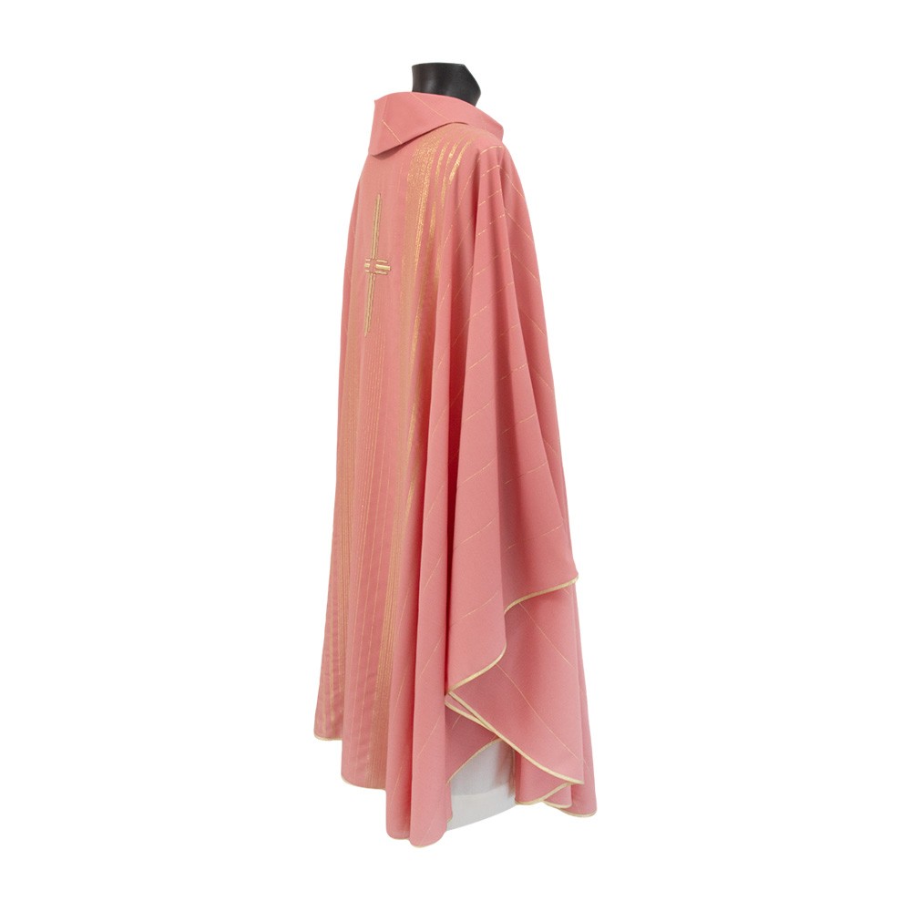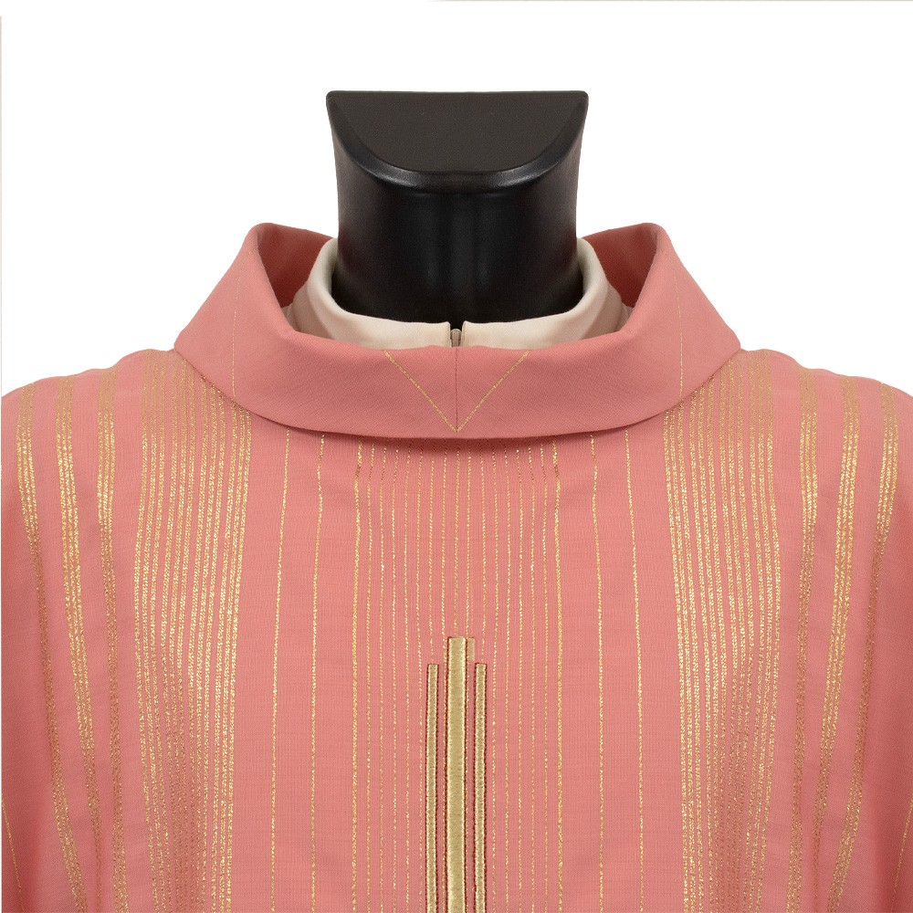 Casula sacerdotale rosa in tessuto rigato in lana e lurex, molta leggera e traspirante.