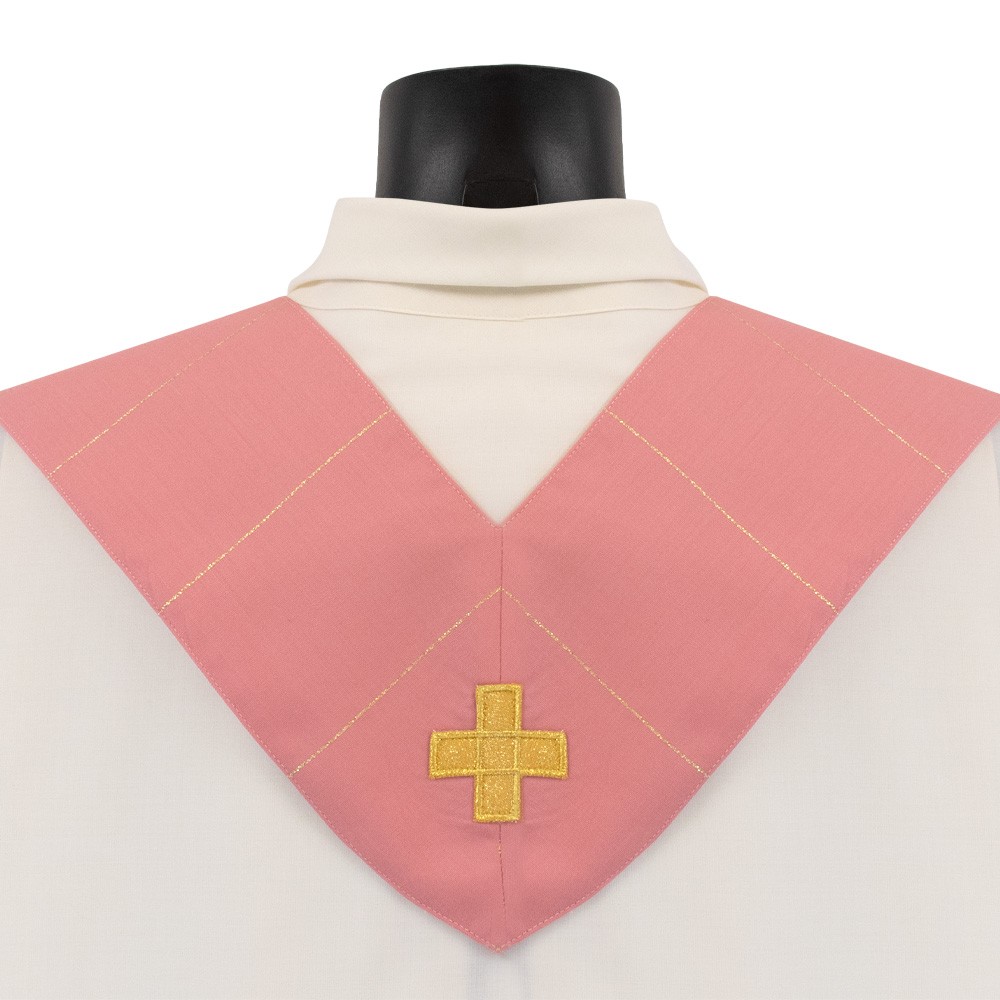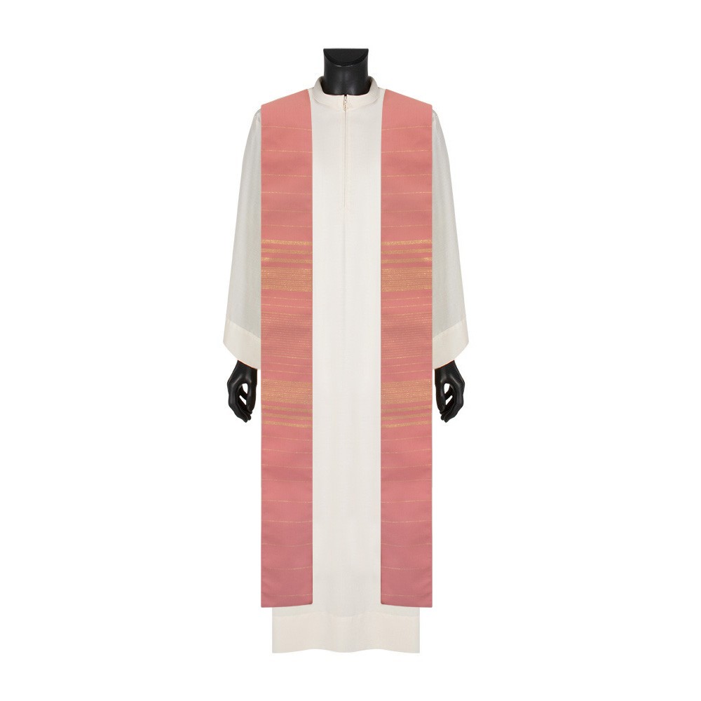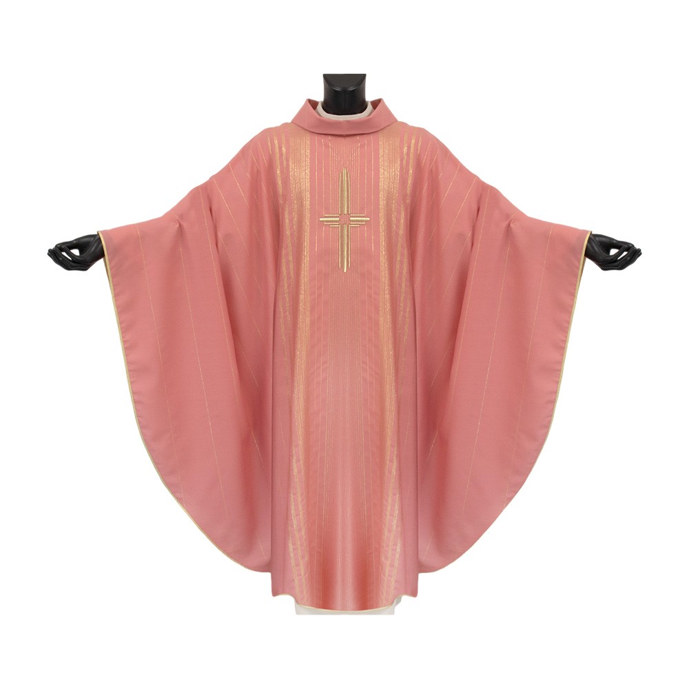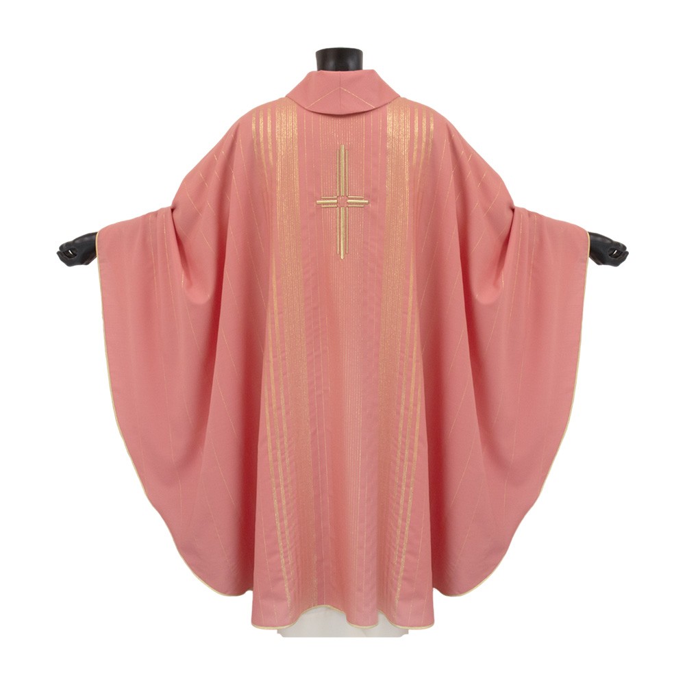 Casula sacerdotale rosa in tessuto rigato in lana e lurex, molta leggera e traspirante.