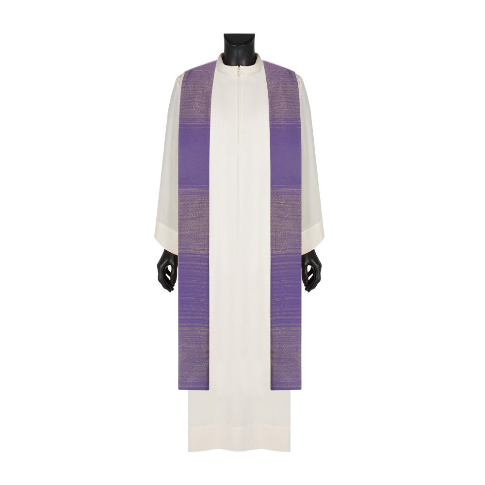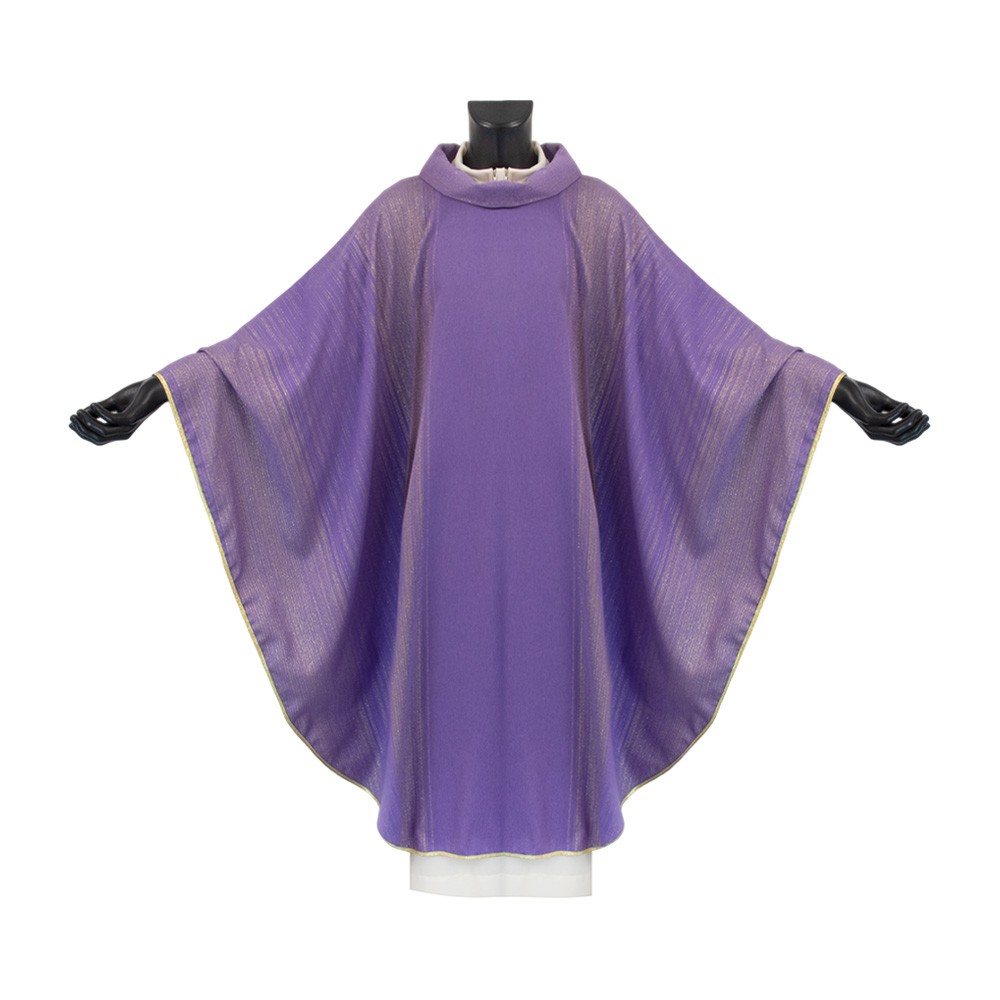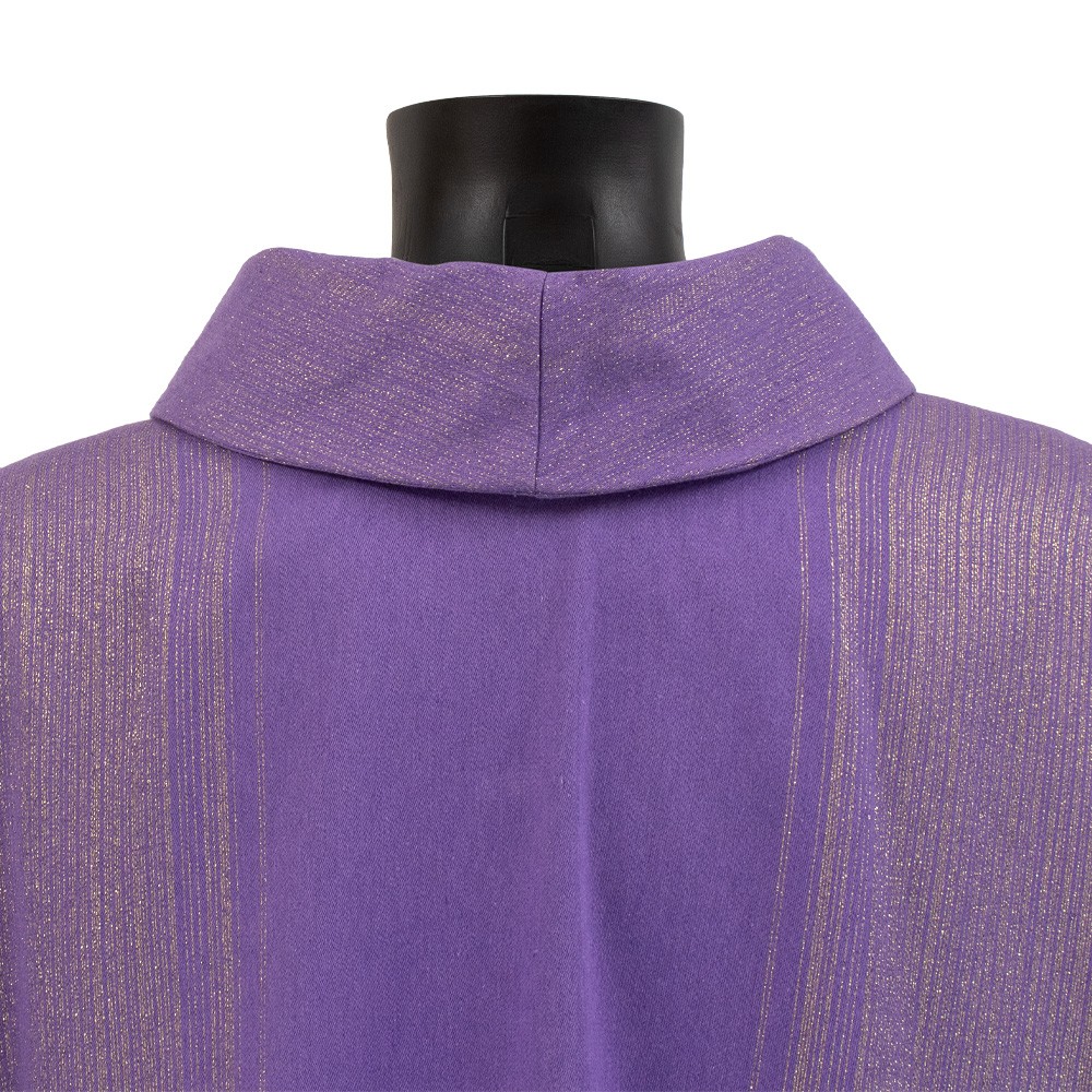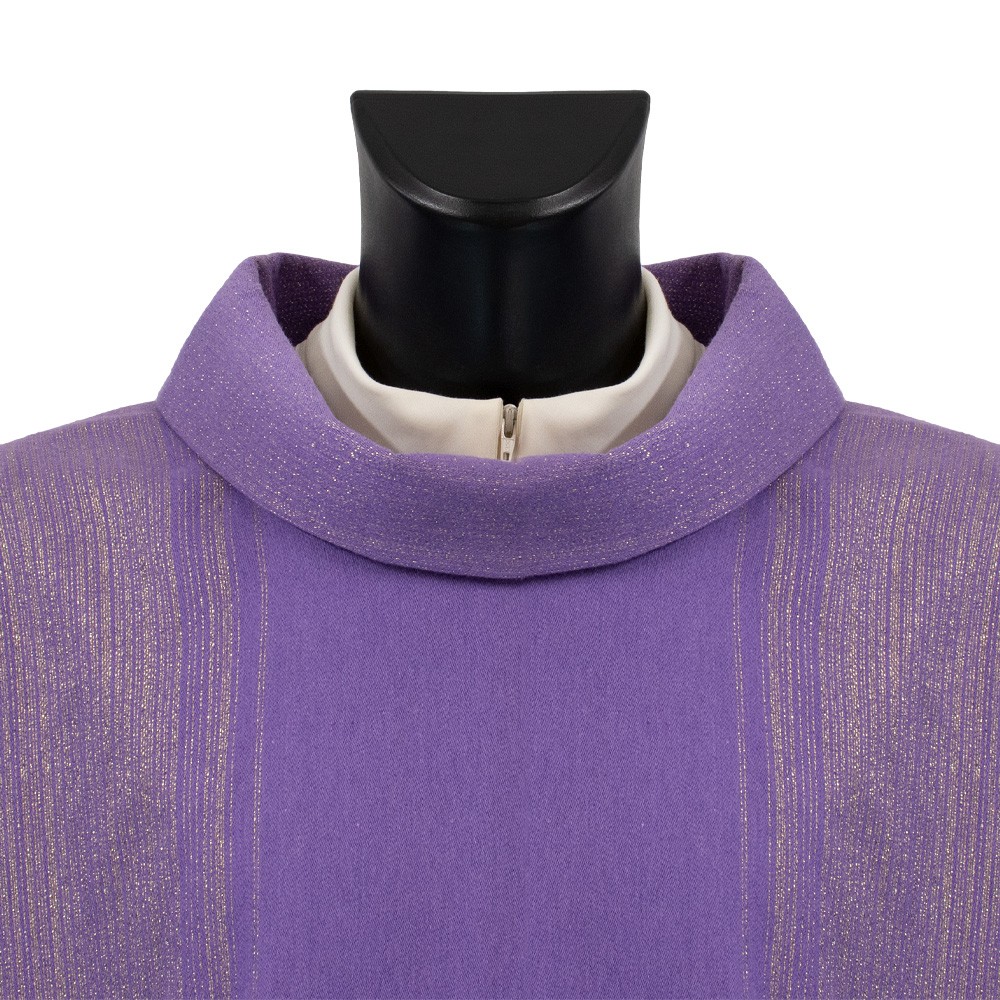 Casula da sacerdote di colore viola con collo ad anello e righe in argento lurex.