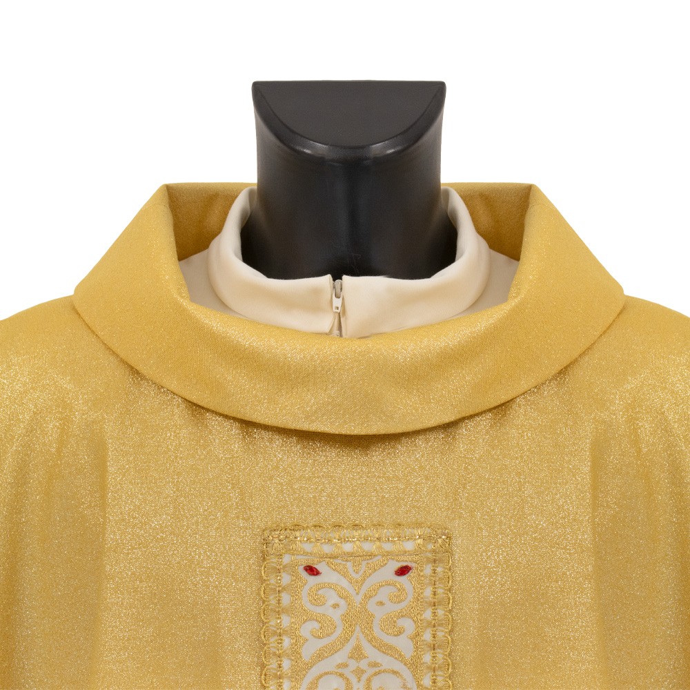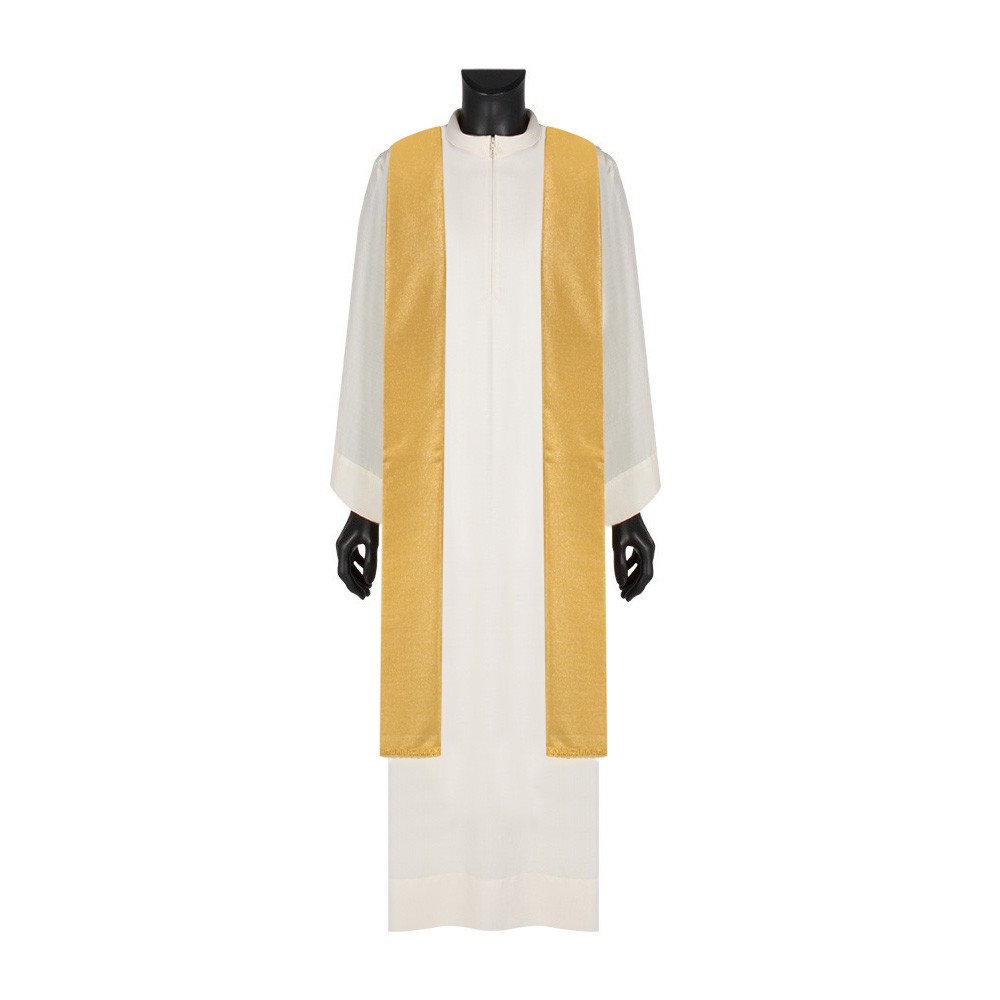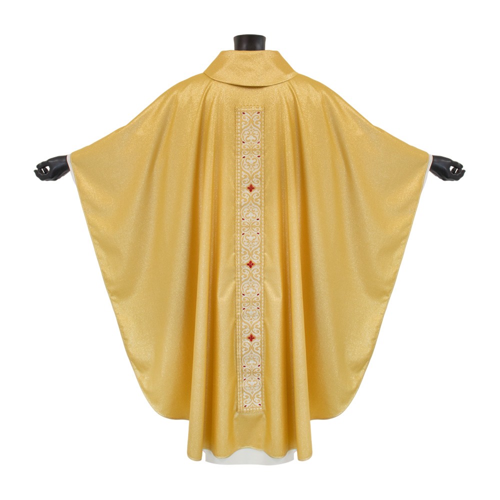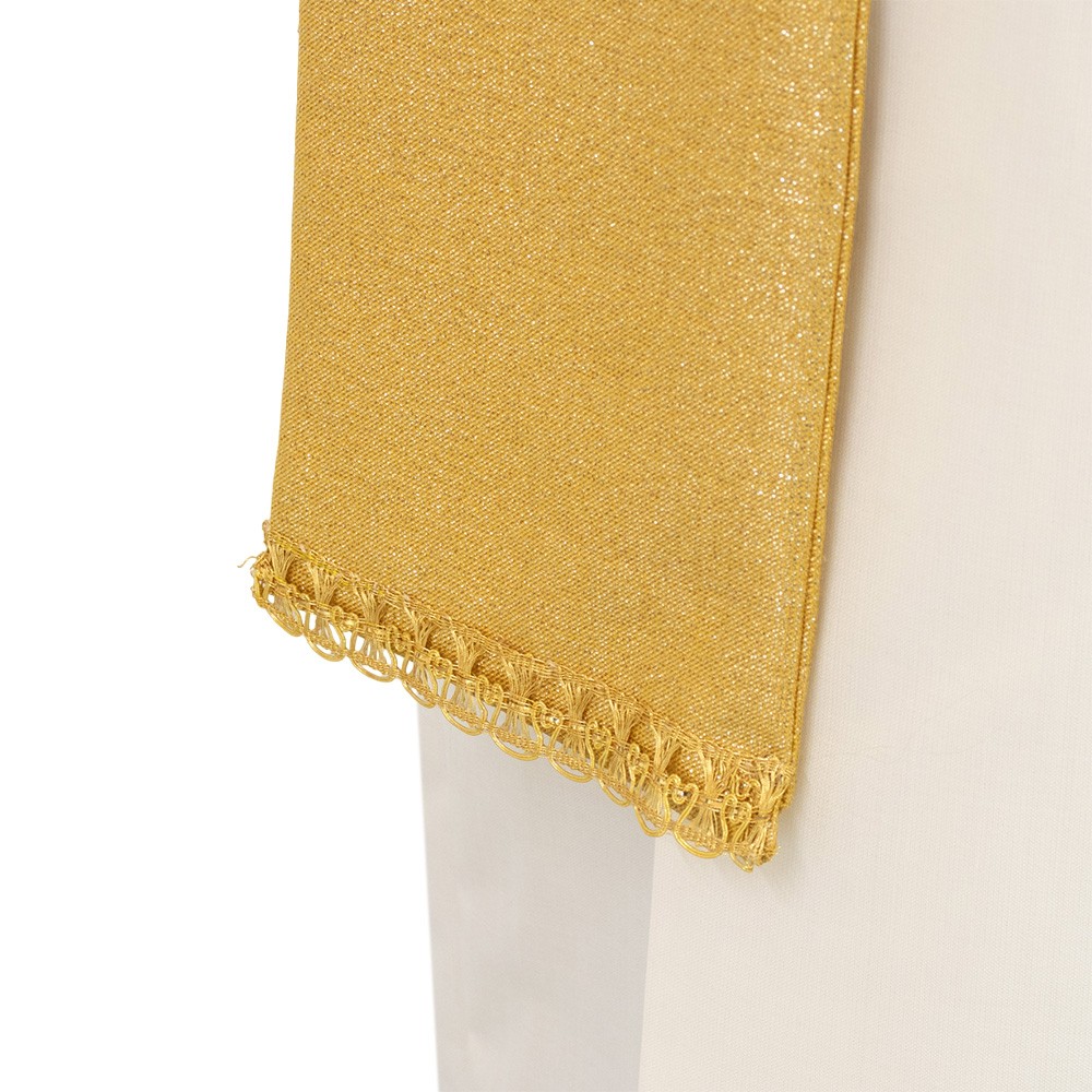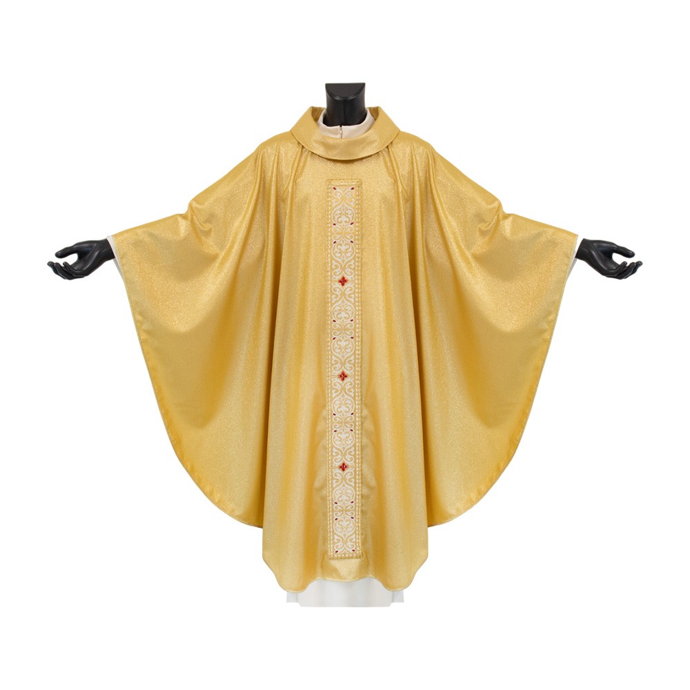 Questa veste liturgica si presenta con comodo collo ad anello, taglio classico e stolone finemente decorato e arricchito con agremano oro "Fiordaliso" in misto metallo verniciato, viscosa e poliestere.
