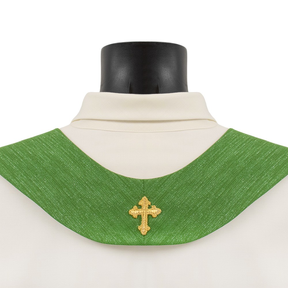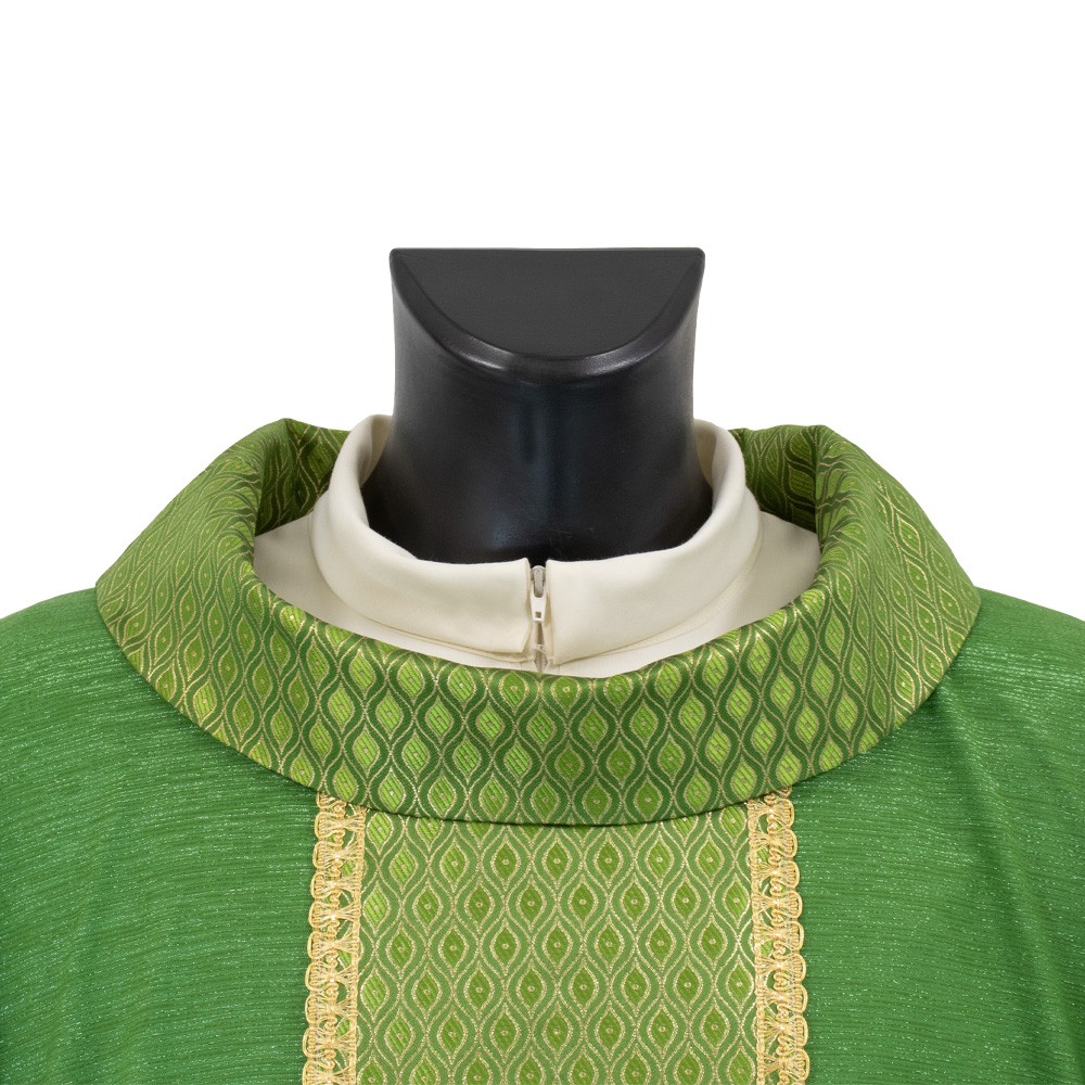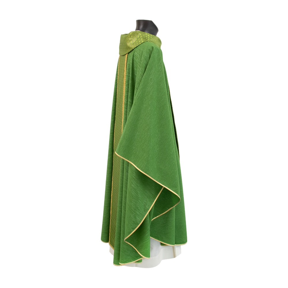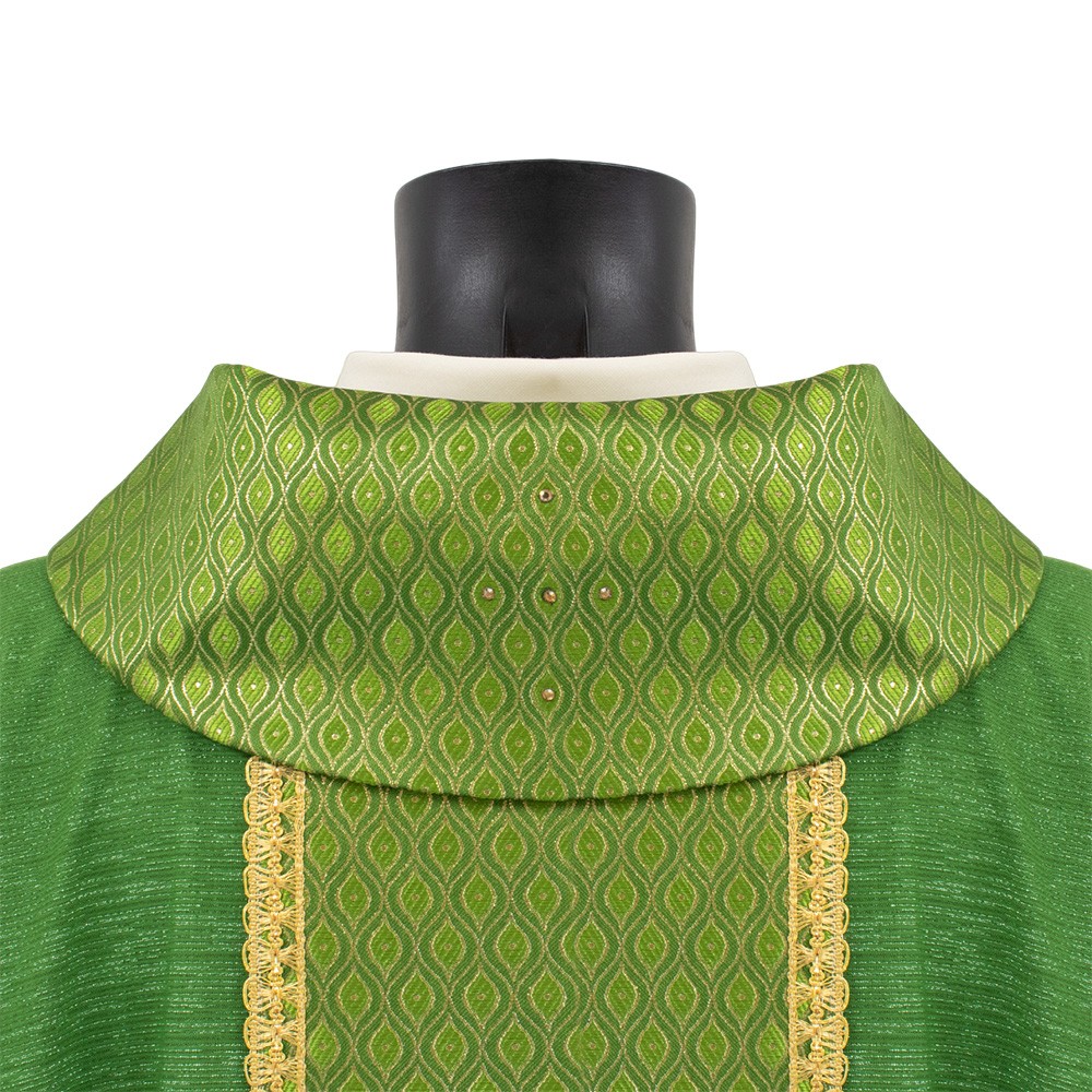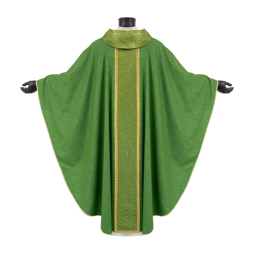 Casula sacerdotale verde con comodo collo ad anello e stolone decorato.