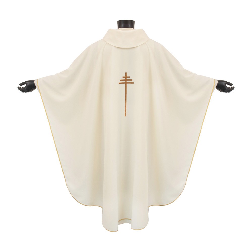 Questa veste liturgica è finemente ricamata a macchina con filati di altissima qualità, si presenta con collo ad anello e taglio classico.