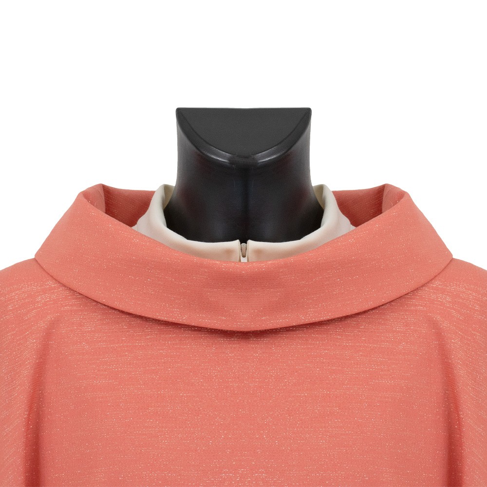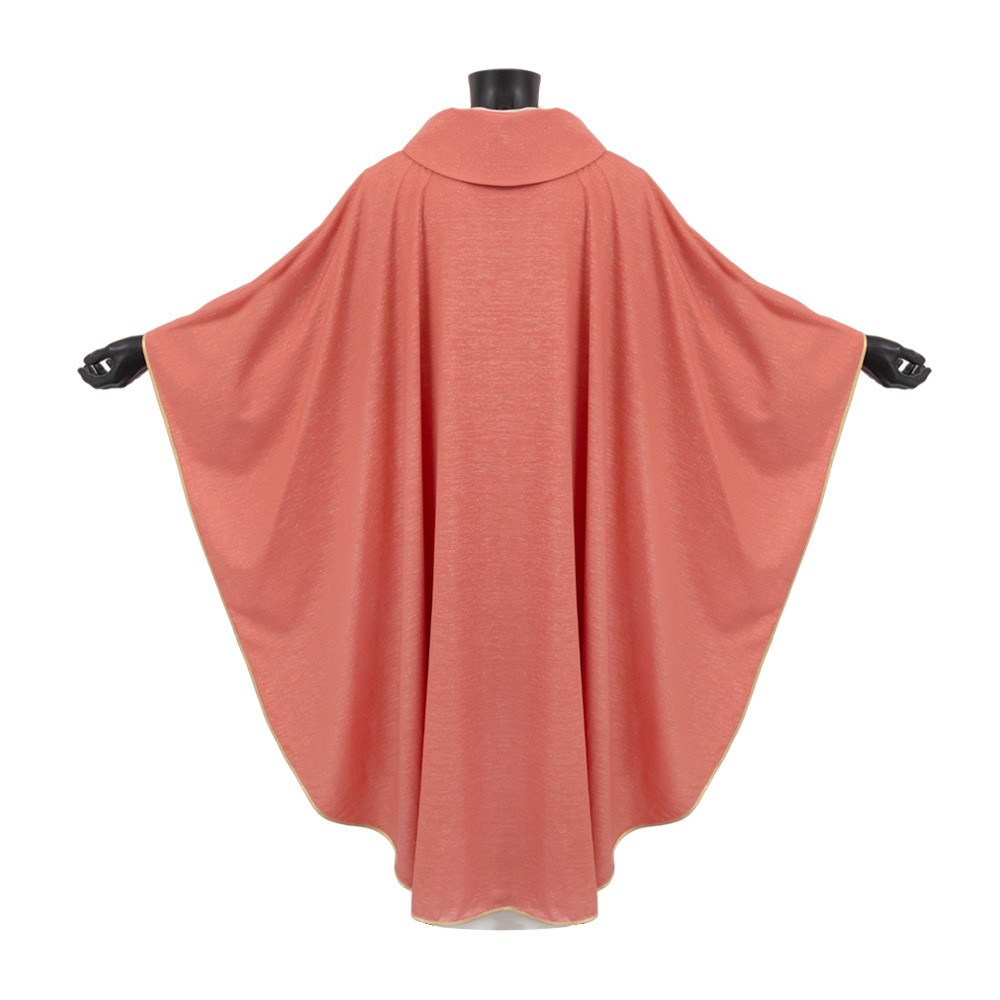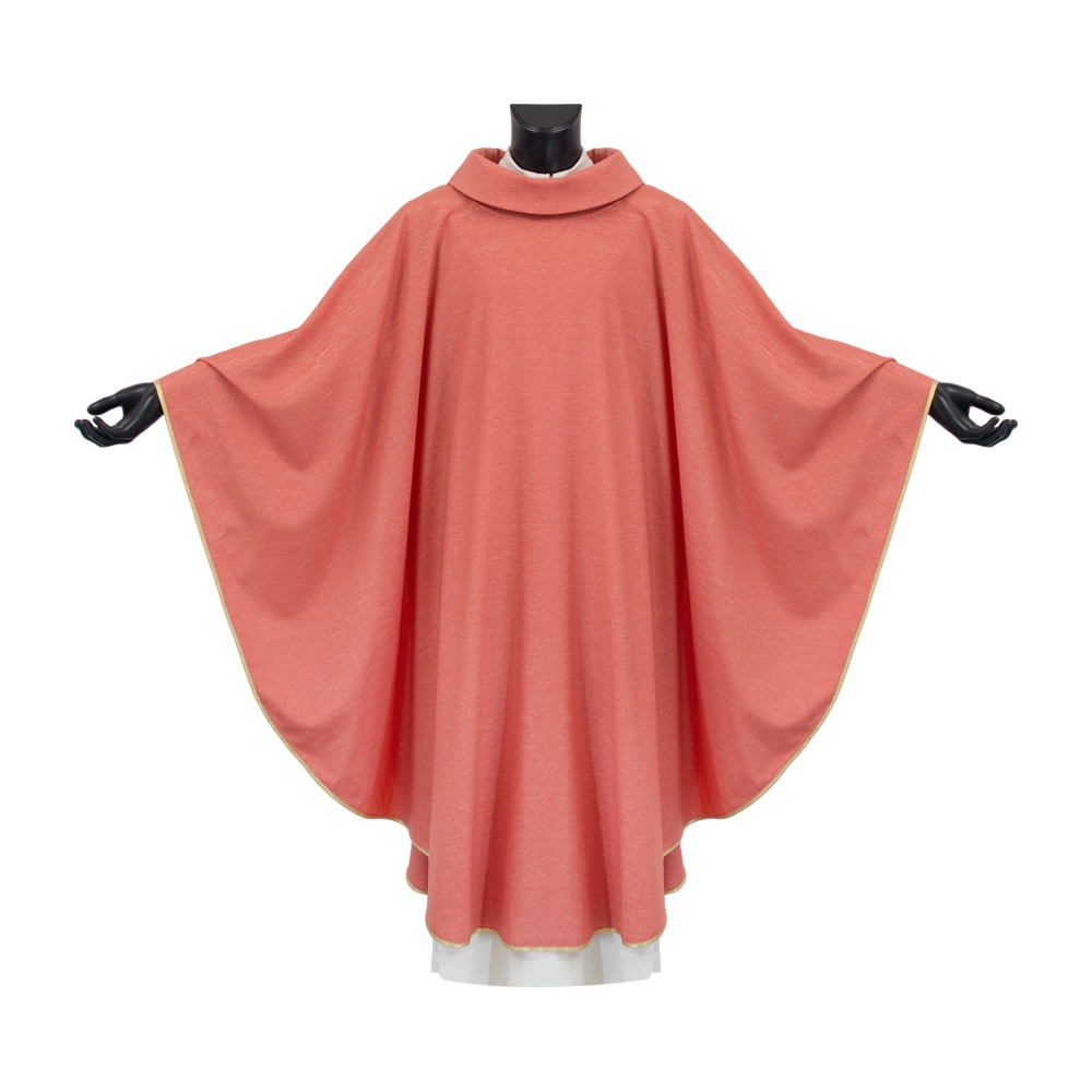 Casula sacerdotale rosa con collo ad anello e priva di ricami.