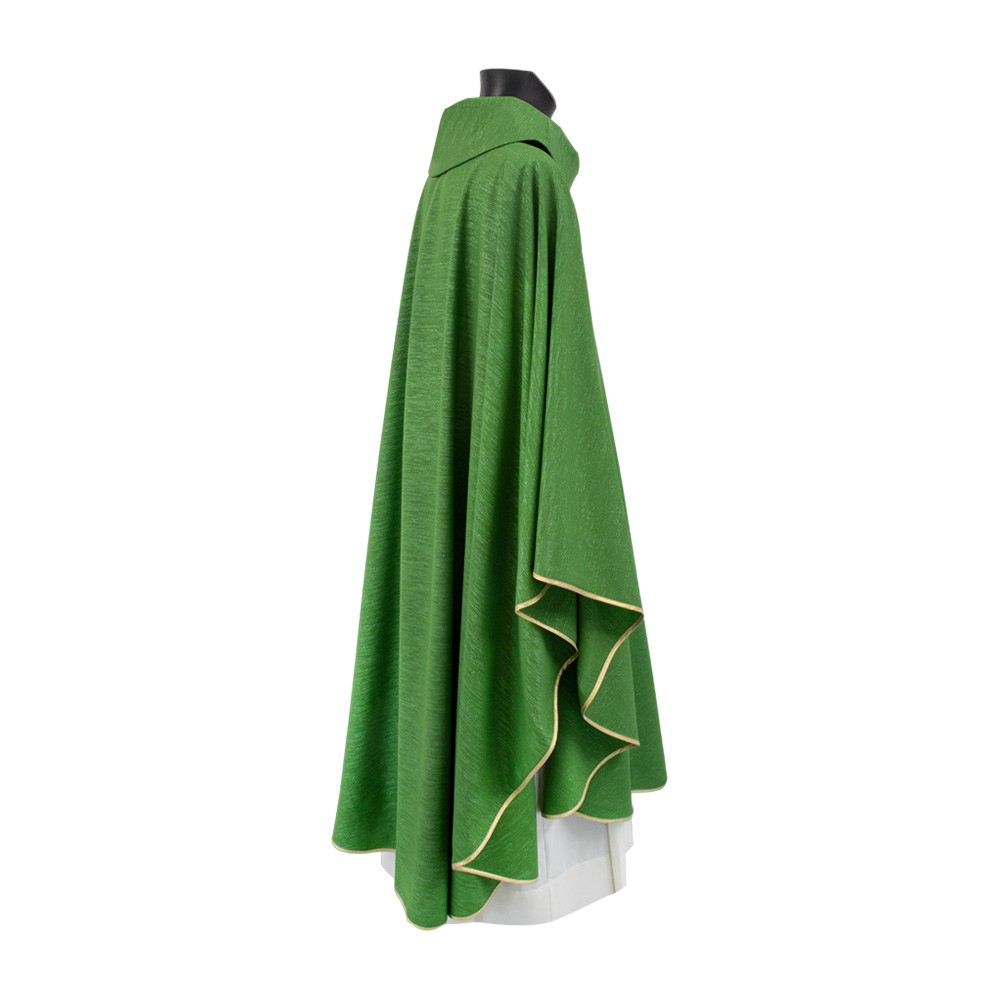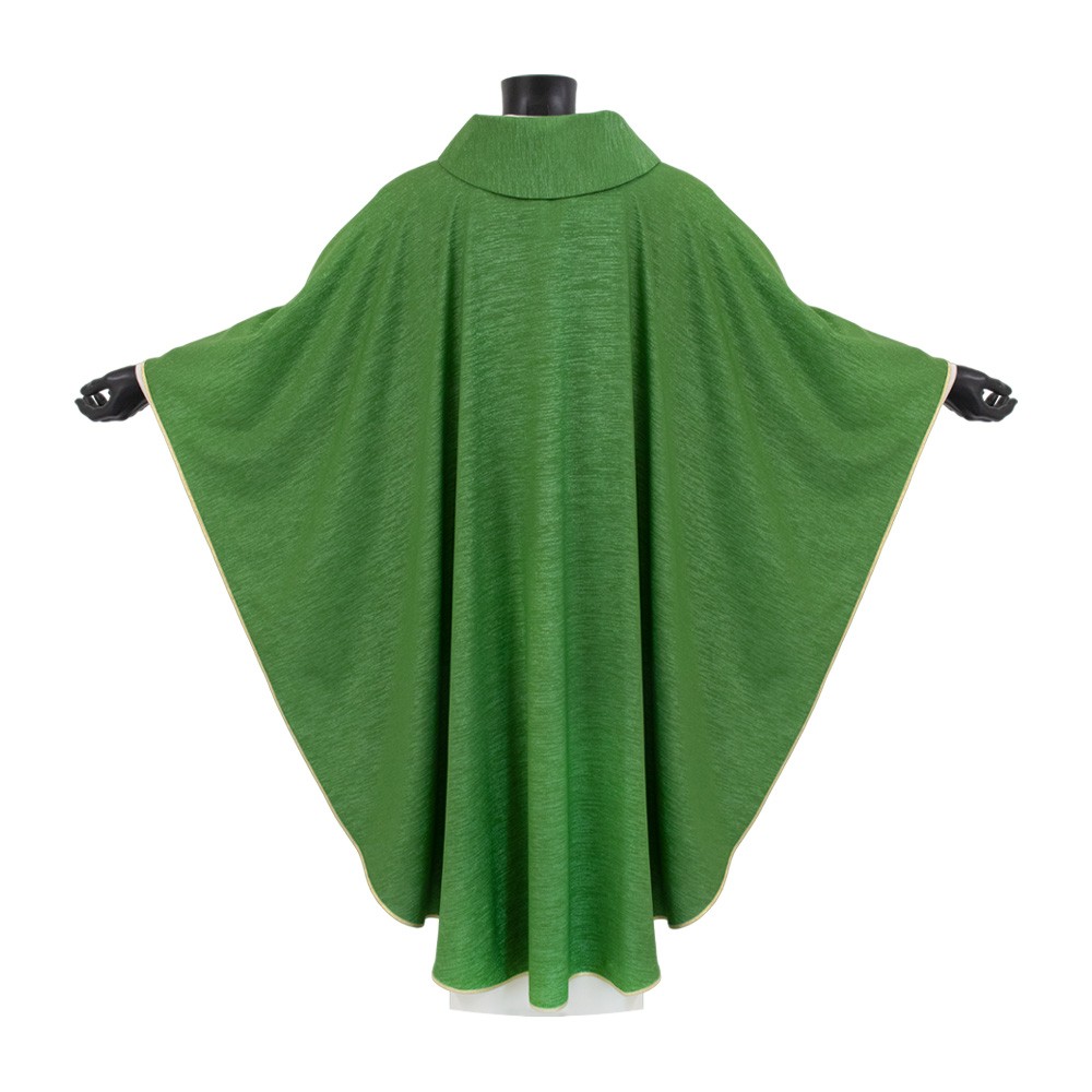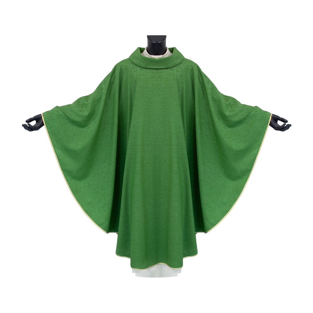Casula sacerdotale verde con collo ad anello e priva di ricami.