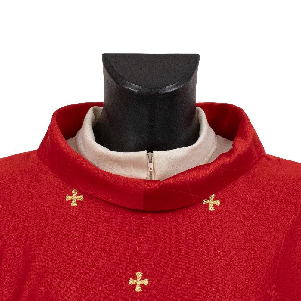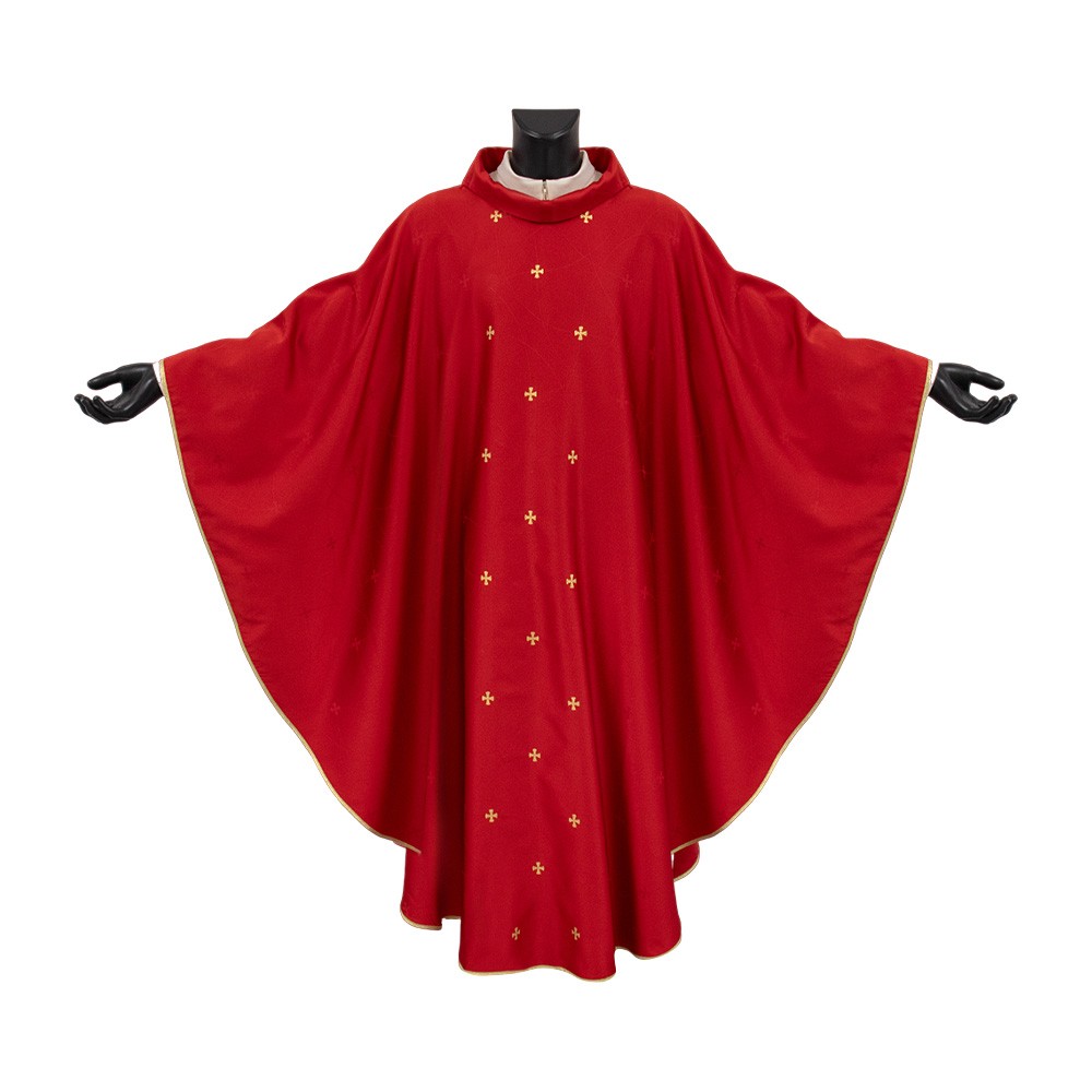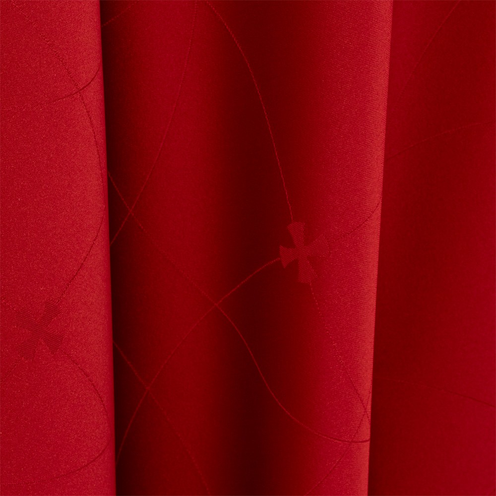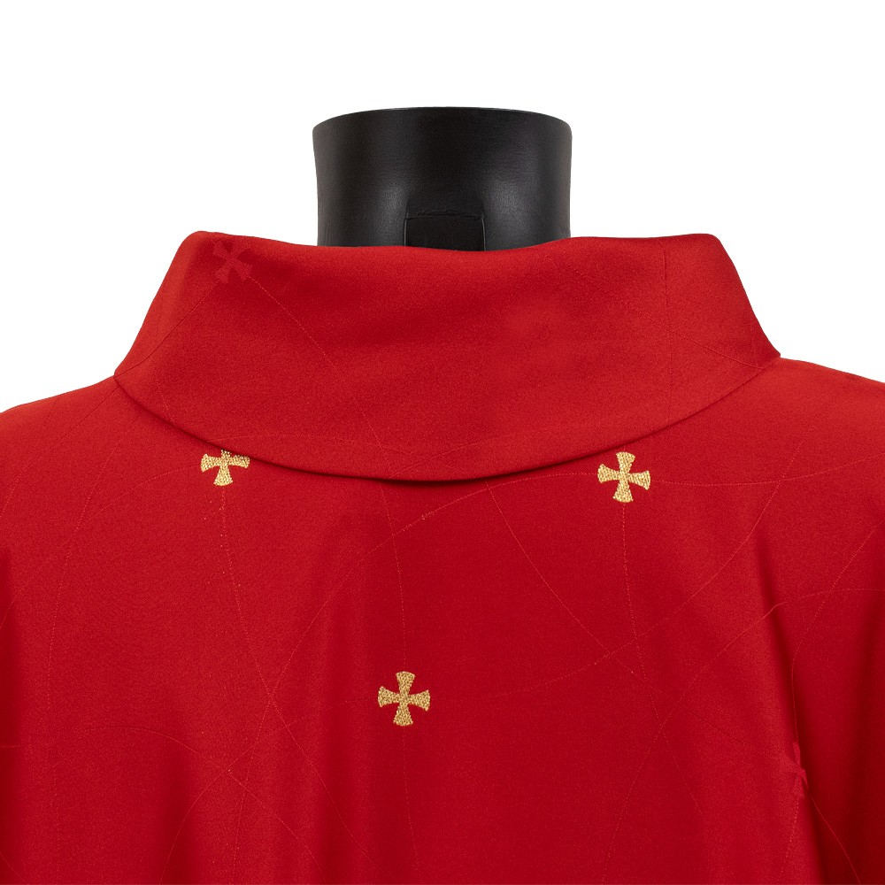 Casula sacerdotale di colore rosso confezionata in leggero poliestere con ricamo di croci dorate.