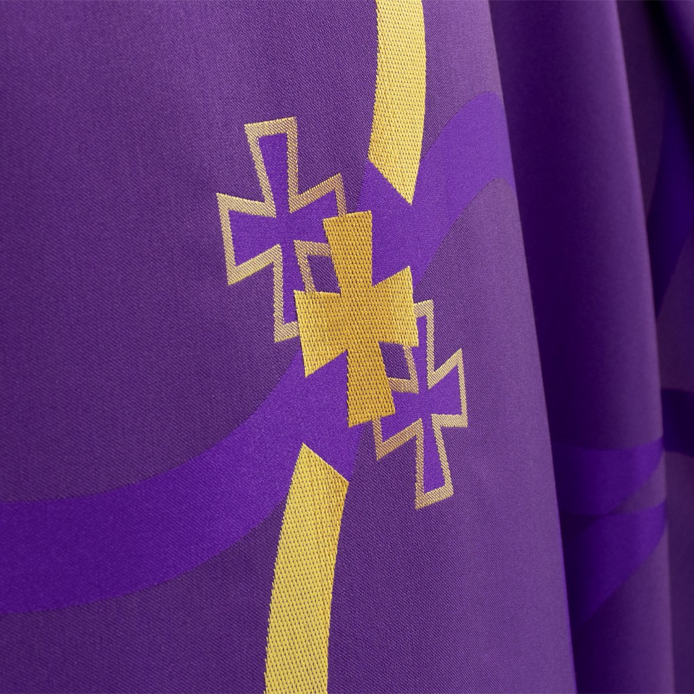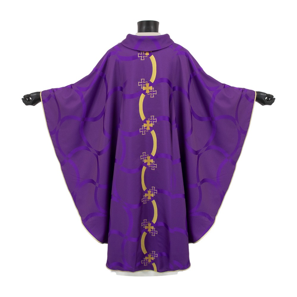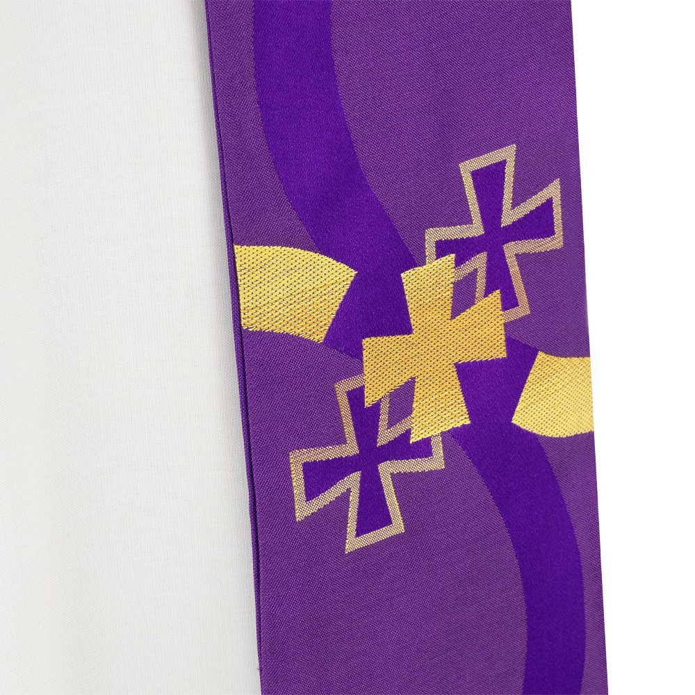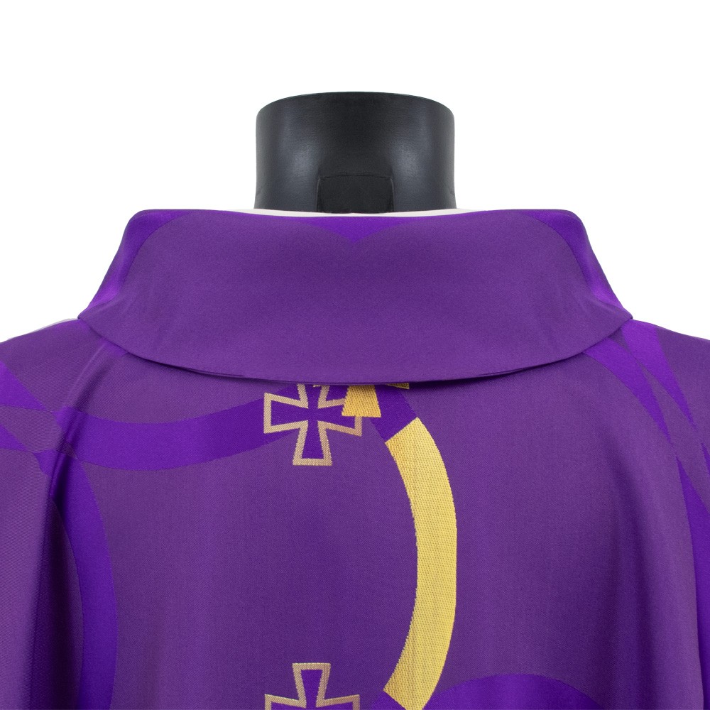 Casula liturgica viola con collo ad anello e croci in colonna decorate, perfetta per la celebrazione dell'Avvento.