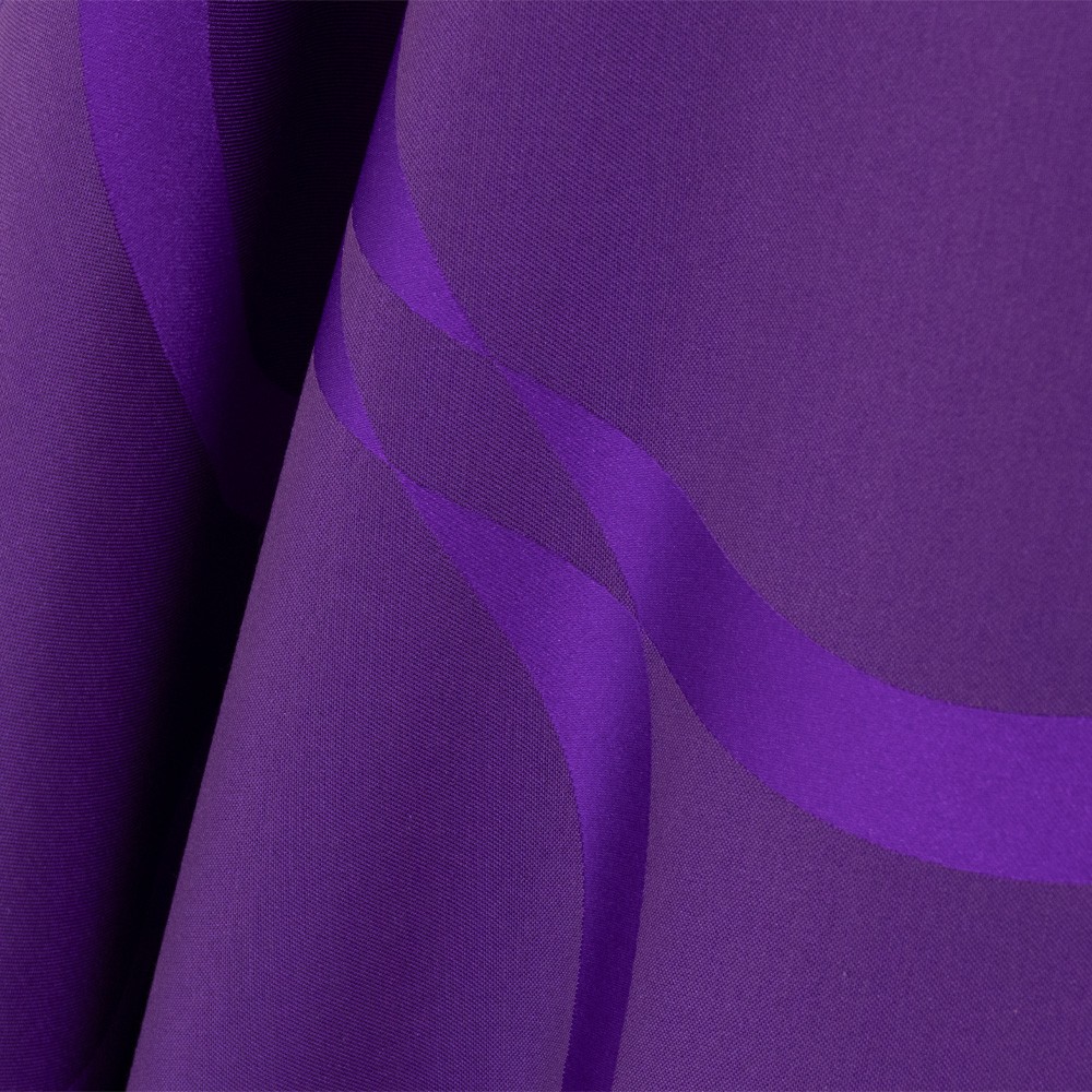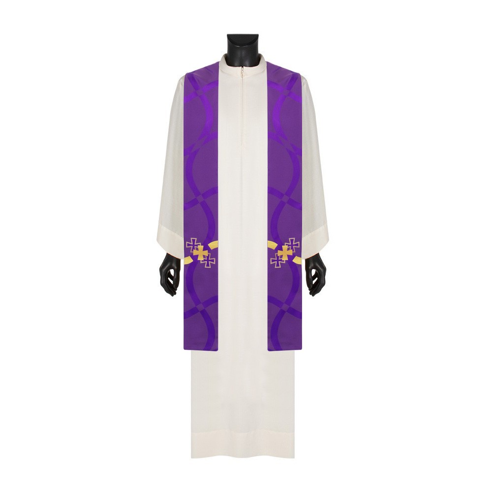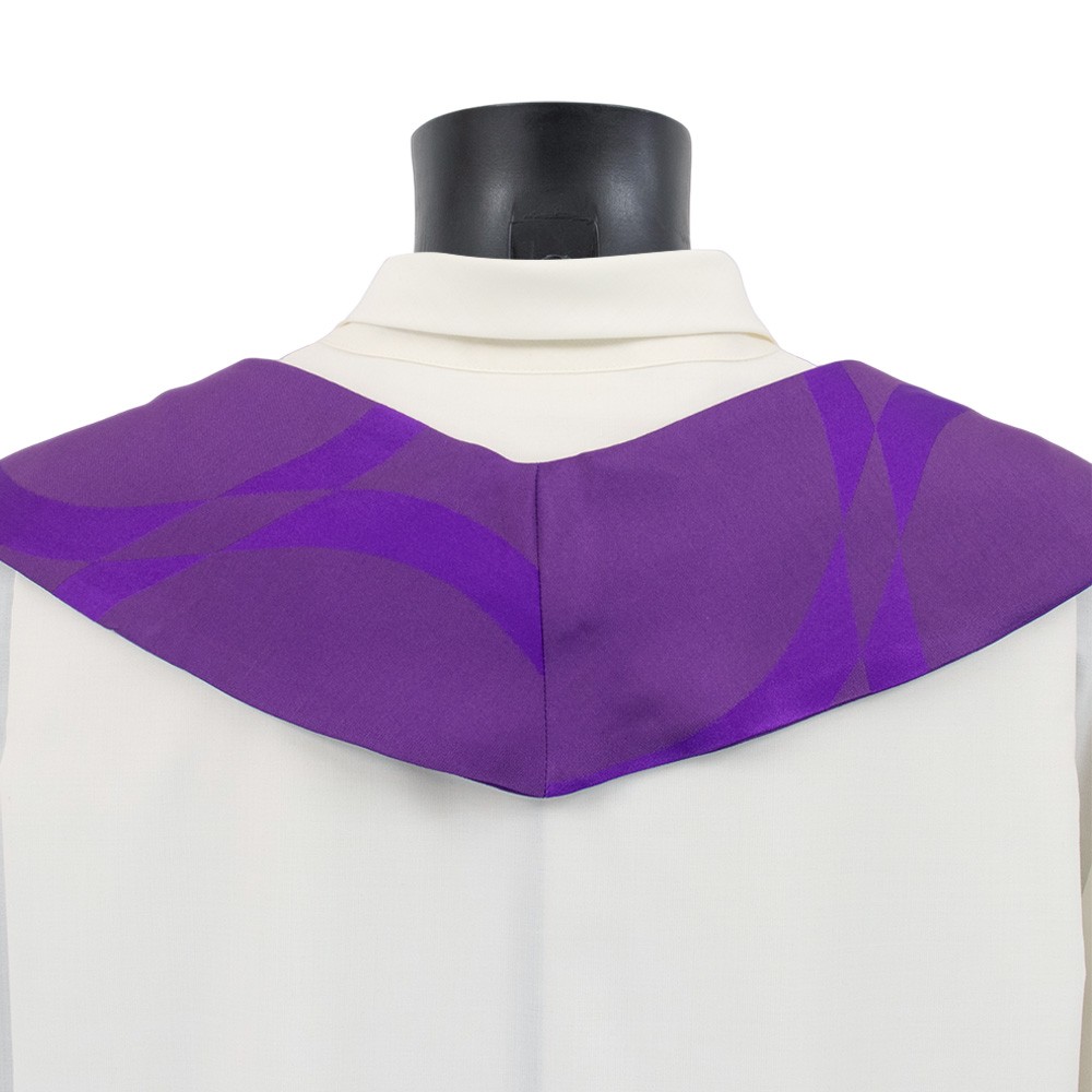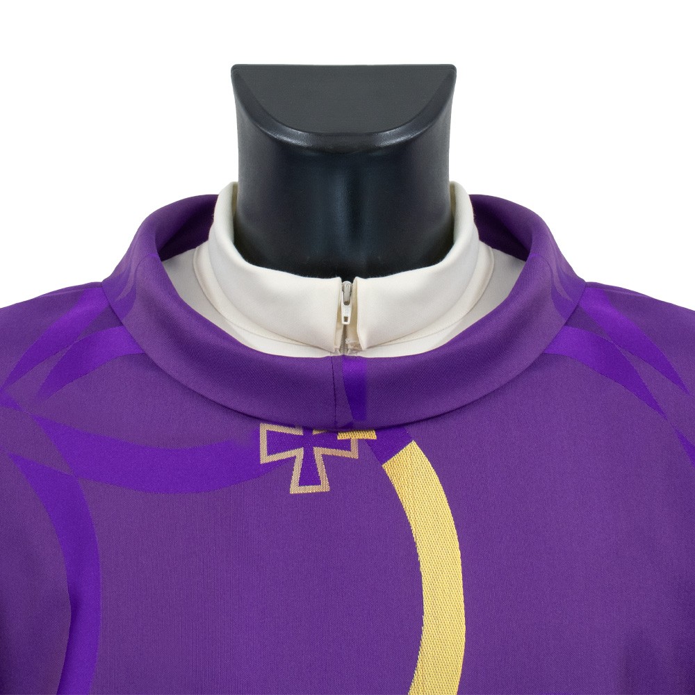 Casula liturgica viola con collo ad anello e croci in colonna decorate, perfetta per la celebrazione dell'Avvento.
