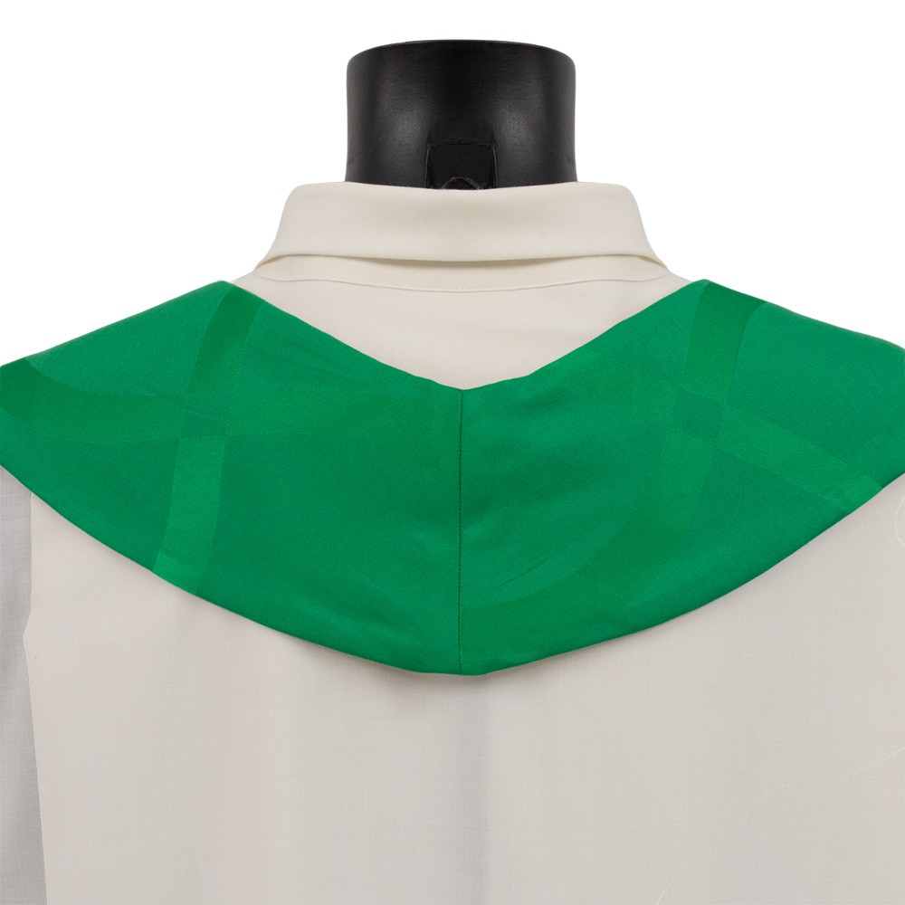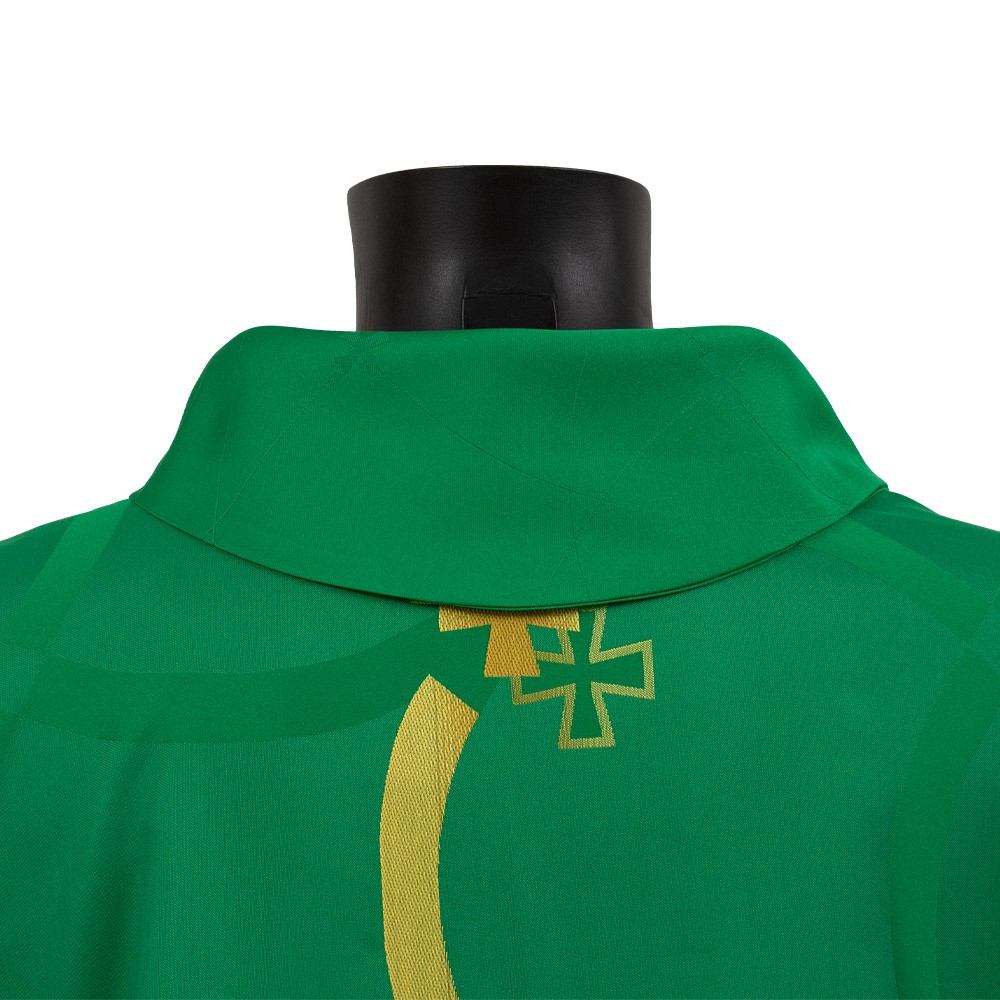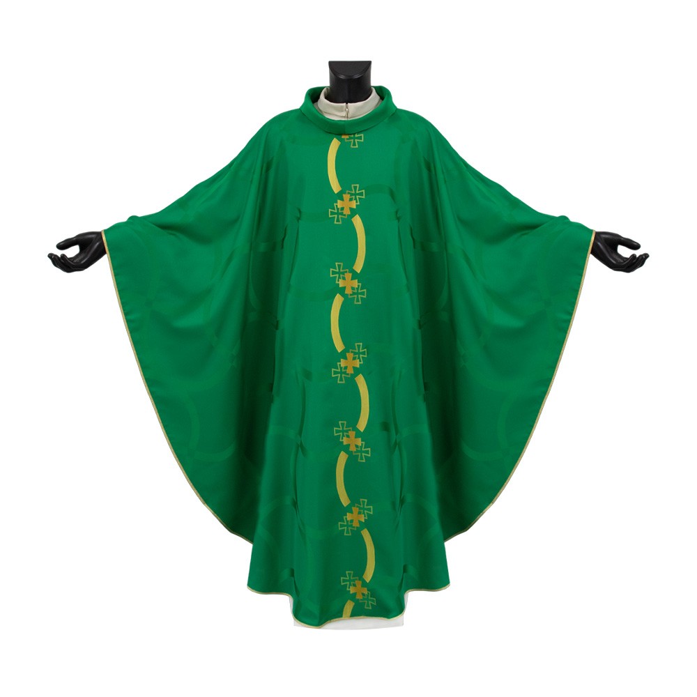 Casula da sacerdote verde con decorazioni di croci dorate in colonna.