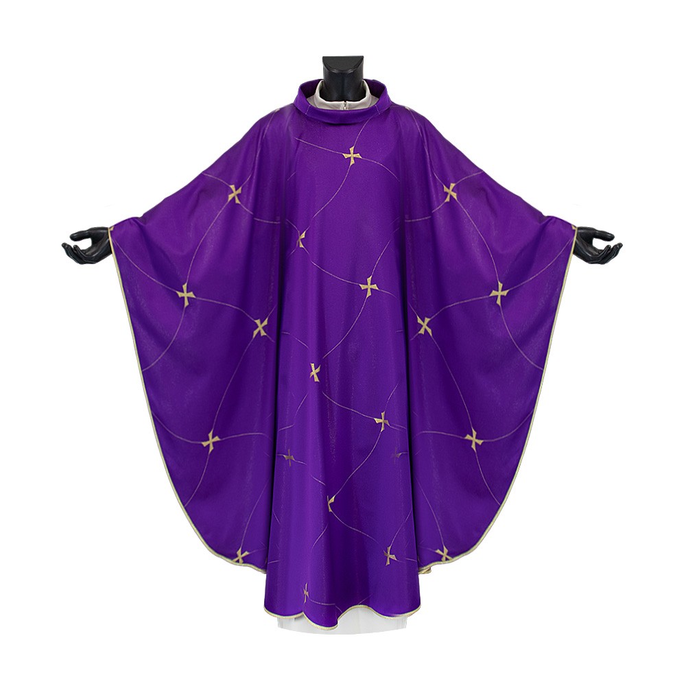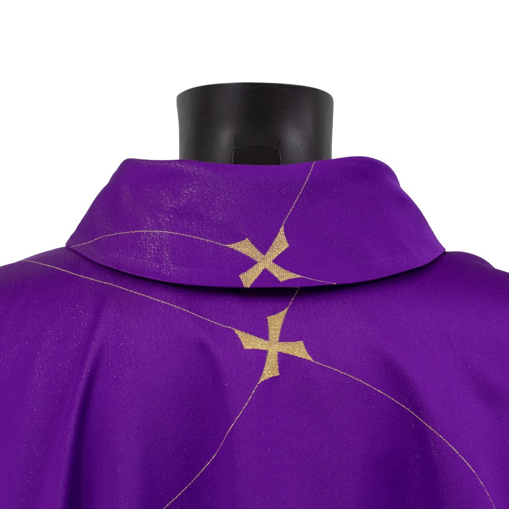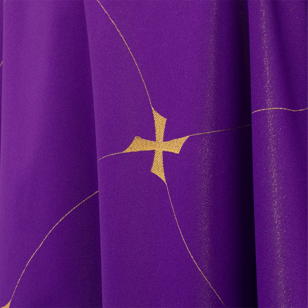 Casula sacerdotale viola e decori dorati, realizzata in tessuto poliestere leggero. Una delle migliori casule viola per l'Avvento.