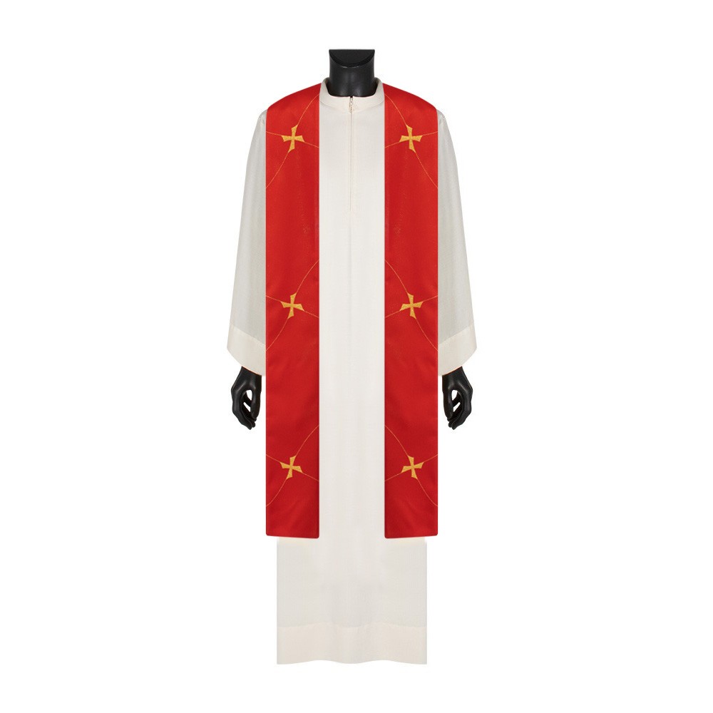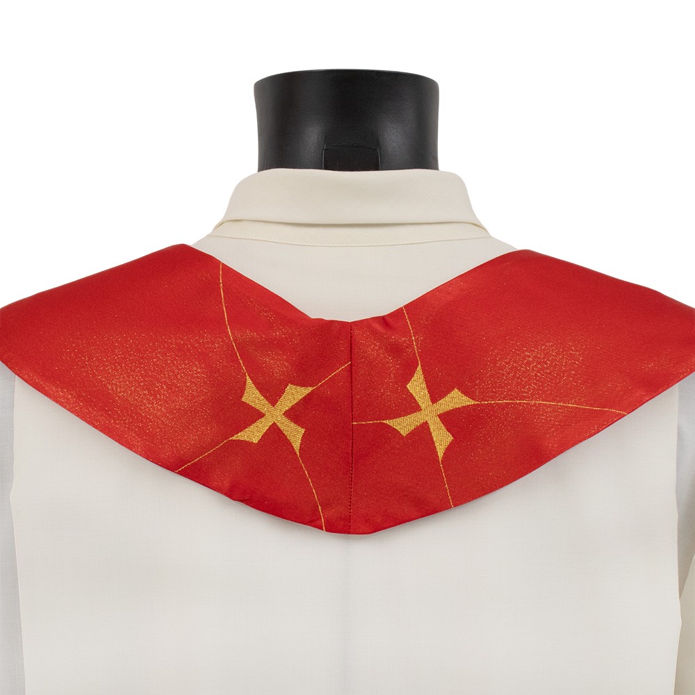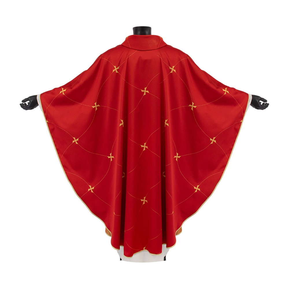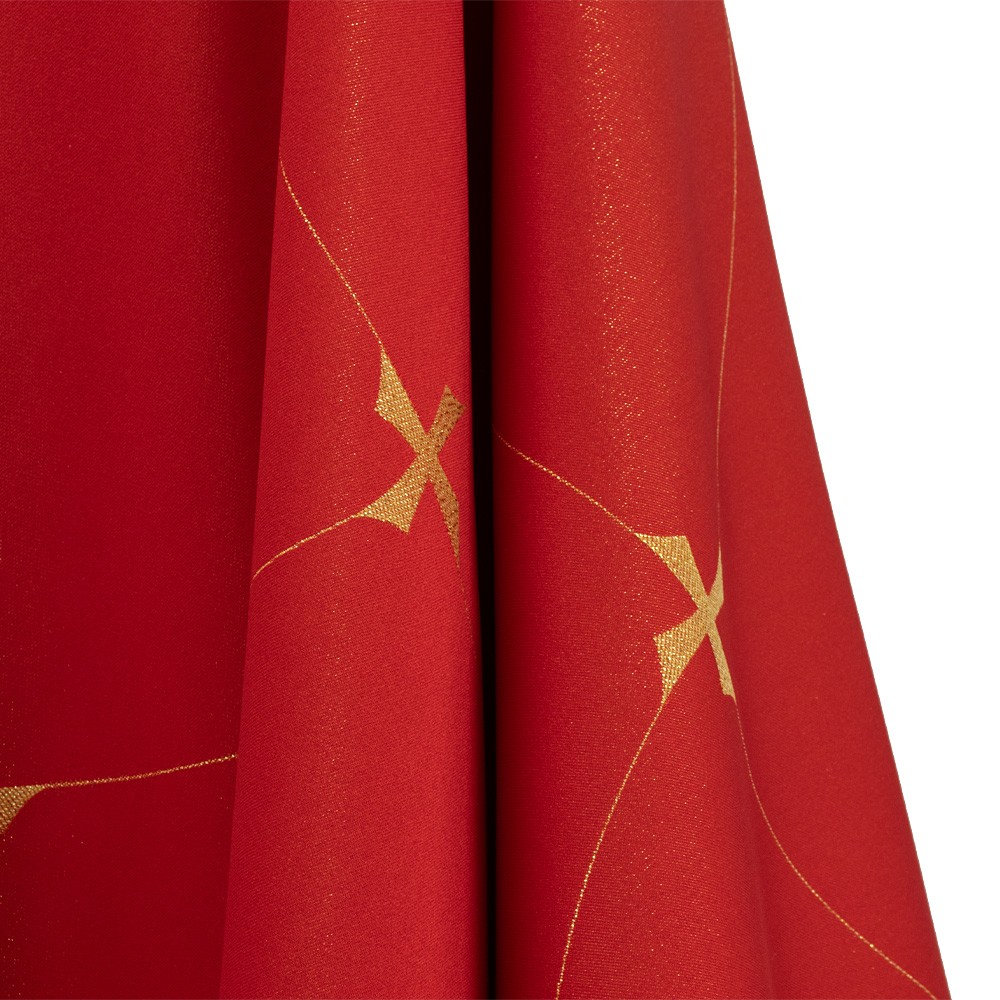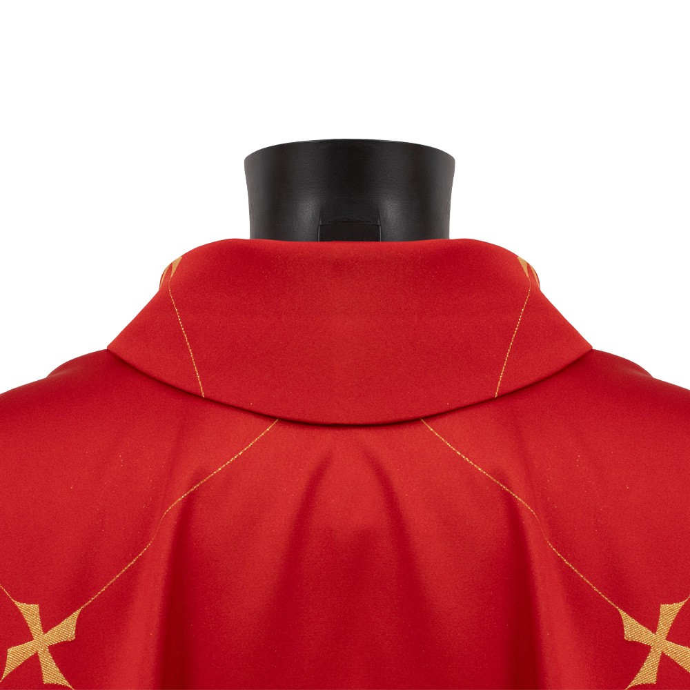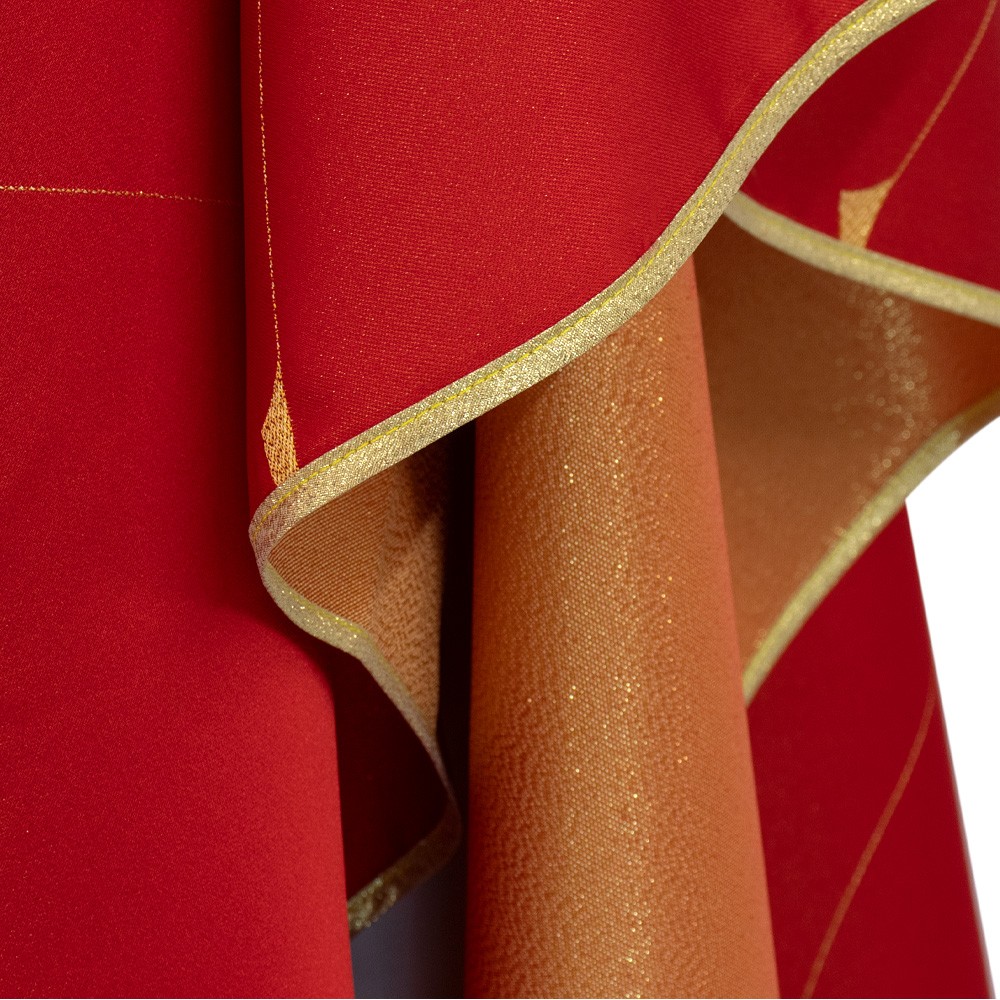 Casula sacerdotale rossa e ricami dorati, realizzata in tessuto poliestere leggero.