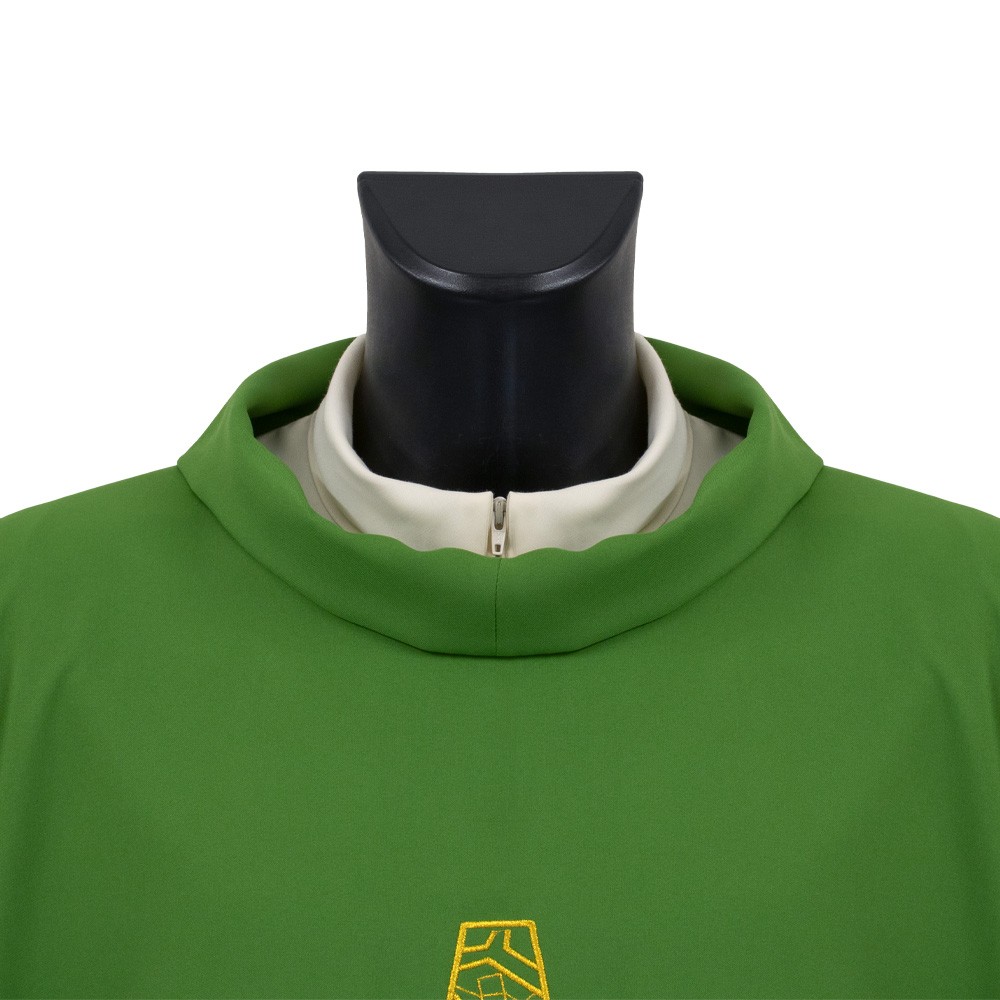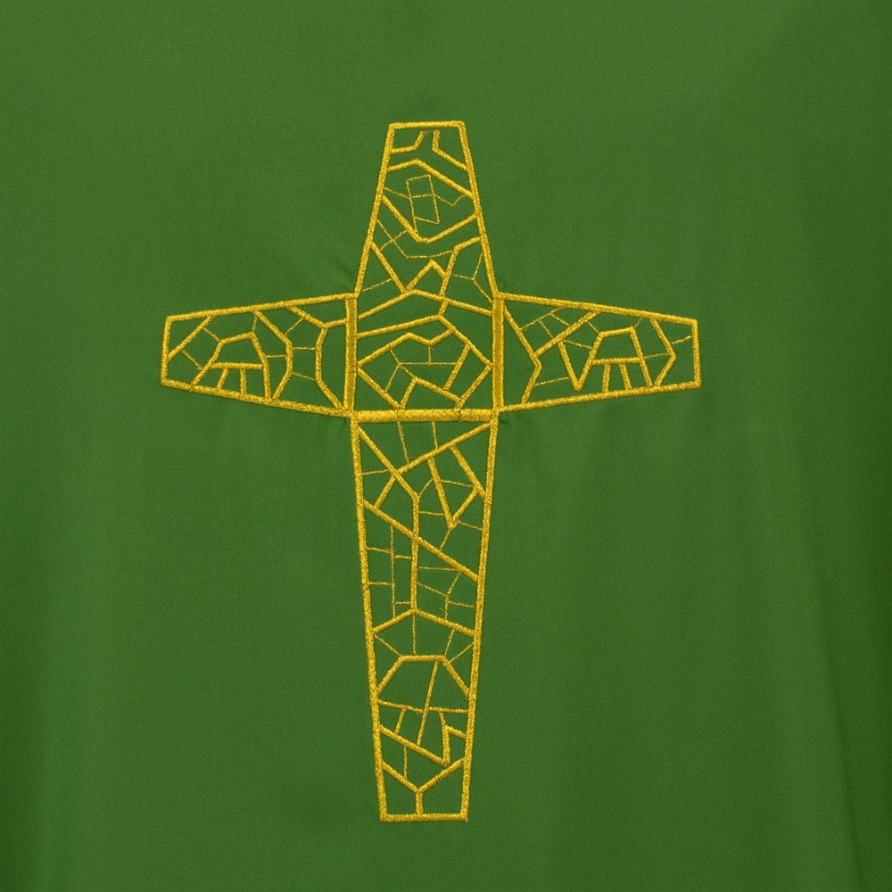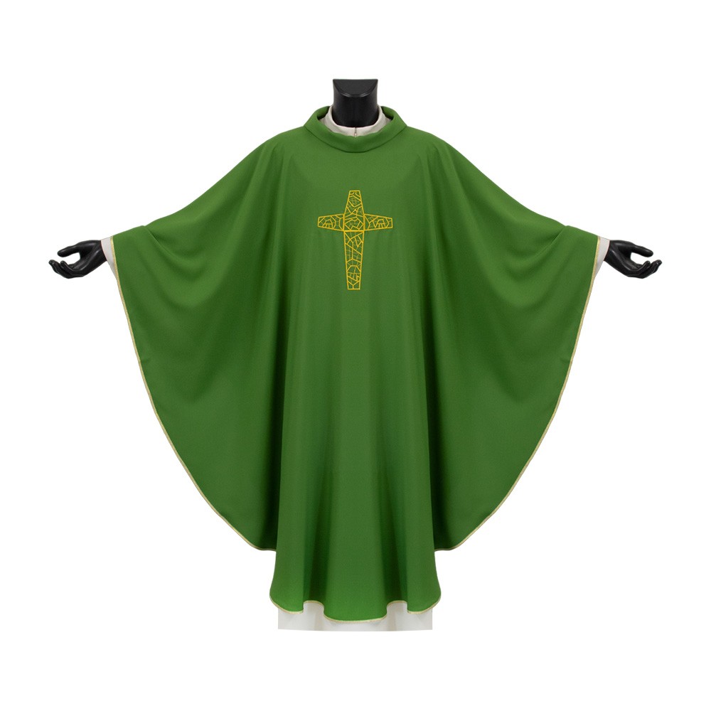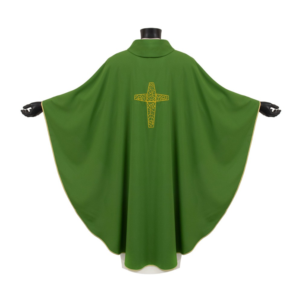 Casula sacerdotale verde con collo ad anello e croce ricamata.