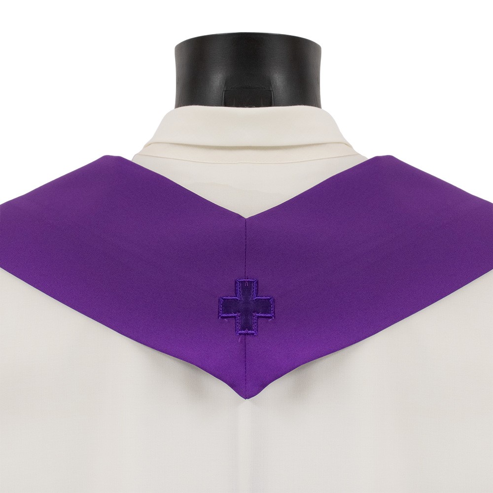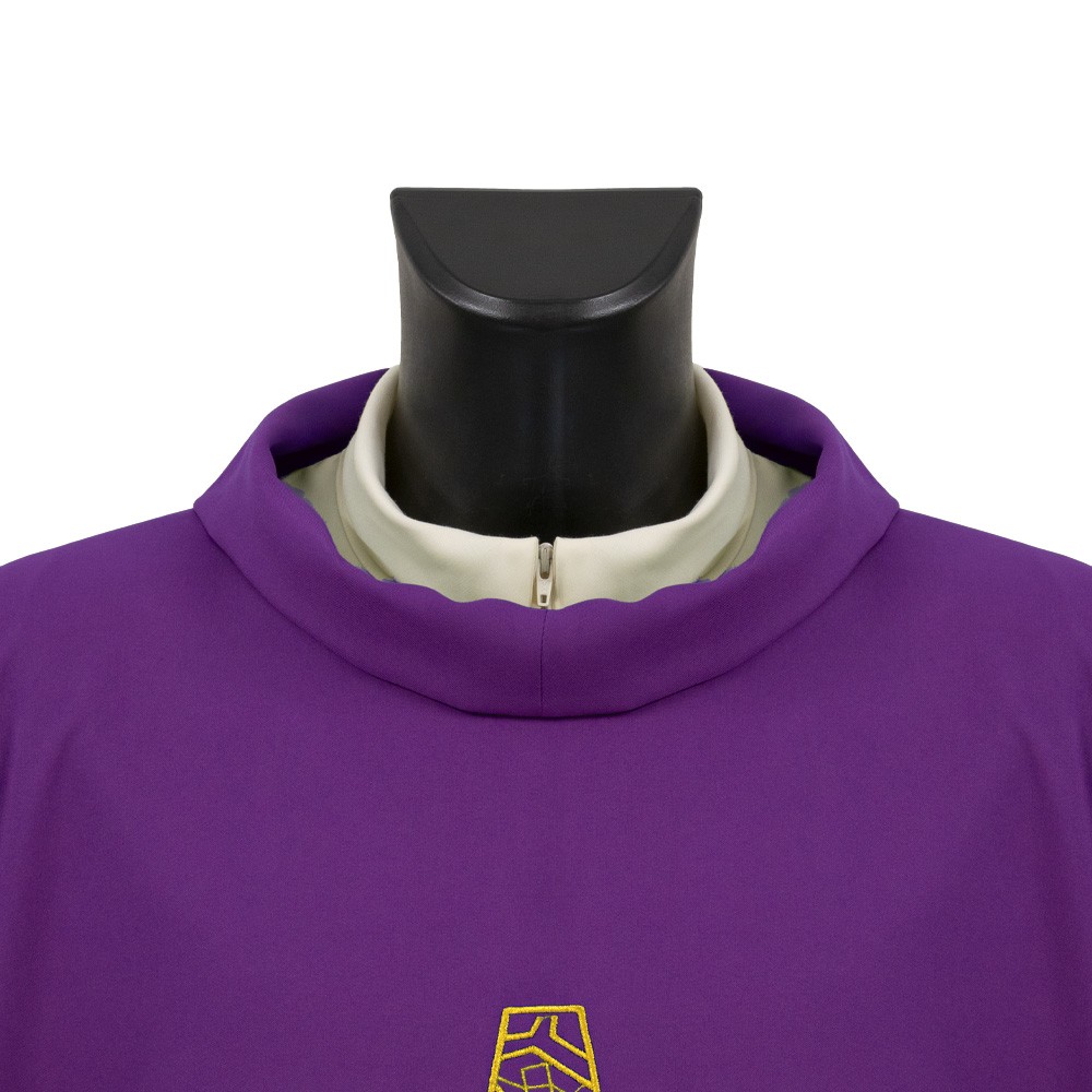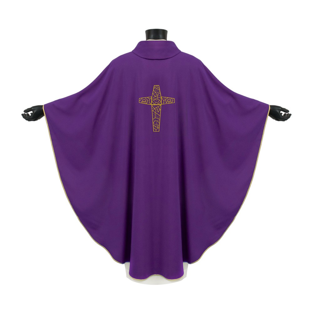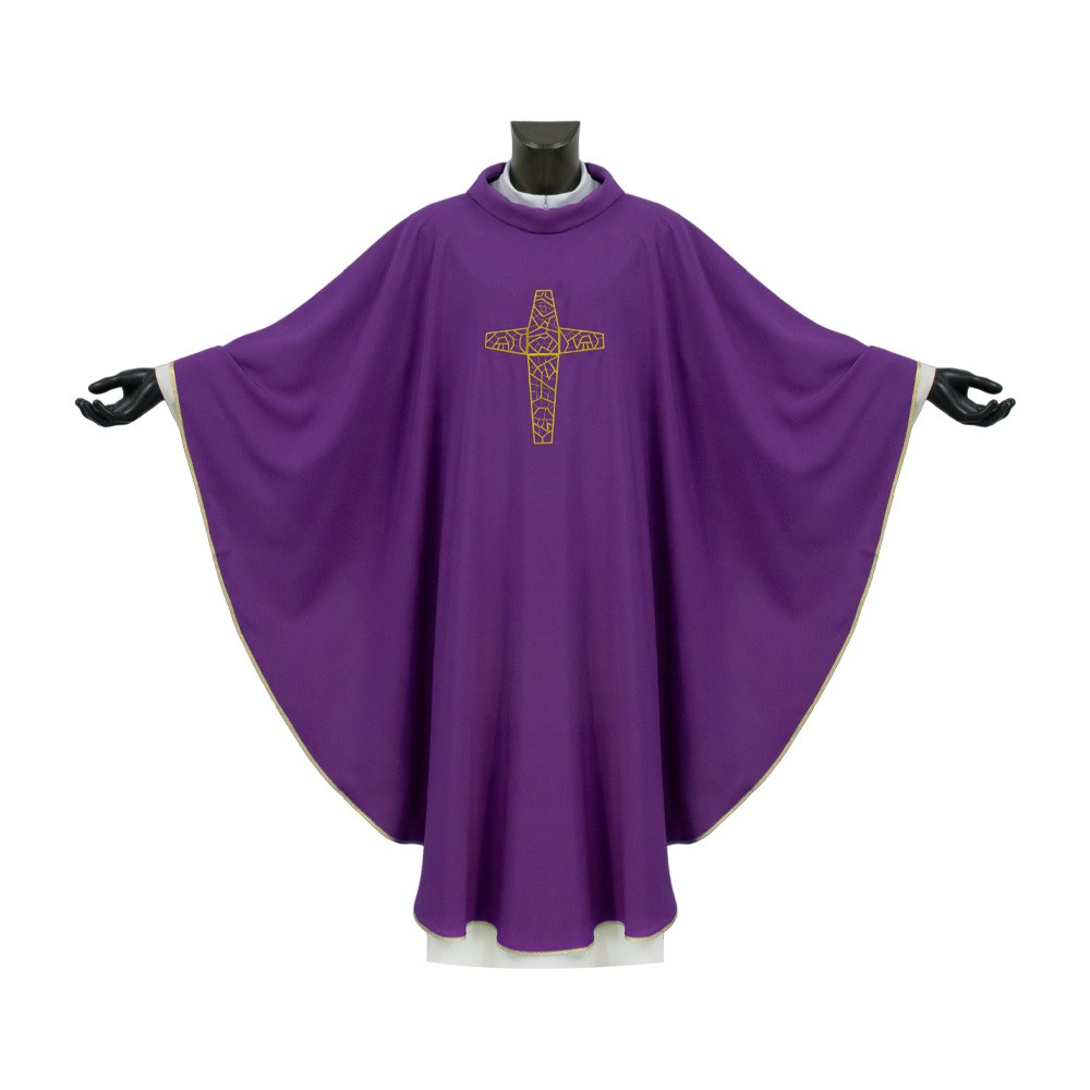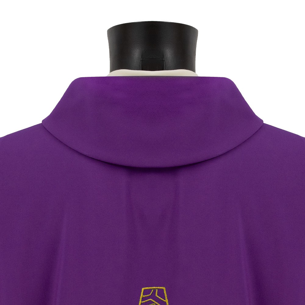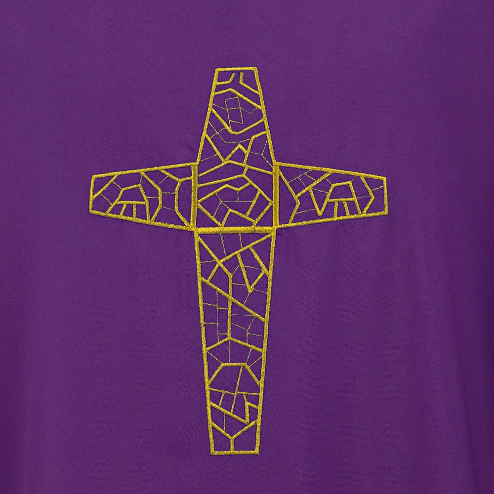 Casula liturgica viola ricamo croce, confezionata in fresco e resistente poliestere.