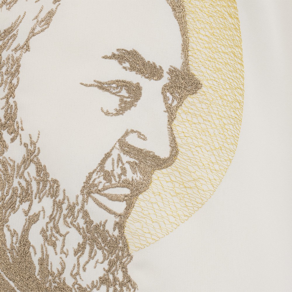 Ricamo con monogramma mariano applicato direttamente sul tessuto.