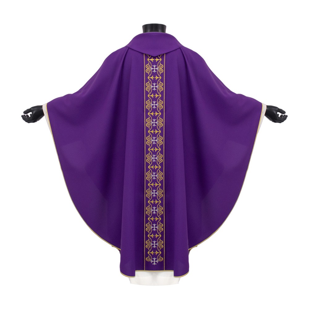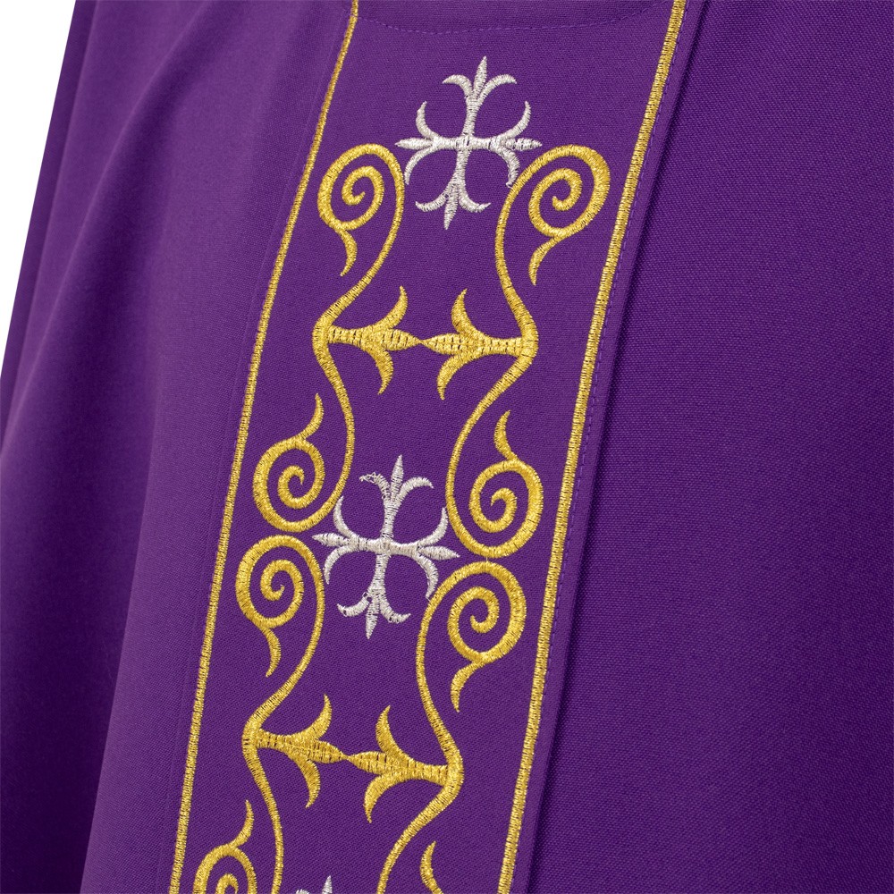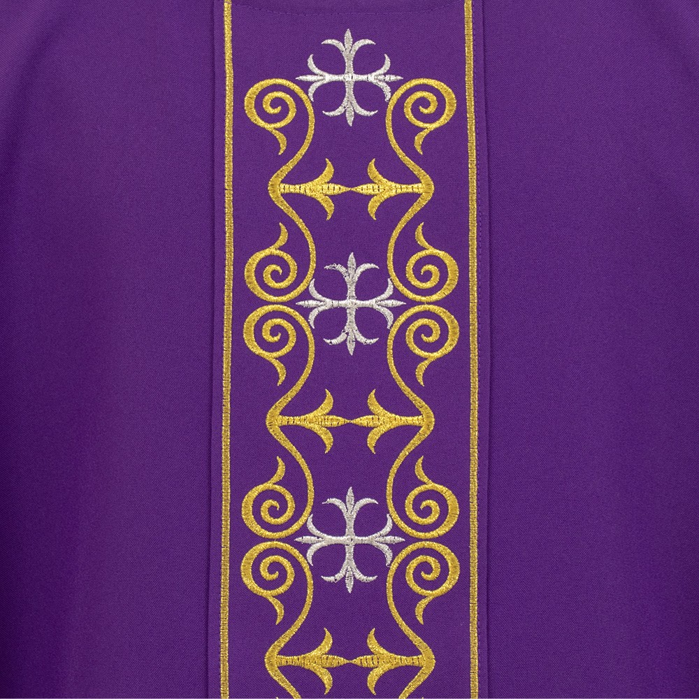 Casula liturgica viola ideale per l'Avvento con stolone ricamato, realizzata in leggero tessuto poliestere.