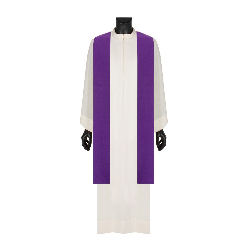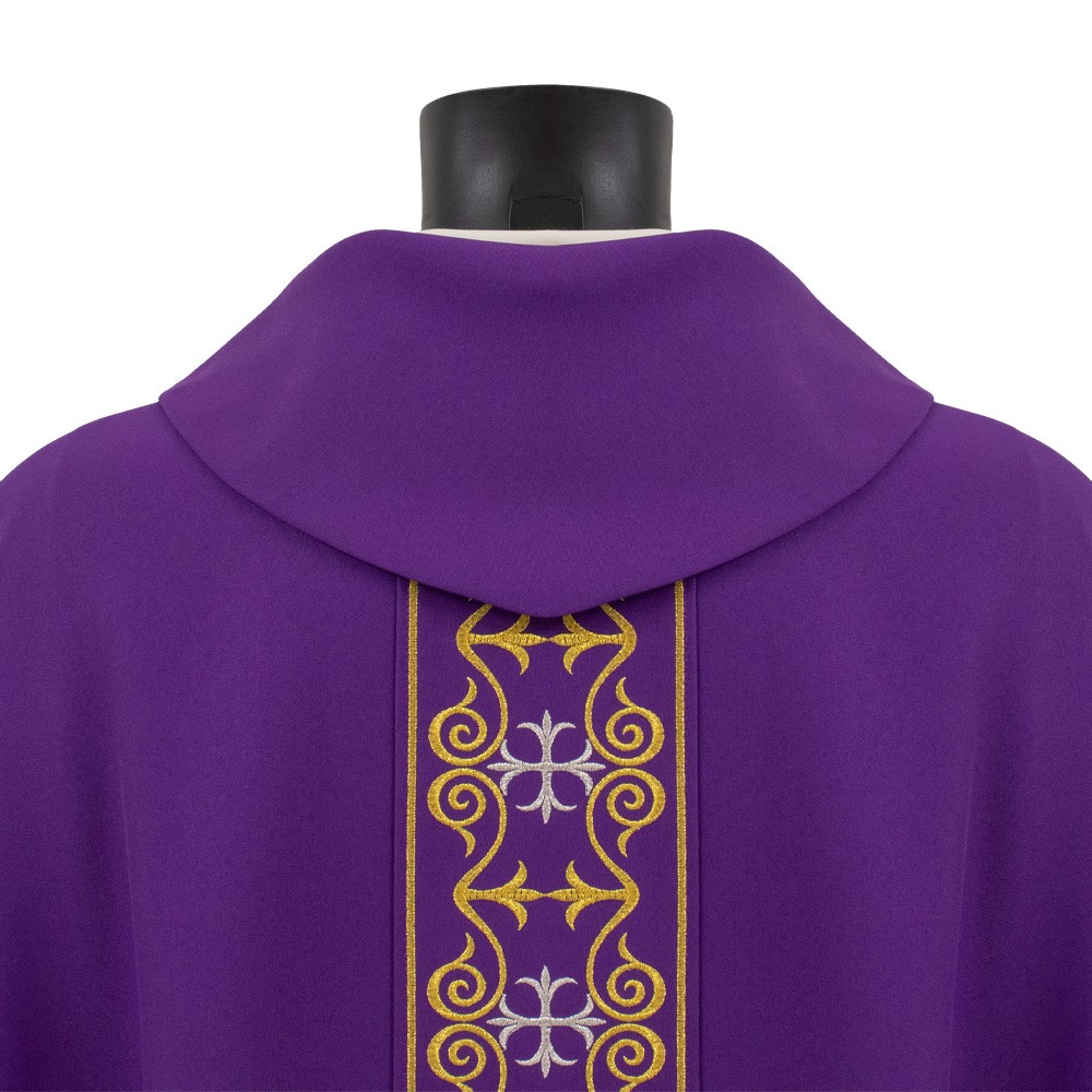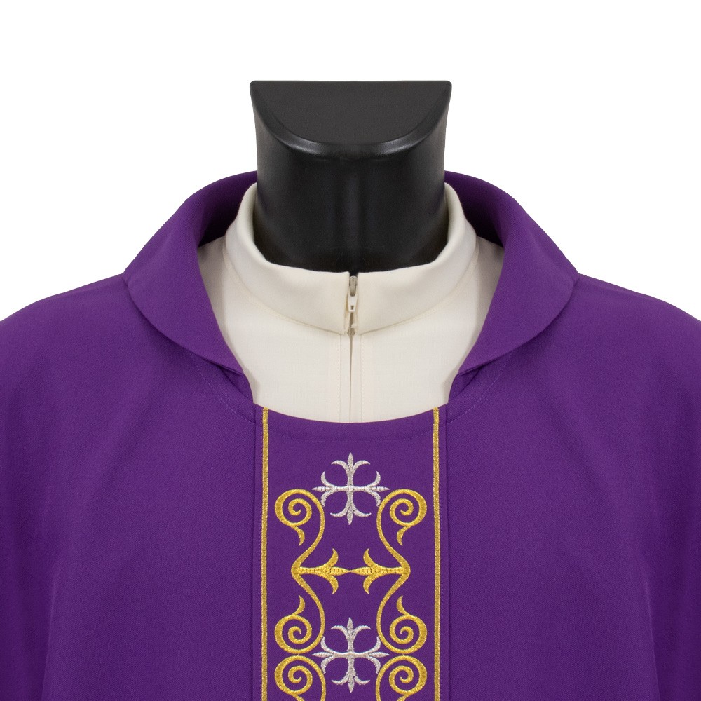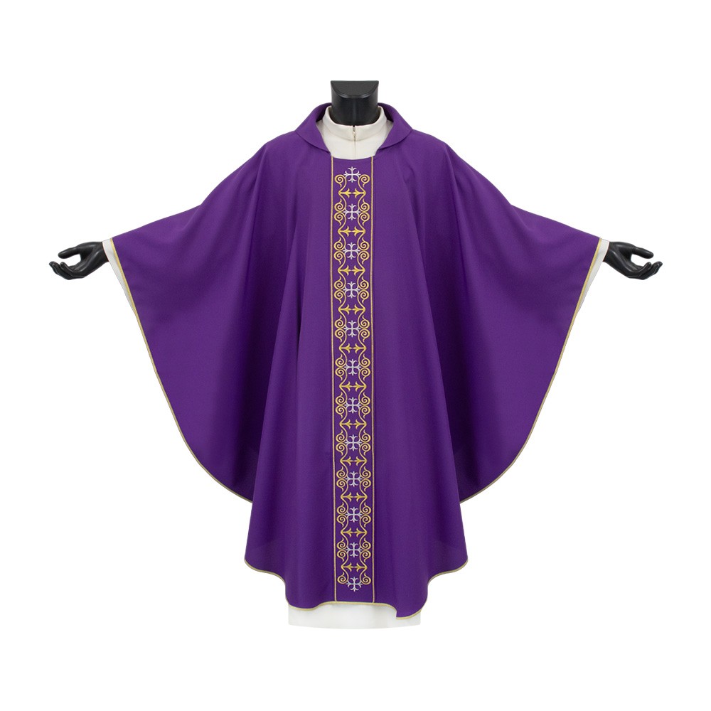 Casula liturgica viola ideale per l'Avvento con stolone ricamato, realizzata in leggero tessuto poliestere.