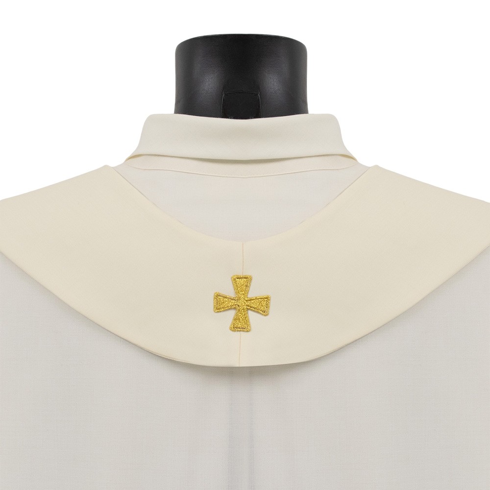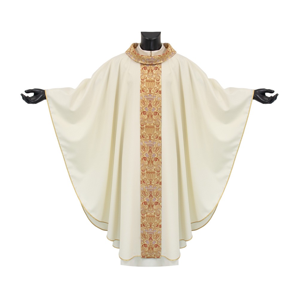 La casula è rifinita con sbieco dorato che rifinisce tutte le cuciture.