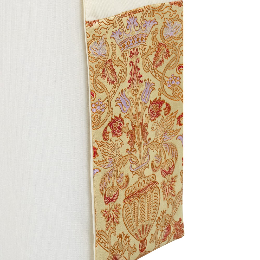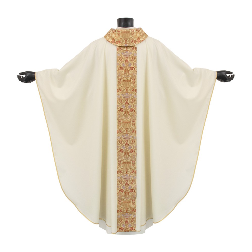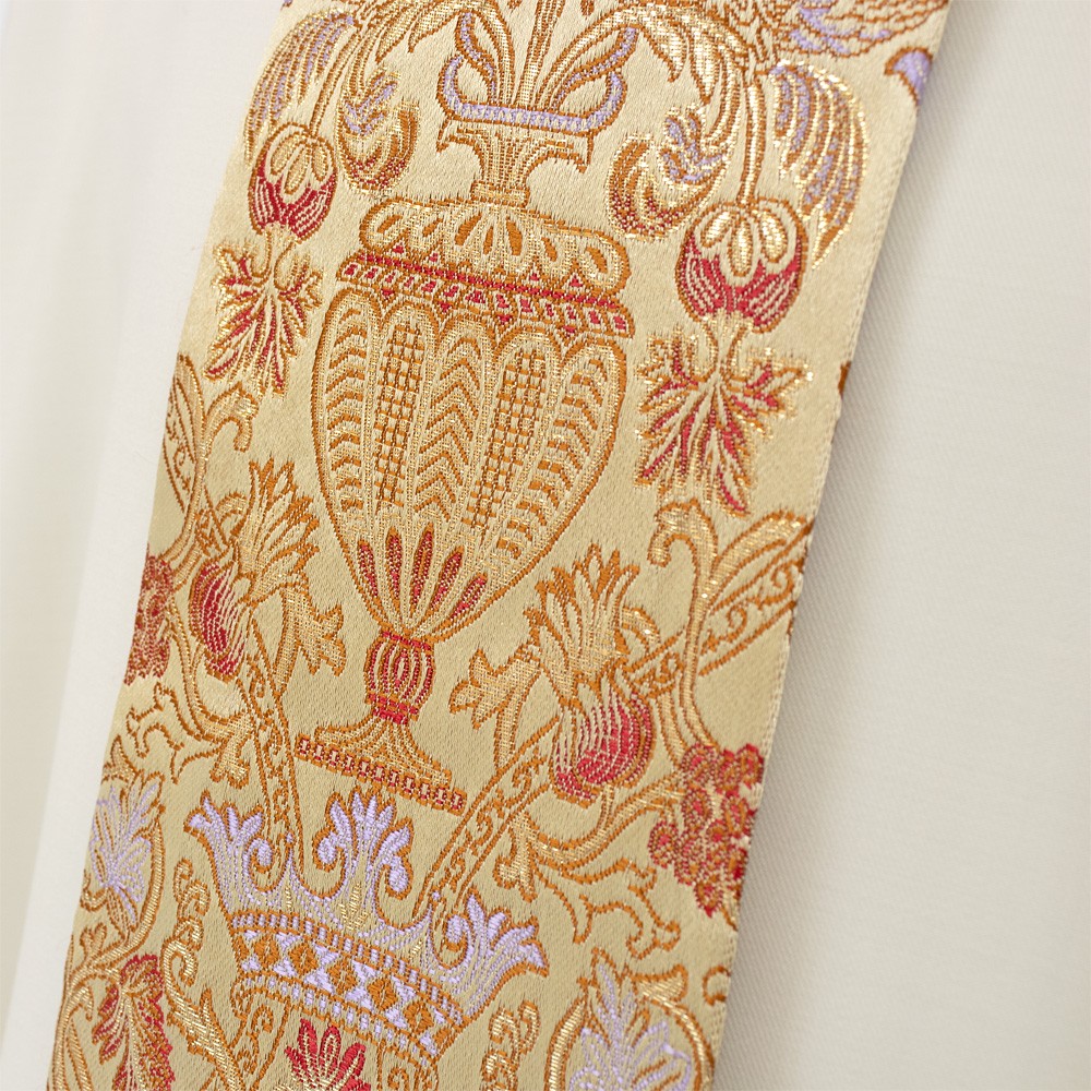 Il paramento è confezionato in tessuto saglia pura lana, mentre lo stolone e il collo sono in pregiato lampasso motivo "giardino anfora", un tessuto operato con disegni grandi prodotti dalla trama di uno o più colori.