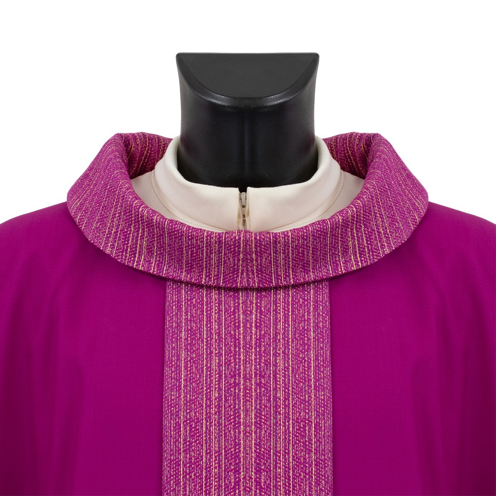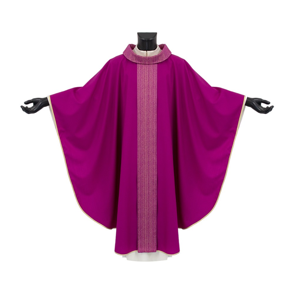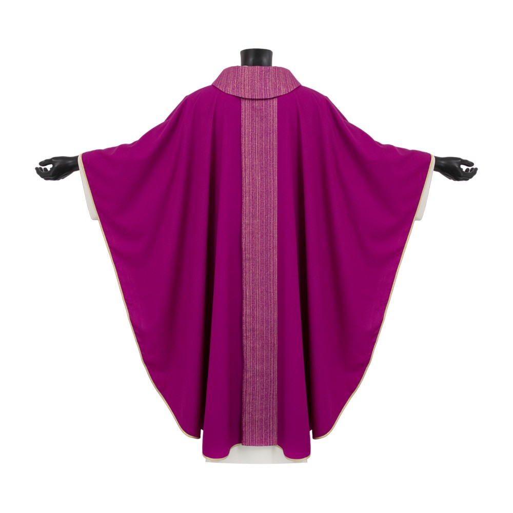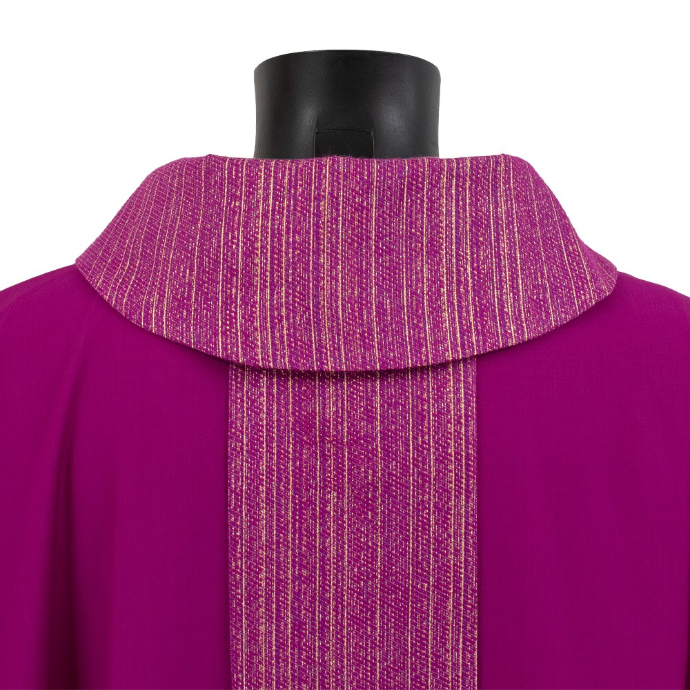 Casula liturgica morello con collo ad anello e stolone in tessuto rigato.