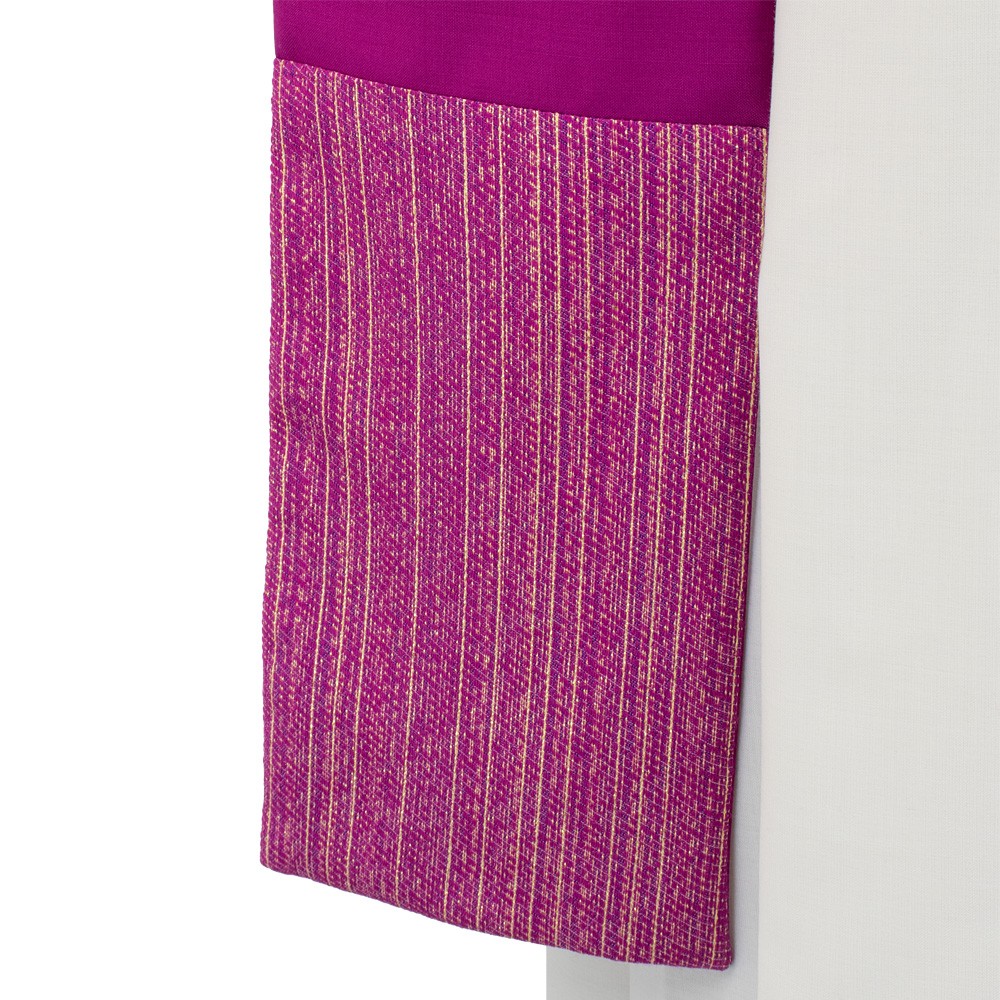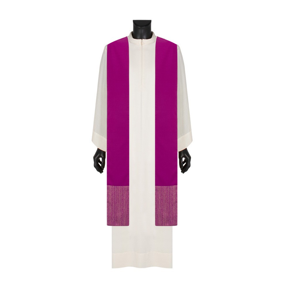 La stola sacerdotale abbinata alla casula è realizzata con lo stesso tessuto e riporta su entrambi i lembi il tessuto rigato.