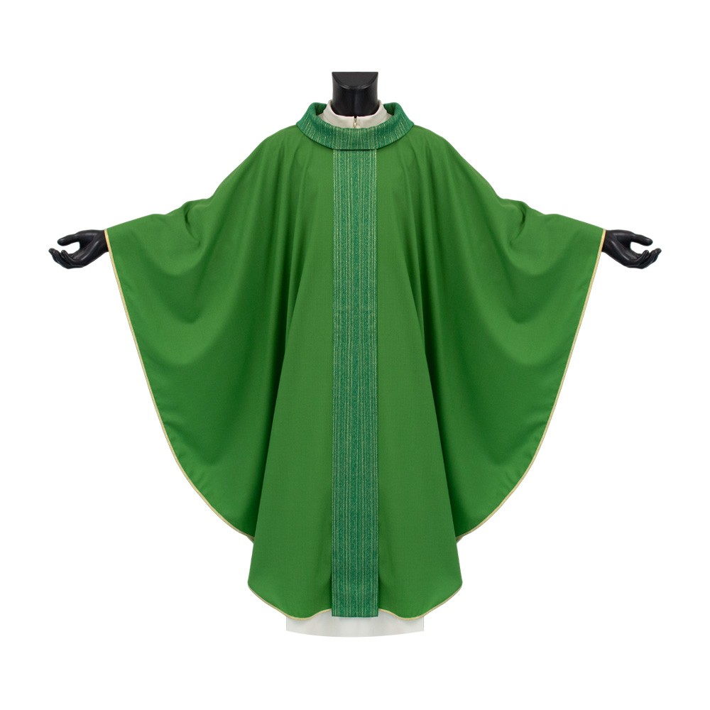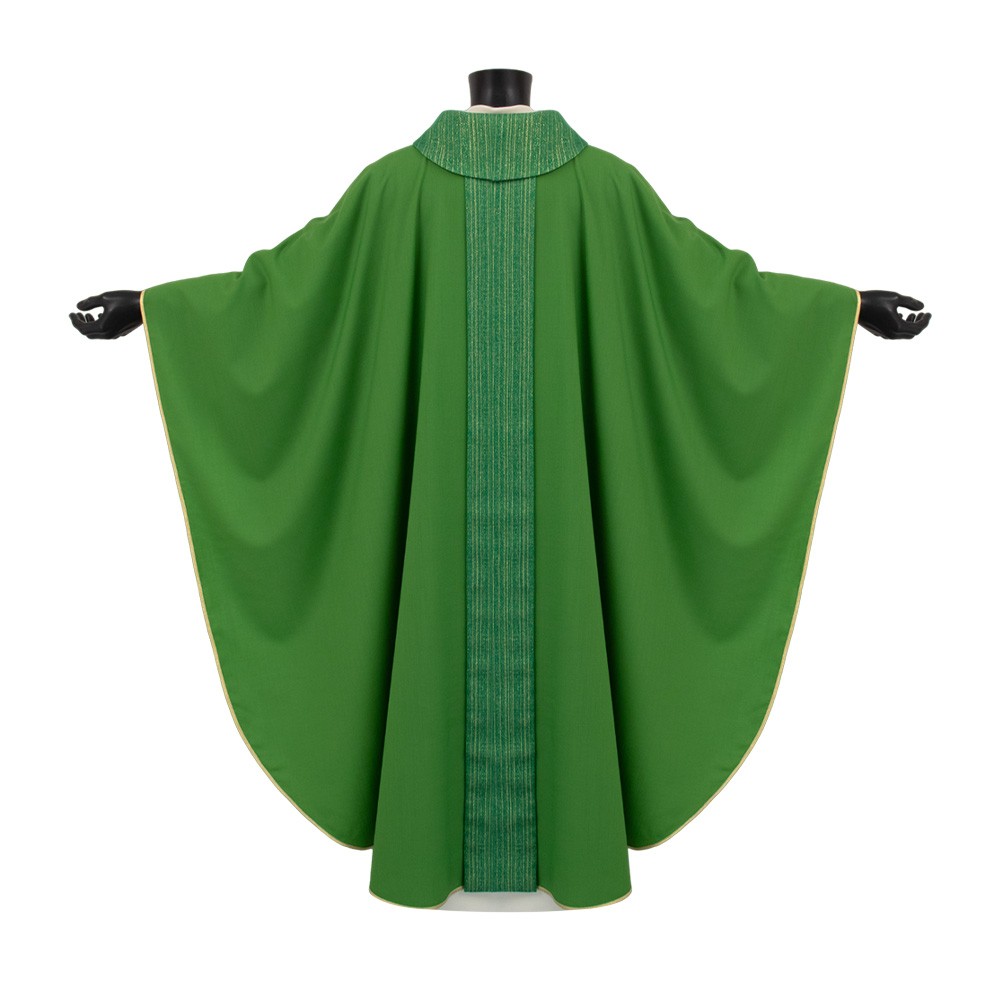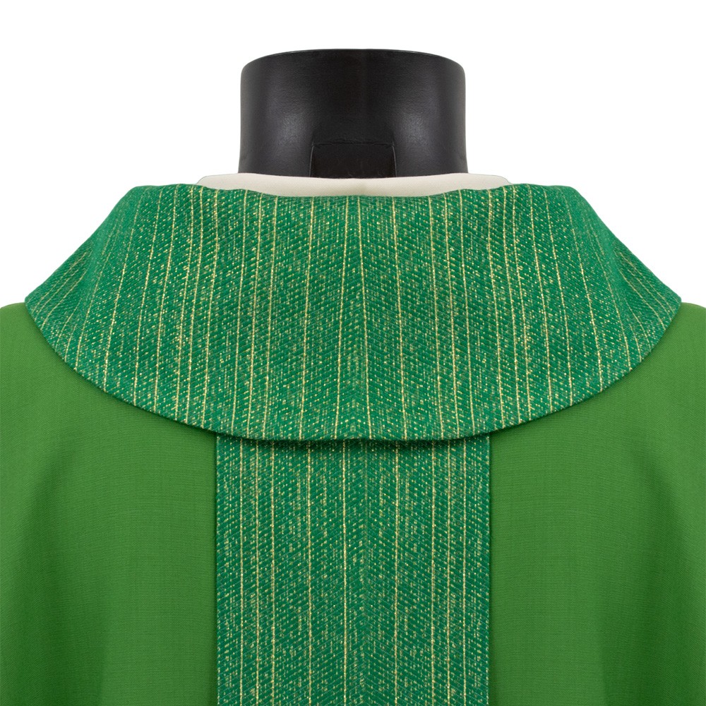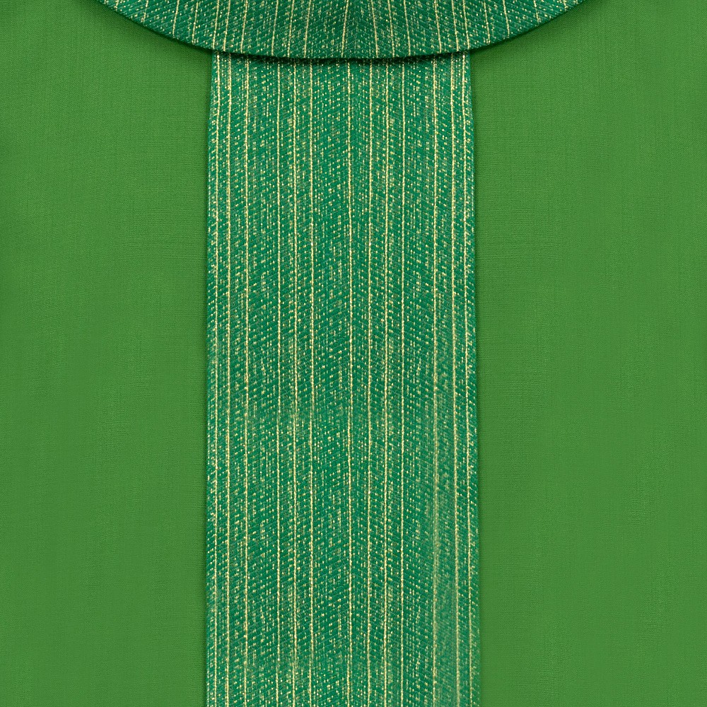 Casula sacerdotale verde con collo ad anello e stolone rigato.