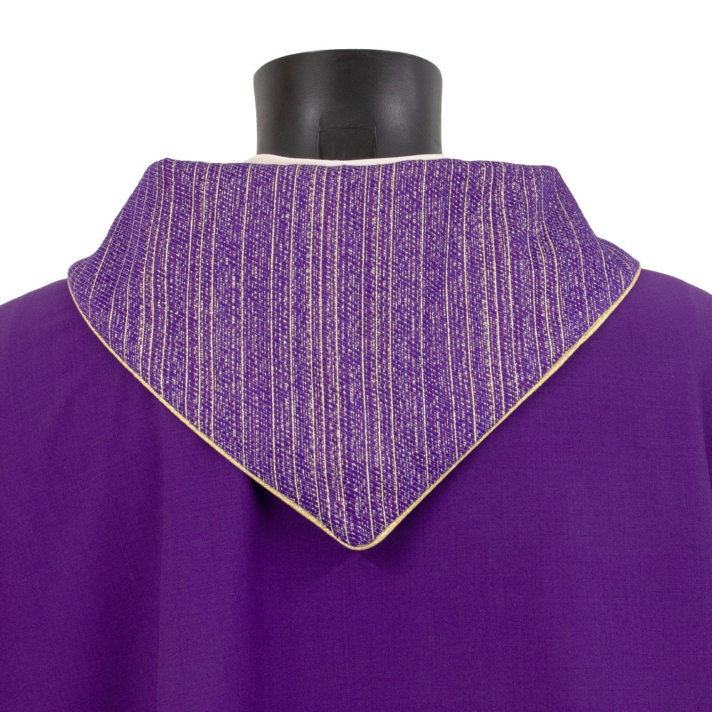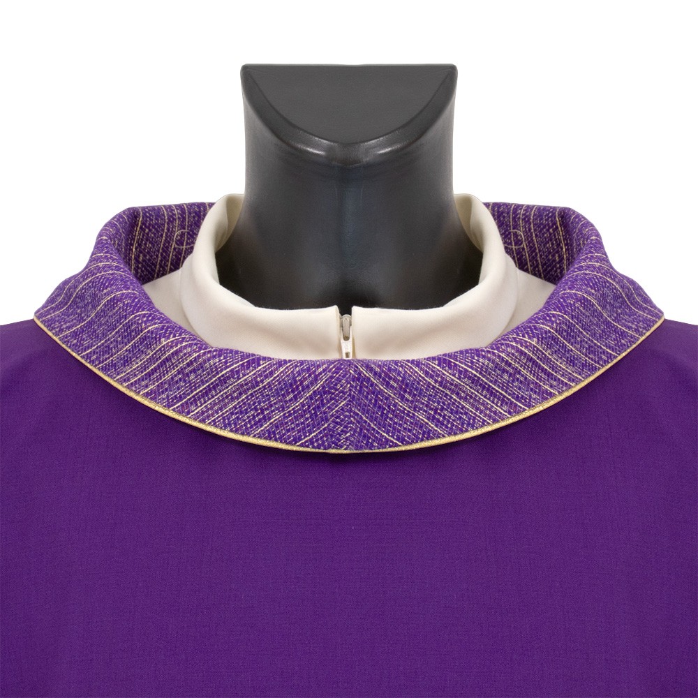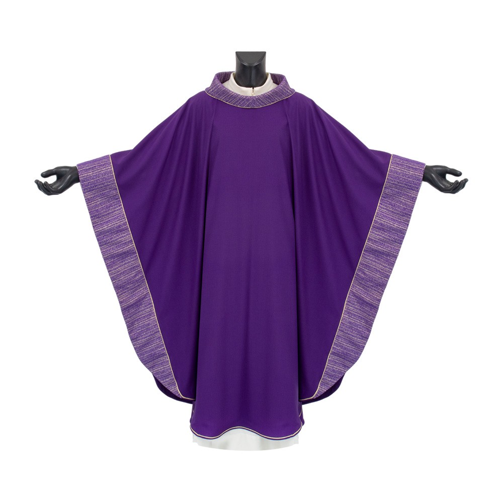 Elegante casula sacerdotale viola con collo ad anello e bande laterali rigate.
