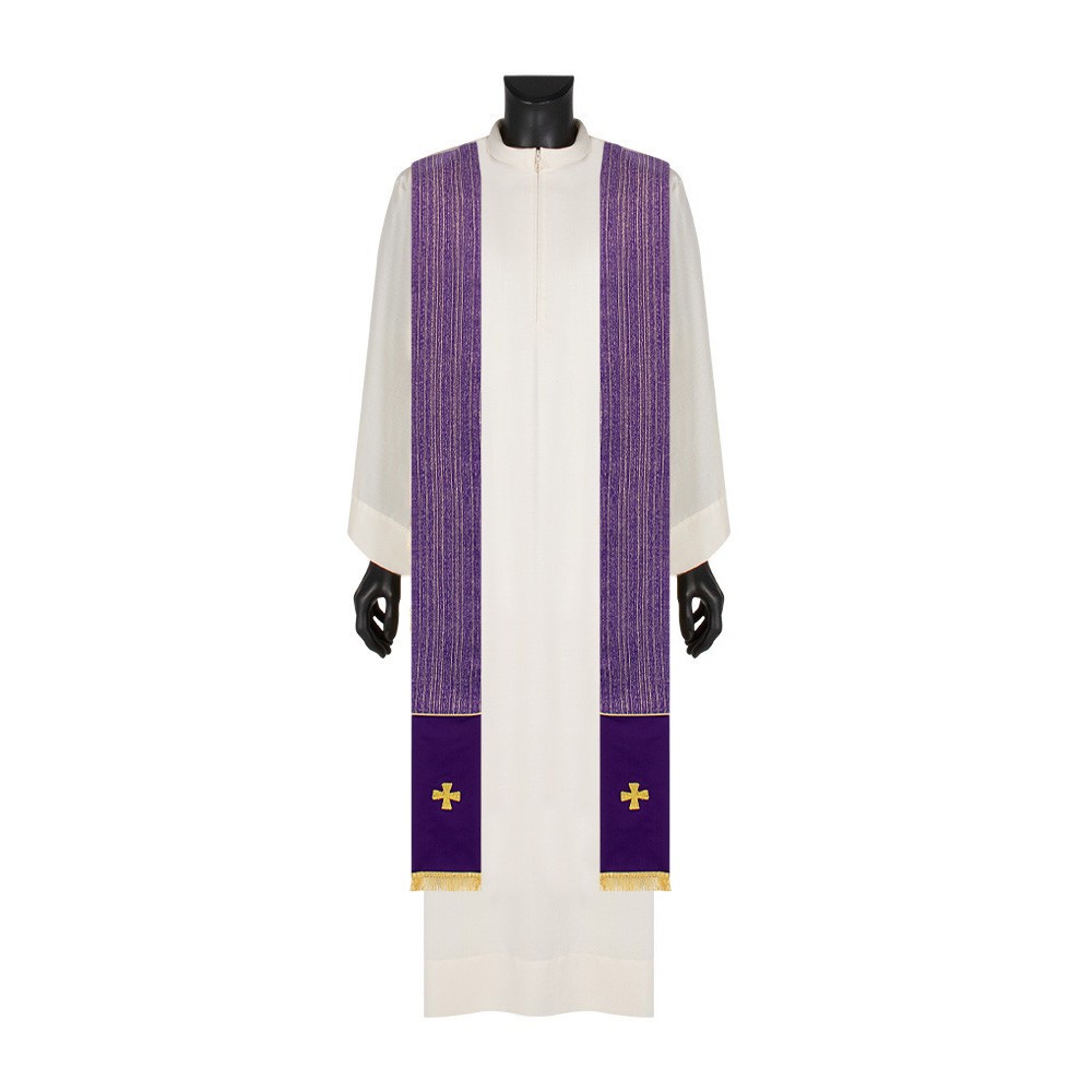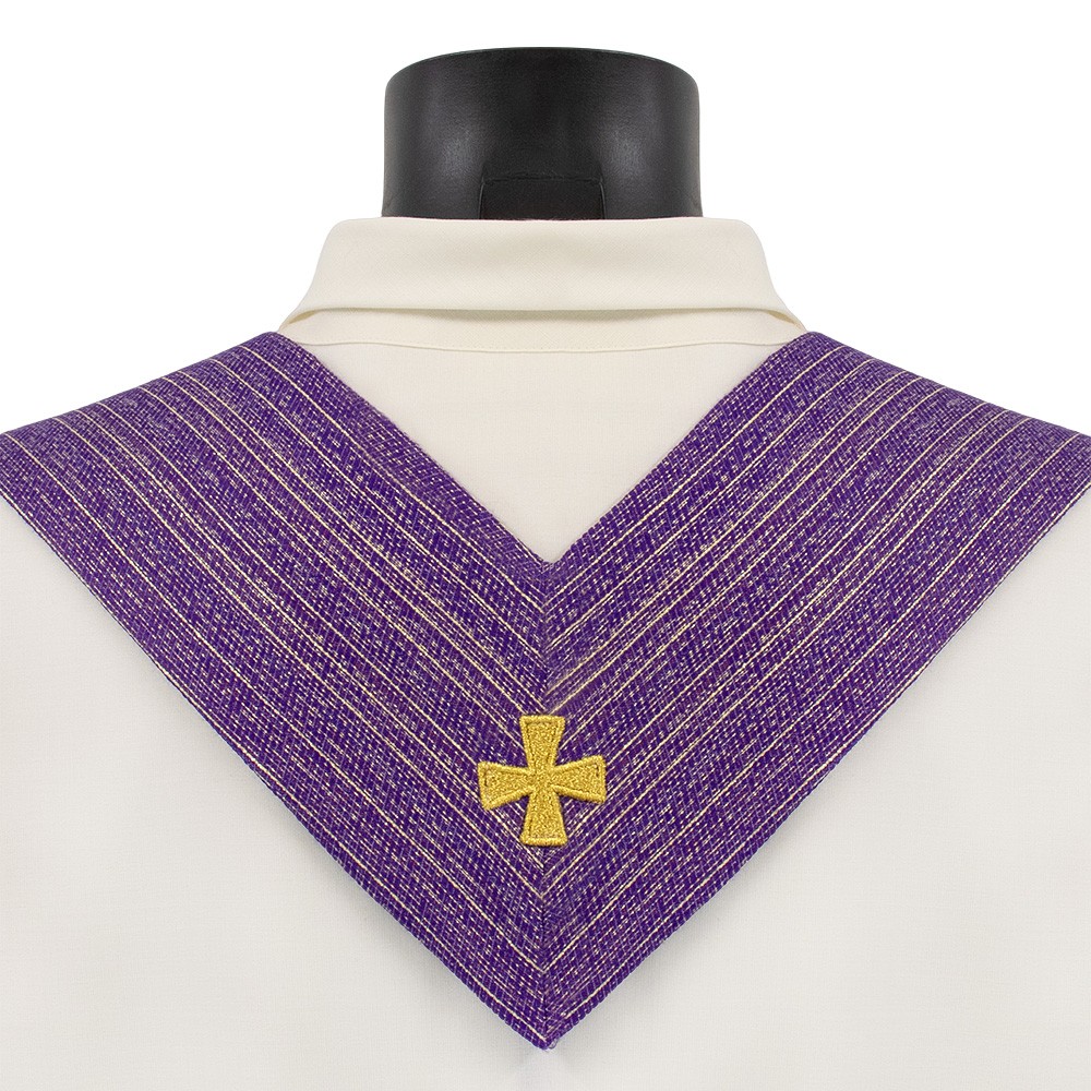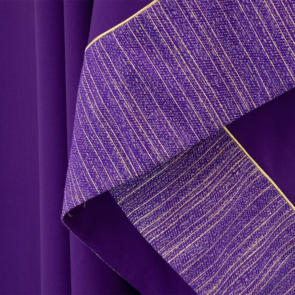 Casula liturgica viola dal design essenziale, con collo ad anello e stola abbinata rifinita con frangia dorata. Ideale per Avvento e Quaresima.