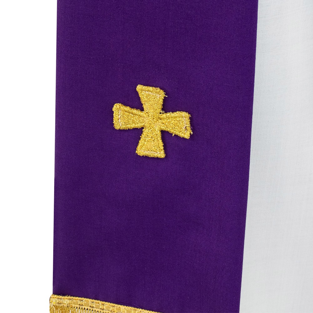 La casula è confezionata in tessuto misto con croci ricamate oro. Modello con collo ad anello e stola abbinata inclusa.
