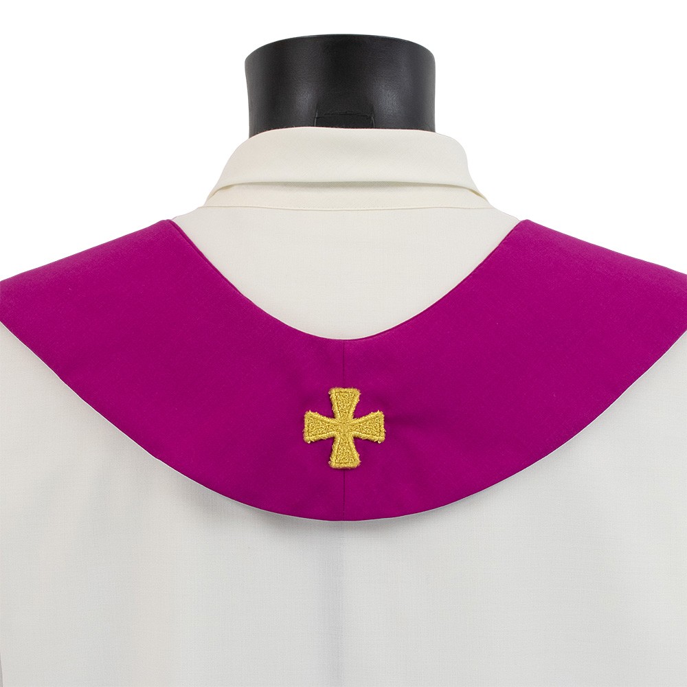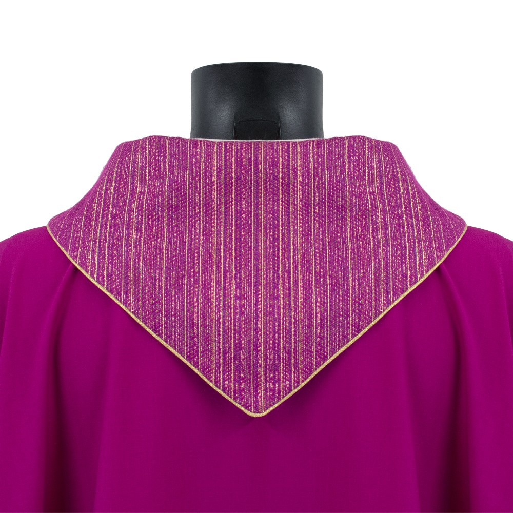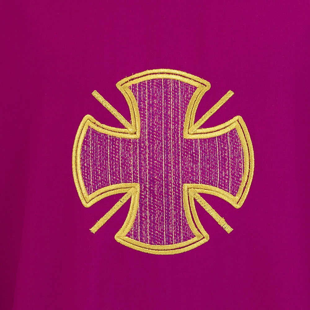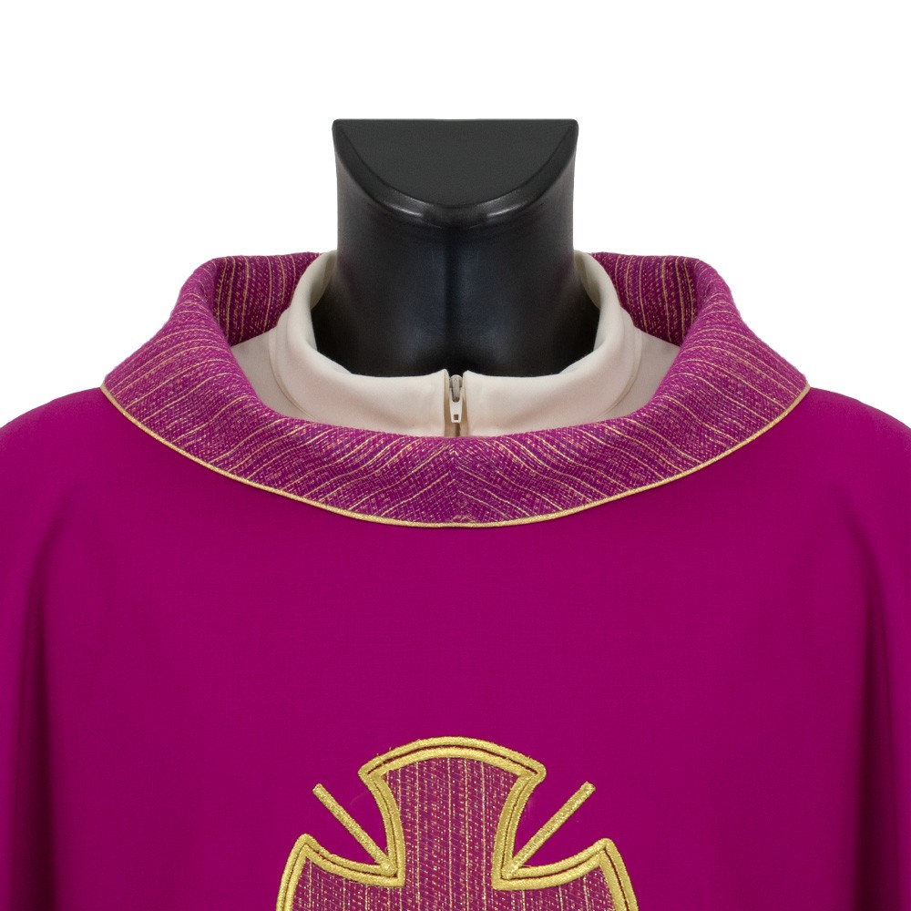 Casula liturgica di colore morello con collo ad anello e croce ricamata.