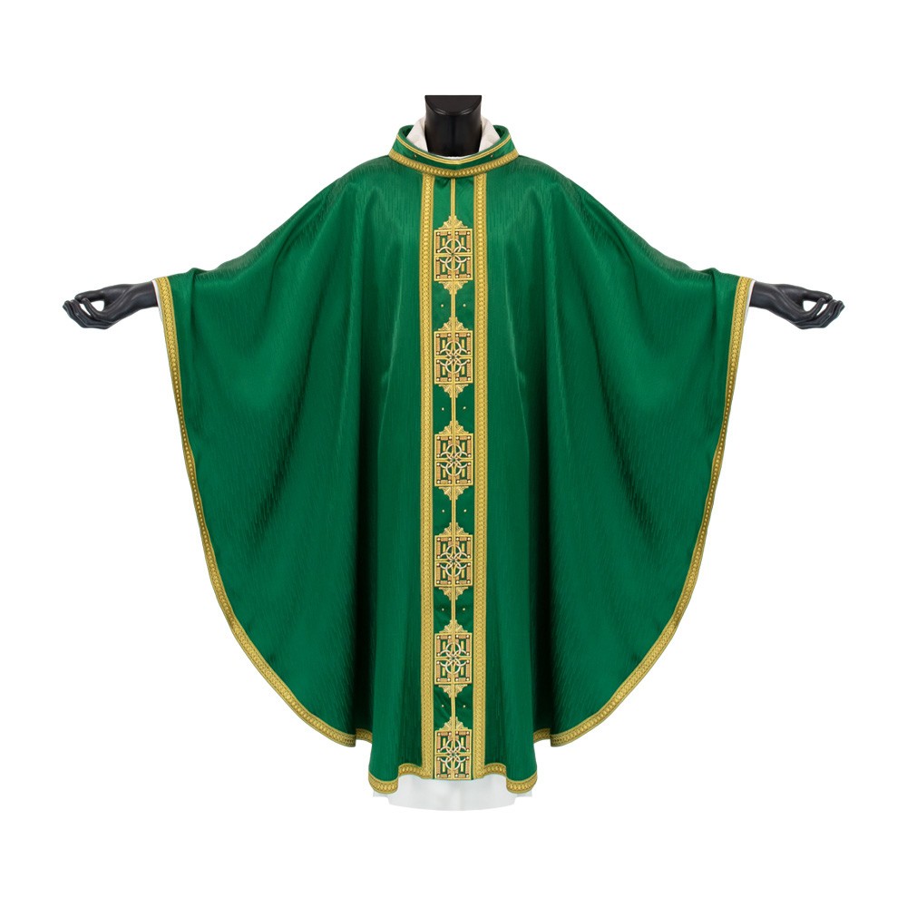 Il taglio ampio, il collo ad anello decorato, il tessuto utilizzato mettono il risalto la qualità e l'eleganza di questa veste sacra.