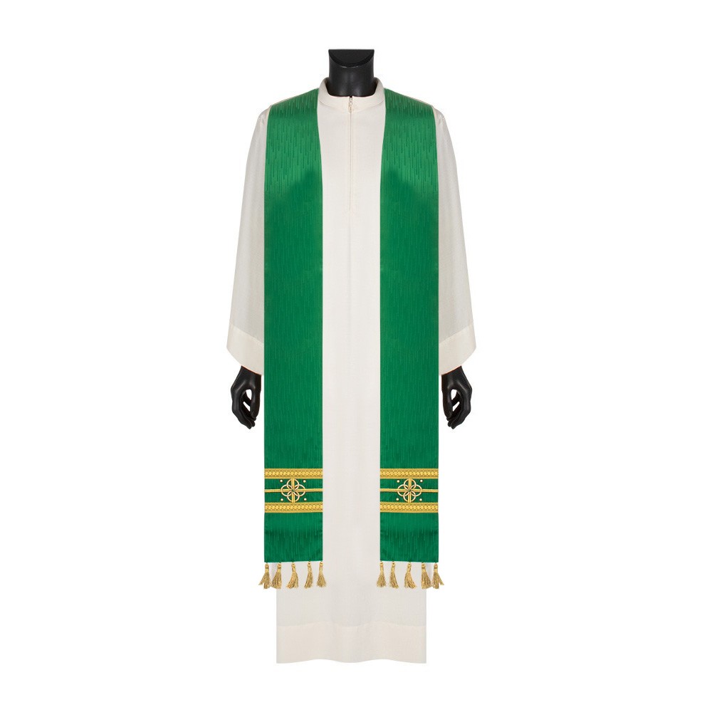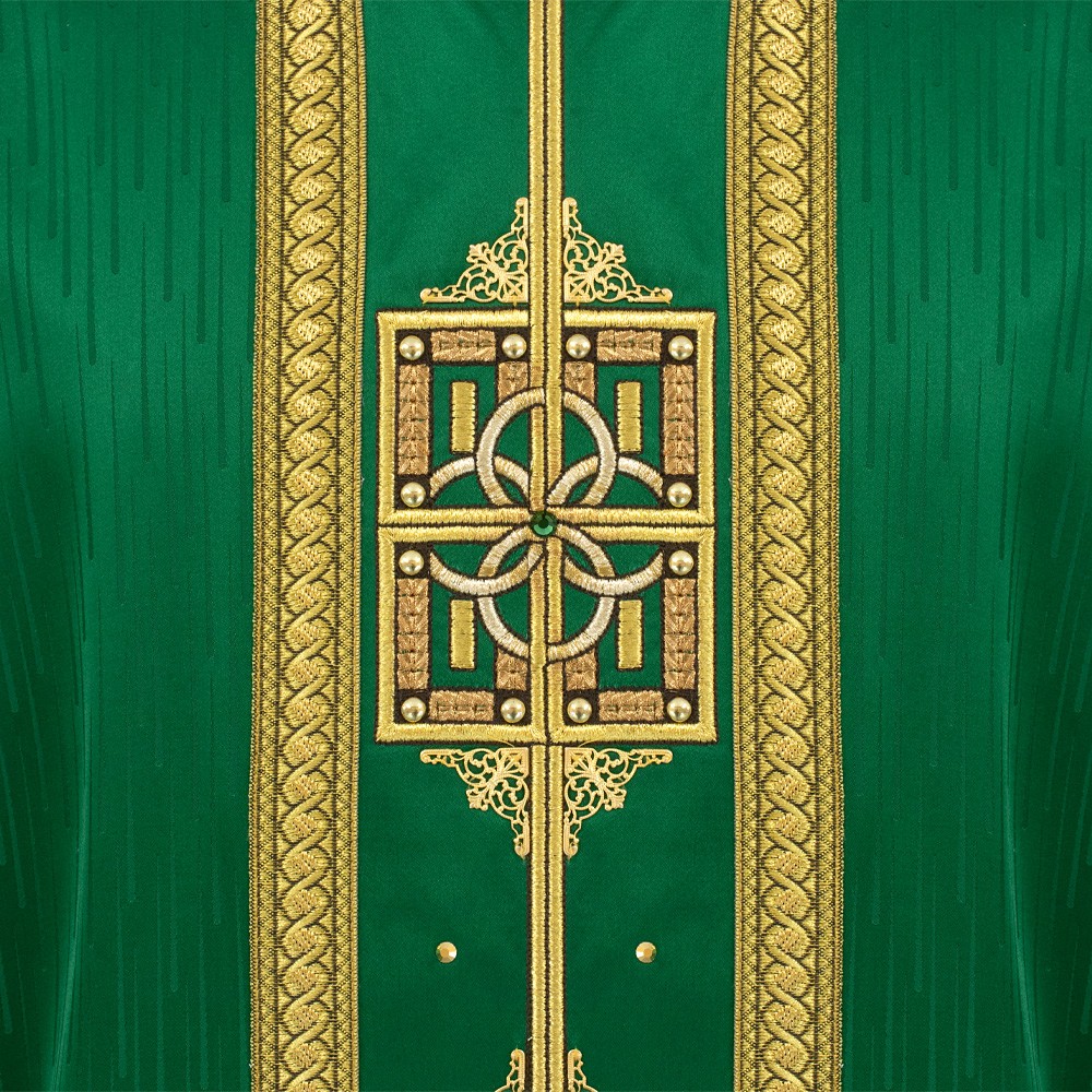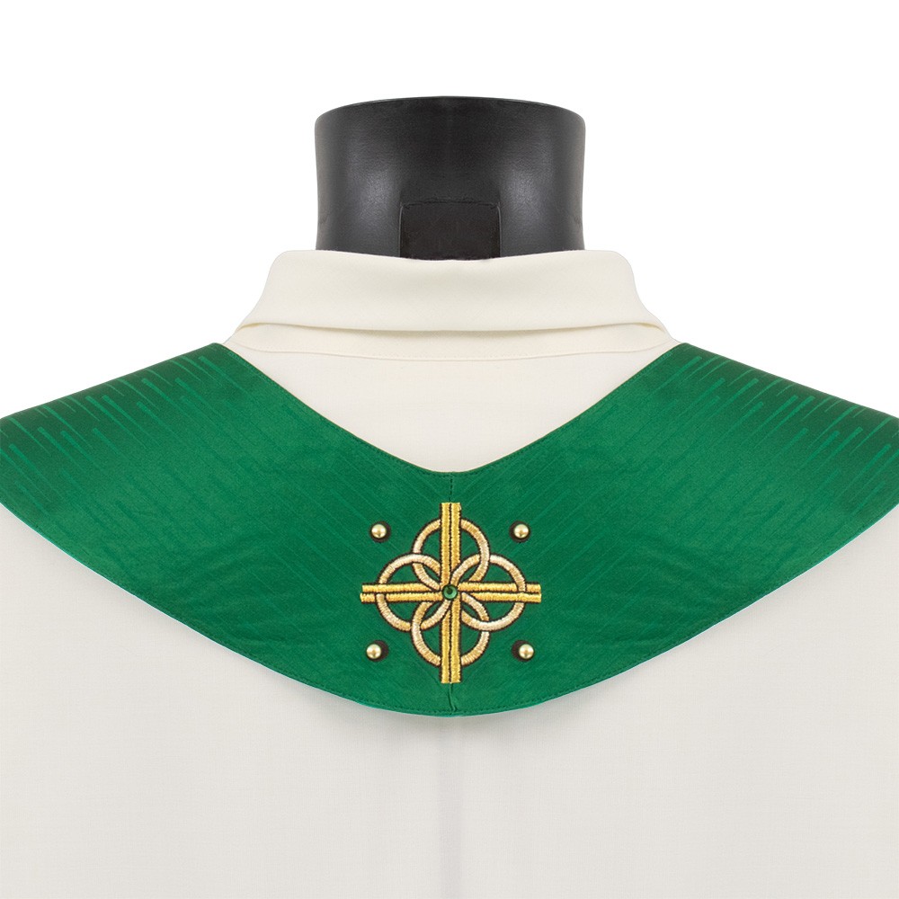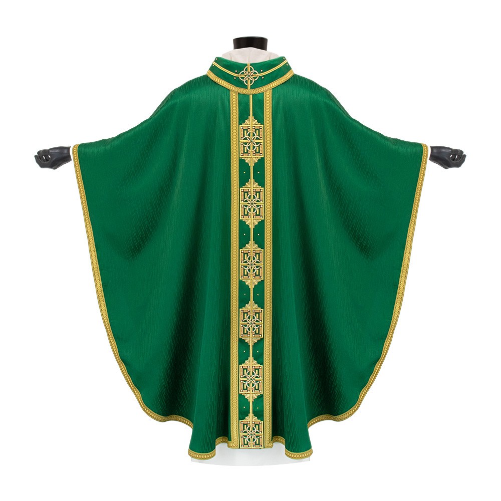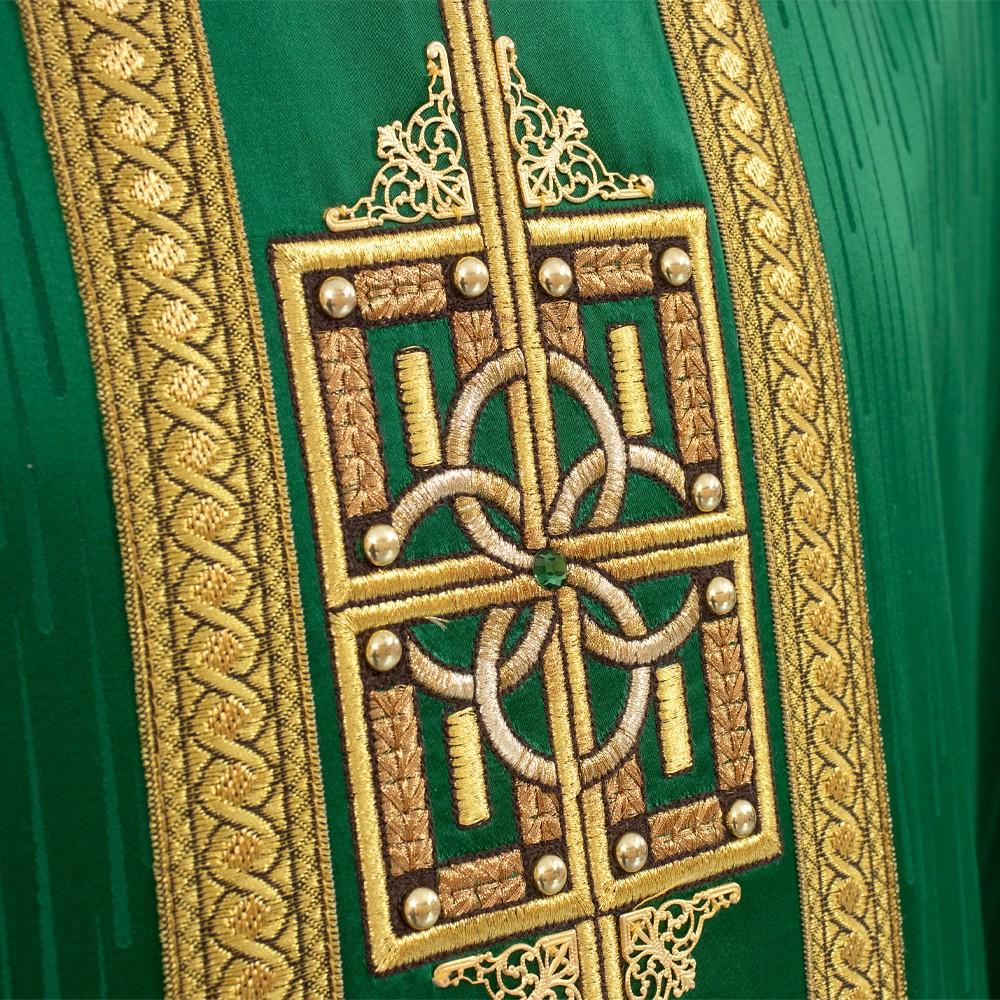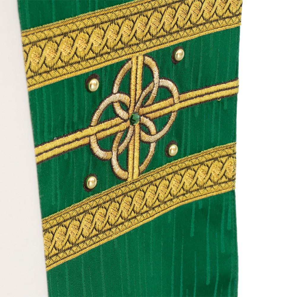 Casula sacerdotale arricchita da un elegante stolone in raso misto seta e ricamata a mano in oro. Raffinatezza e qualità Made in Italy.