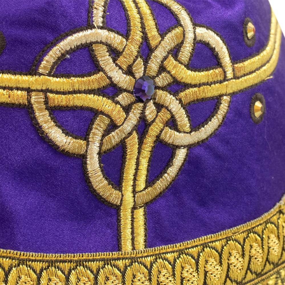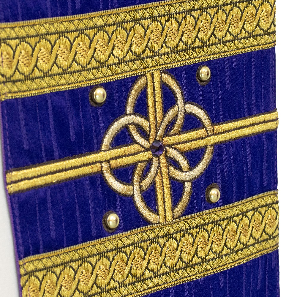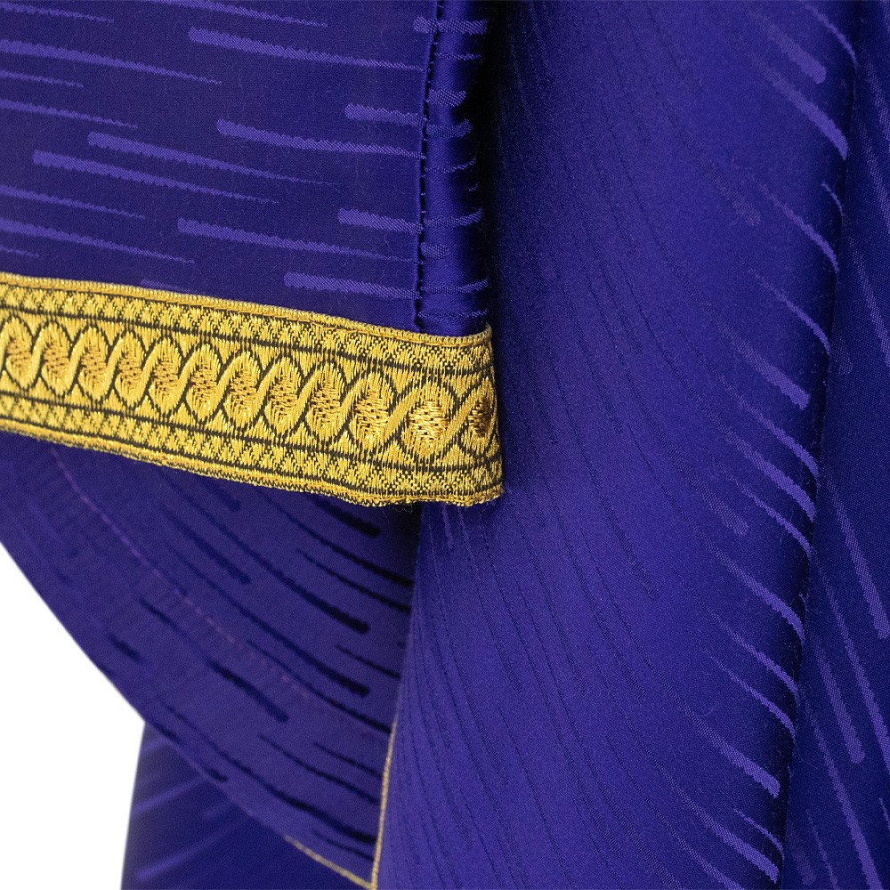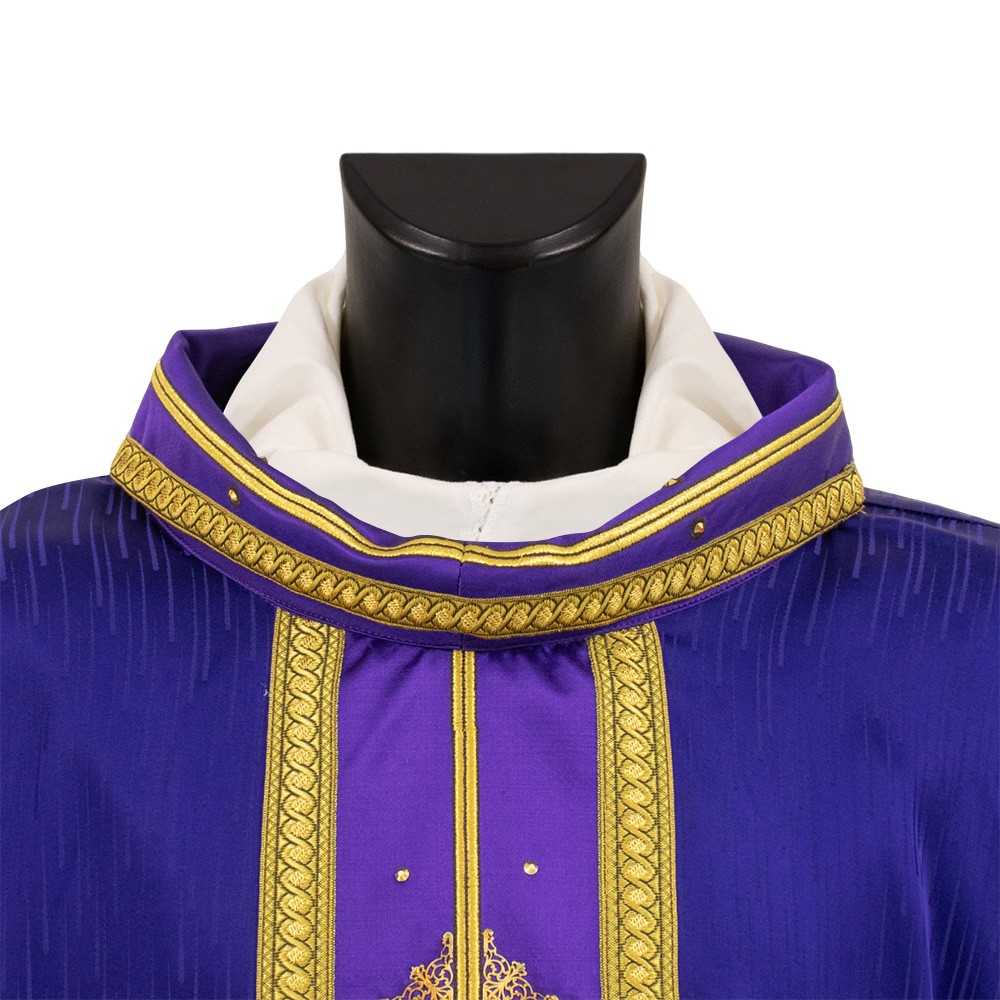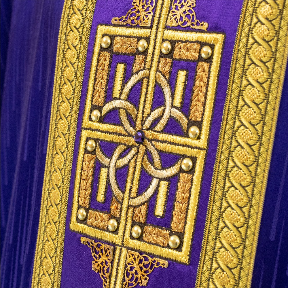 Casula sacerdotale di colore viola realizzata in tessuto pregiato composto da acetato e viscosa, caratterizzato da un elegante effetto pioggia. Lo stolone, presente sia sul fronte che sul retro, è decorato tono su tono con raffinati motivi geometrici, arricchito da filati in oro, pietre, cristalli e applicazioni metalliche. Il collo ad anello riprende la stessa passamaneria dello stolone, conferendo armonia e eleganza al paramento liturgico.