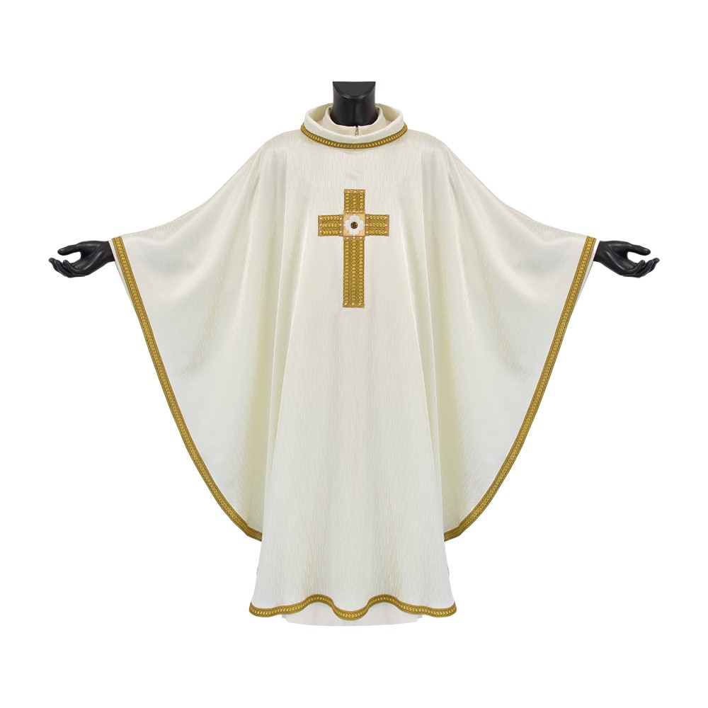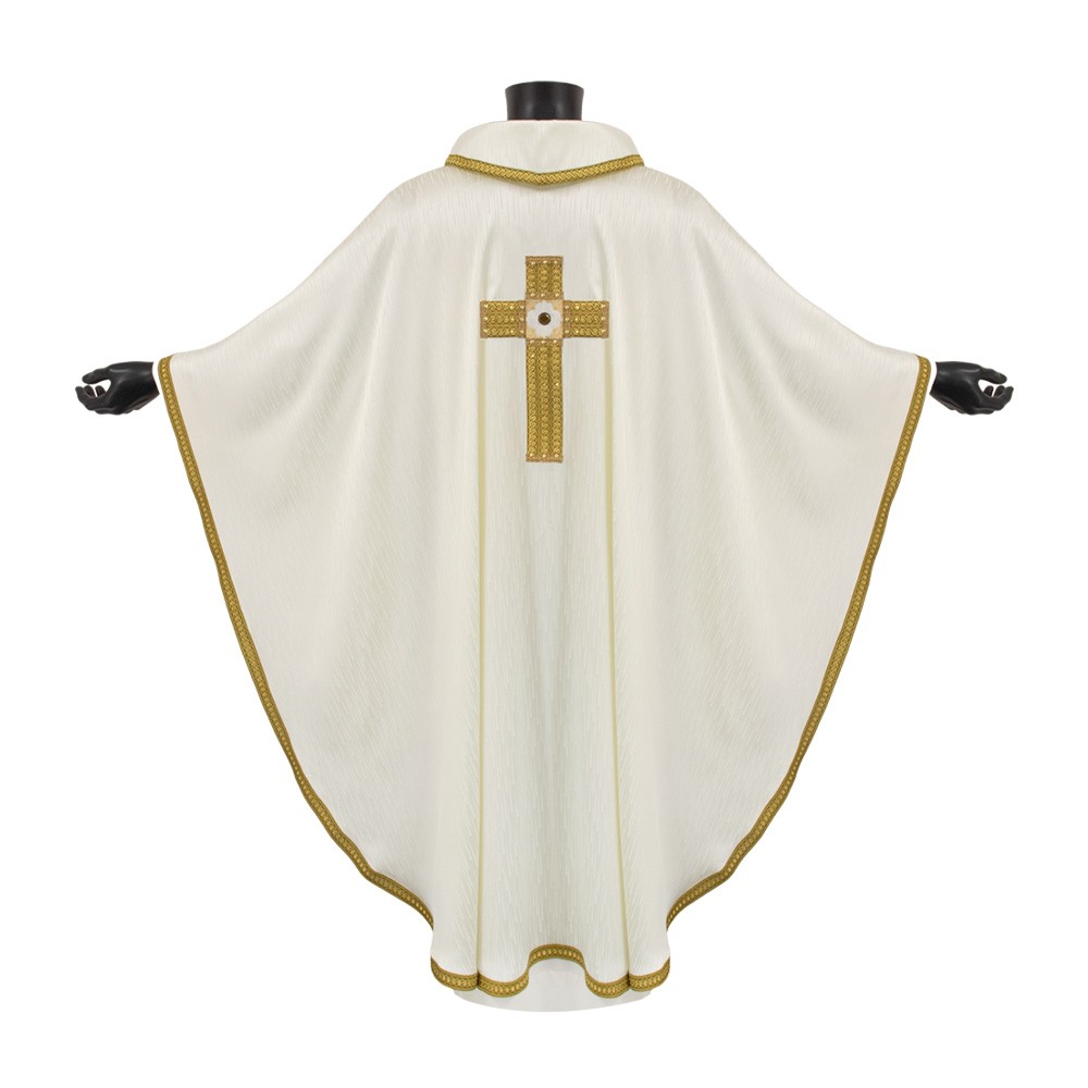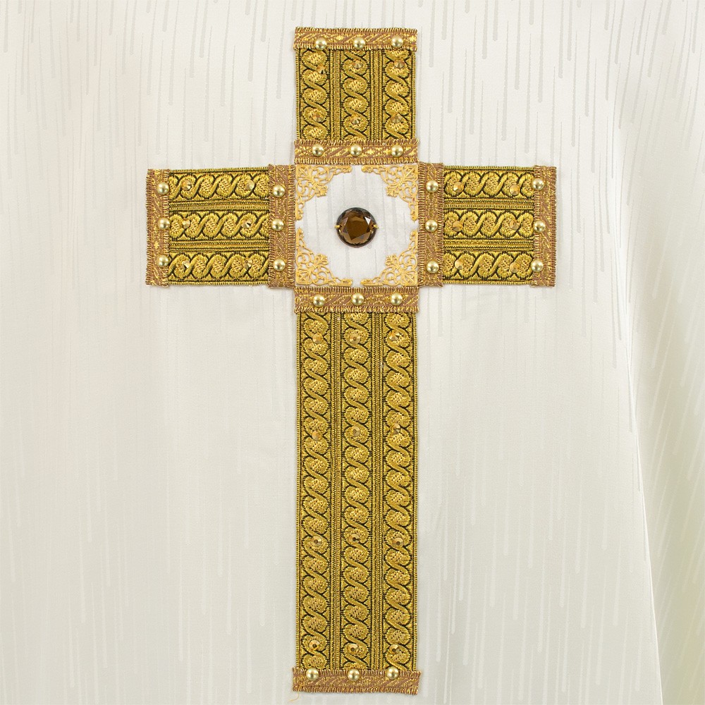 Pregiata casula sacerdotale color avorio prodotta su telai jacquard in tessuto misto 66% acetato e 34% viscosa.