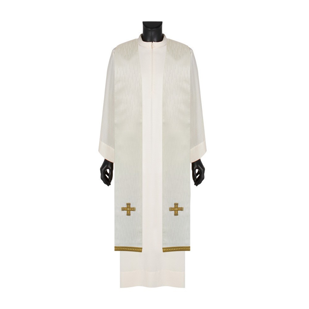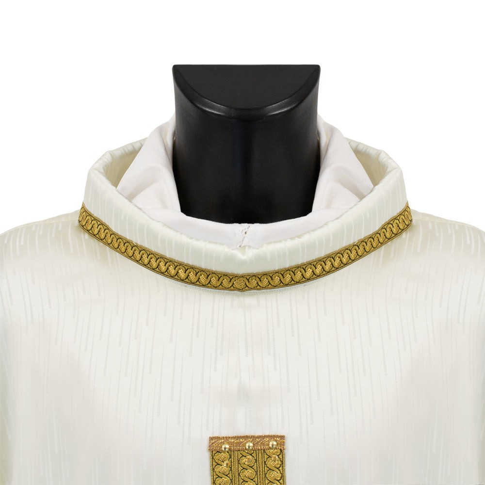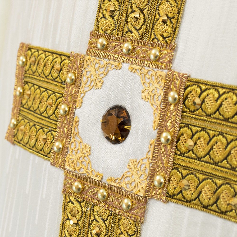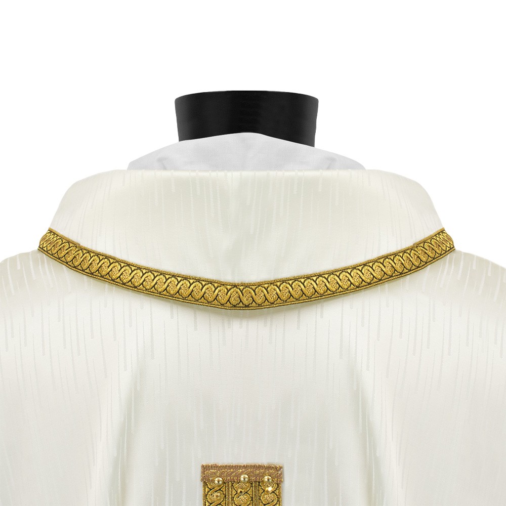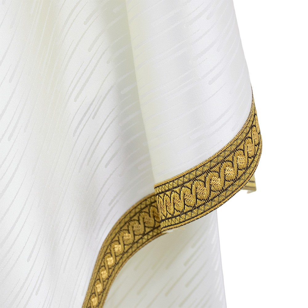Lungo tutto il perimetro della veste liturgica vi è riportato un elegante bordino dorato che rifinisce tutte le cuciture, mettendo in risalto qualità e eleganza.