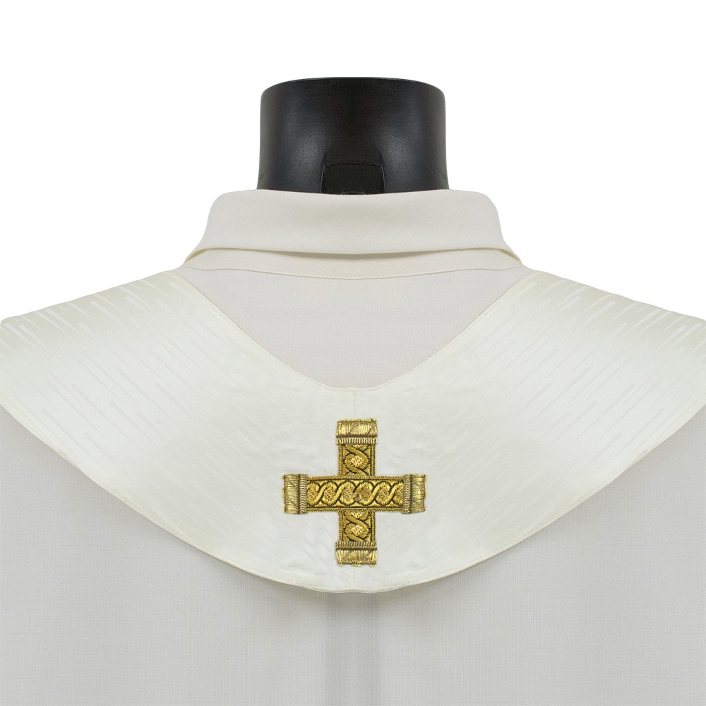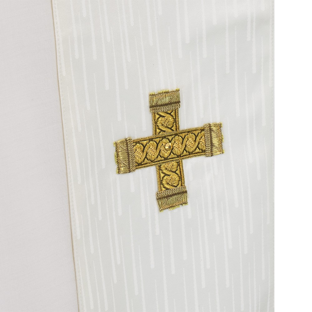 Casula sacerdotale arricchita da un elegante stolone in raso misto seta e ricamata a mano in oro. Raffinatezza e qualità Made in Italy.