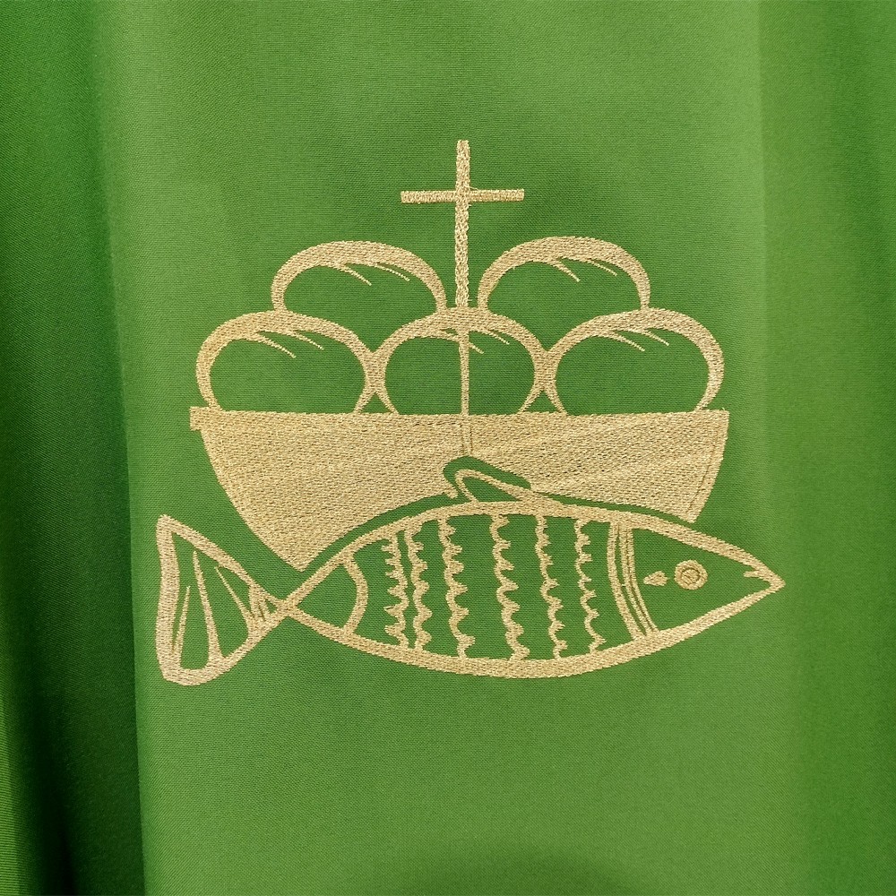 Il paramento si presenta con ricamo pane e pesci sul fronte, mentre sul retro due croci stilizzate sovrapposte, eseguite accuratamente a macchina con telai di alta precisione.