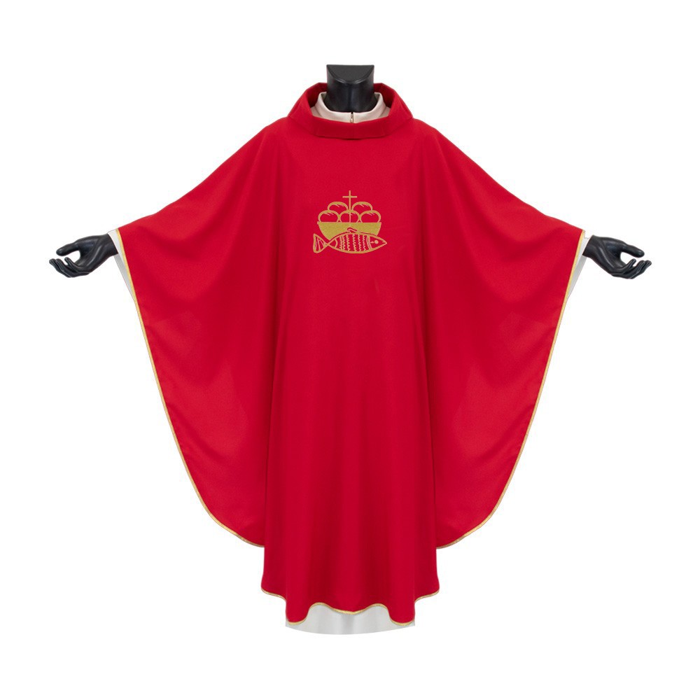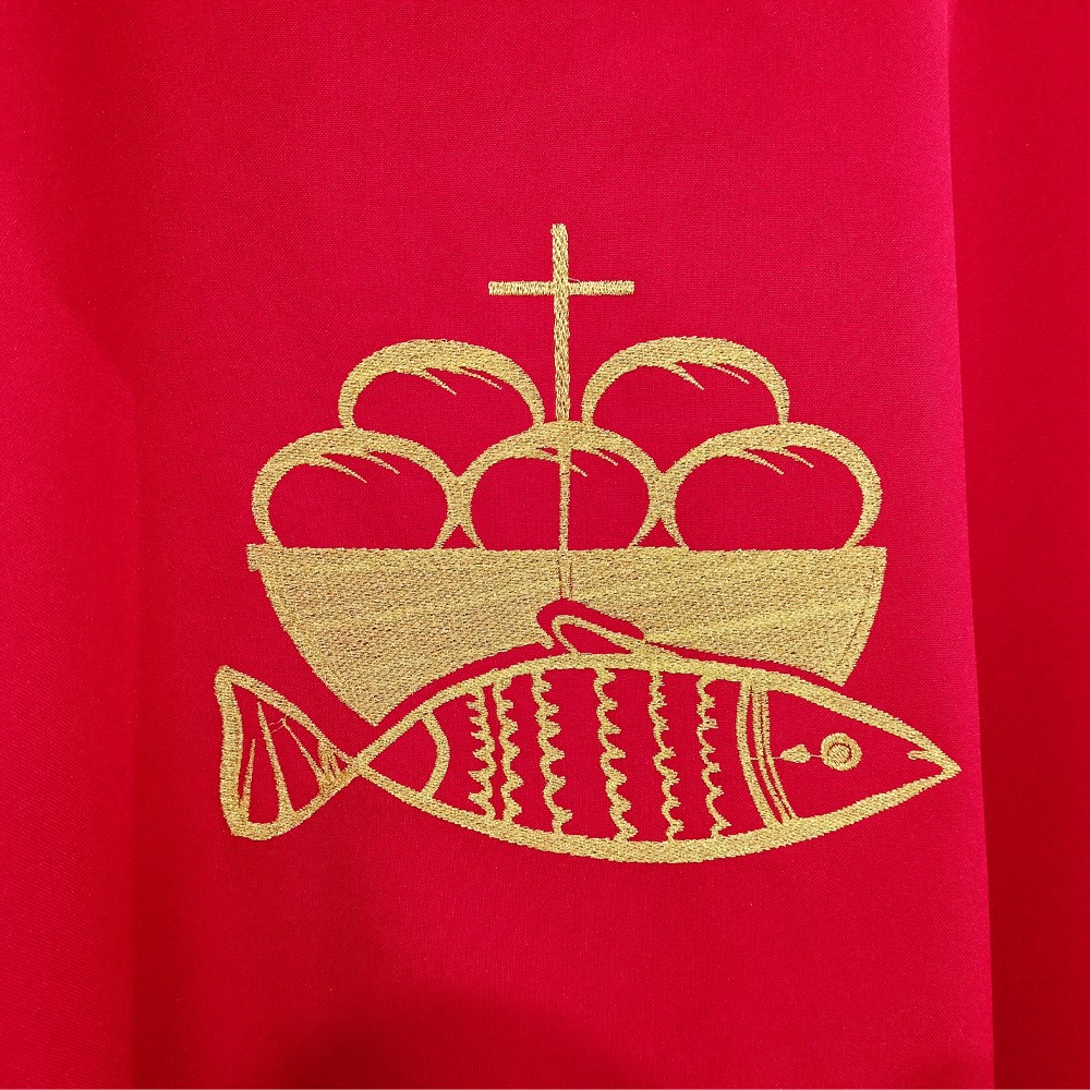 Il paramento si presenta con ricamo pane e pesci sul fronte, mentre sul retro due croci stilizzate sovrapposte, eseguite accuratamente a macchina con telai di alta precisione.