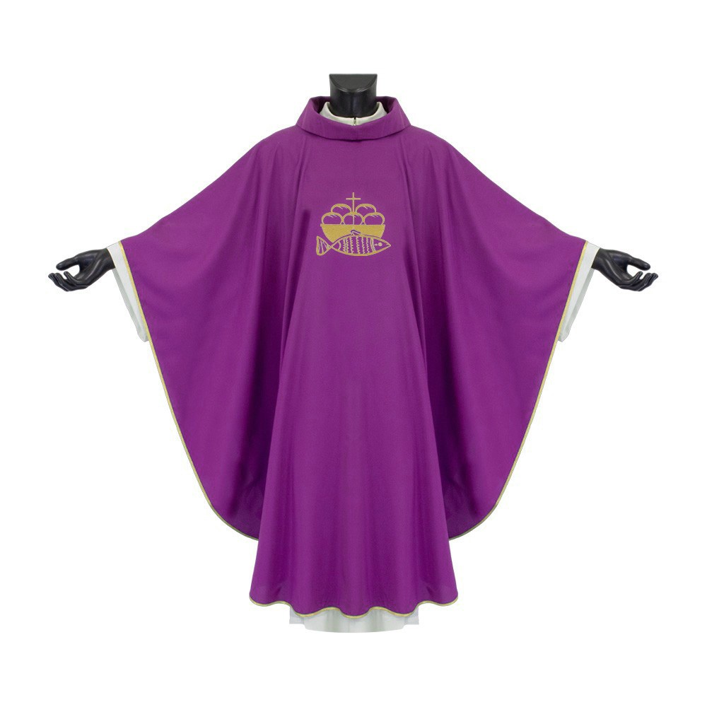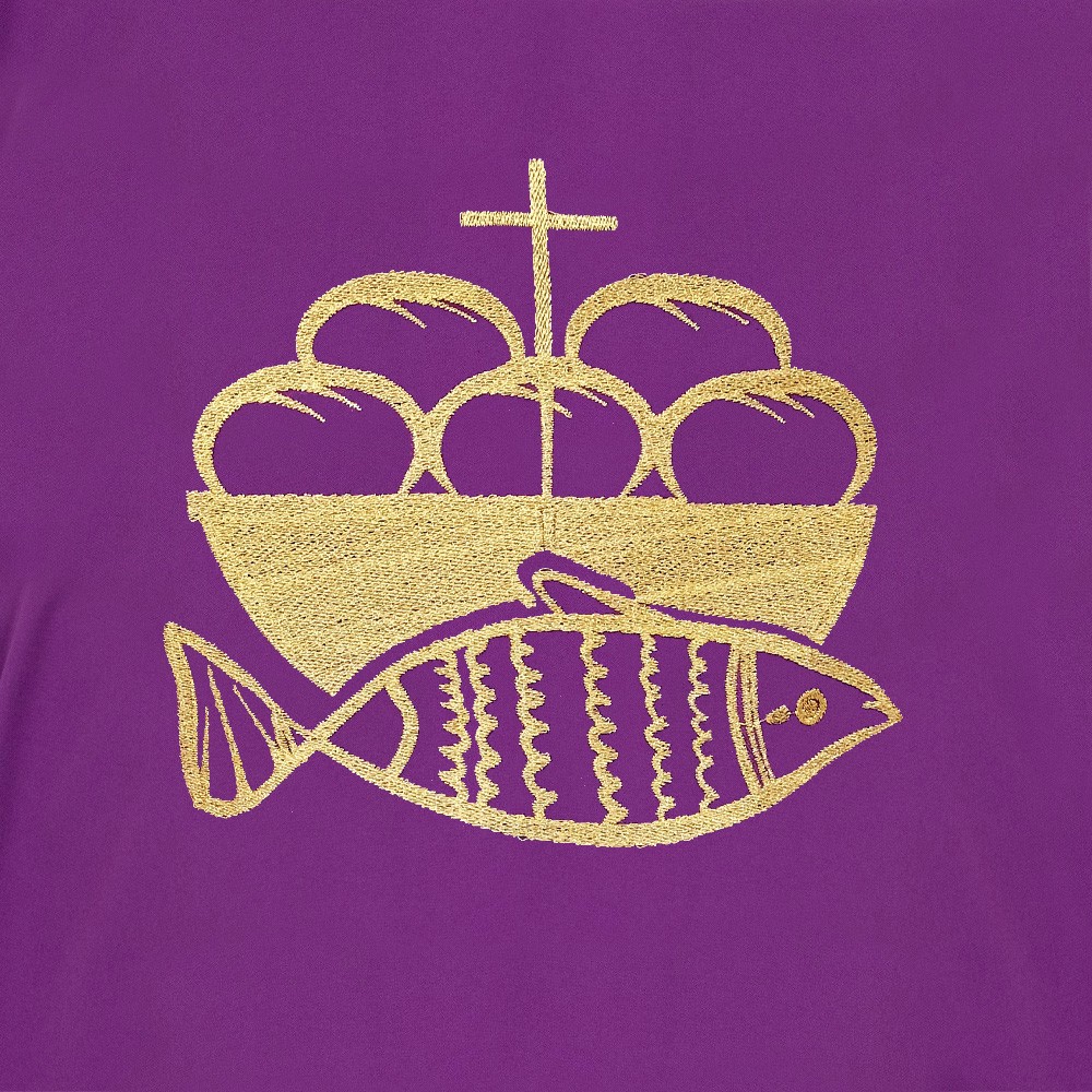 Il paramento si presenta con ricamo pane e pesci sul fronte, mentre sul retro due croci stilizzate sovrapposte, eseguite accuratamente a macchina con telai di alta precisione.
